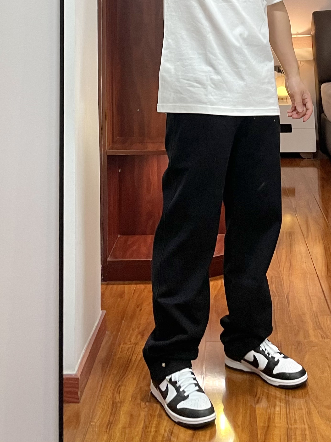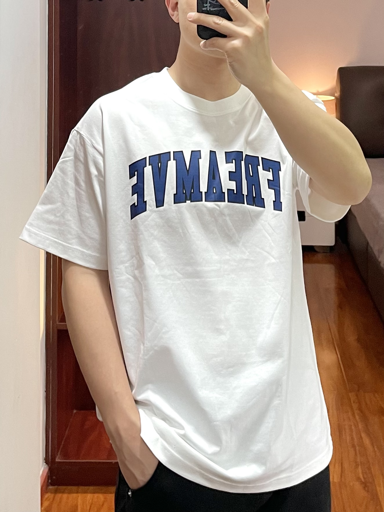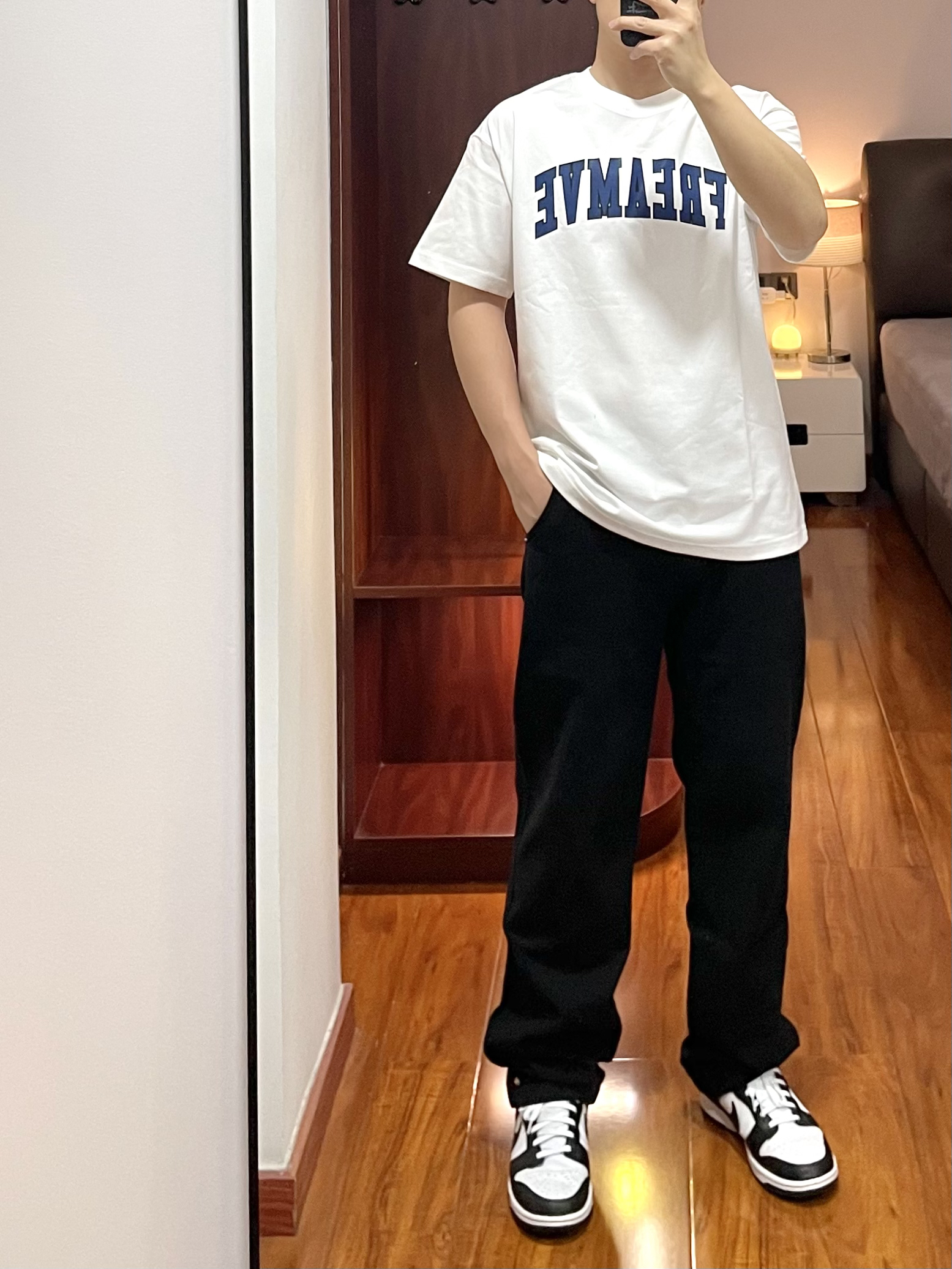 👕:freamve T恤-L 白色T恤重度爱好者,字母印花的T恤风格很美式,版型宽松蓝色字母还更显白。 👖:Wildstory 牛仔裤 黑色牛仔裤版型直筒宽身,面料厚实四季可穿,黑色裤子显瘦穿起来也显腿直。 👟:Nike dunk 上身白色,下身黑色跟这鞋子的配色好搭。