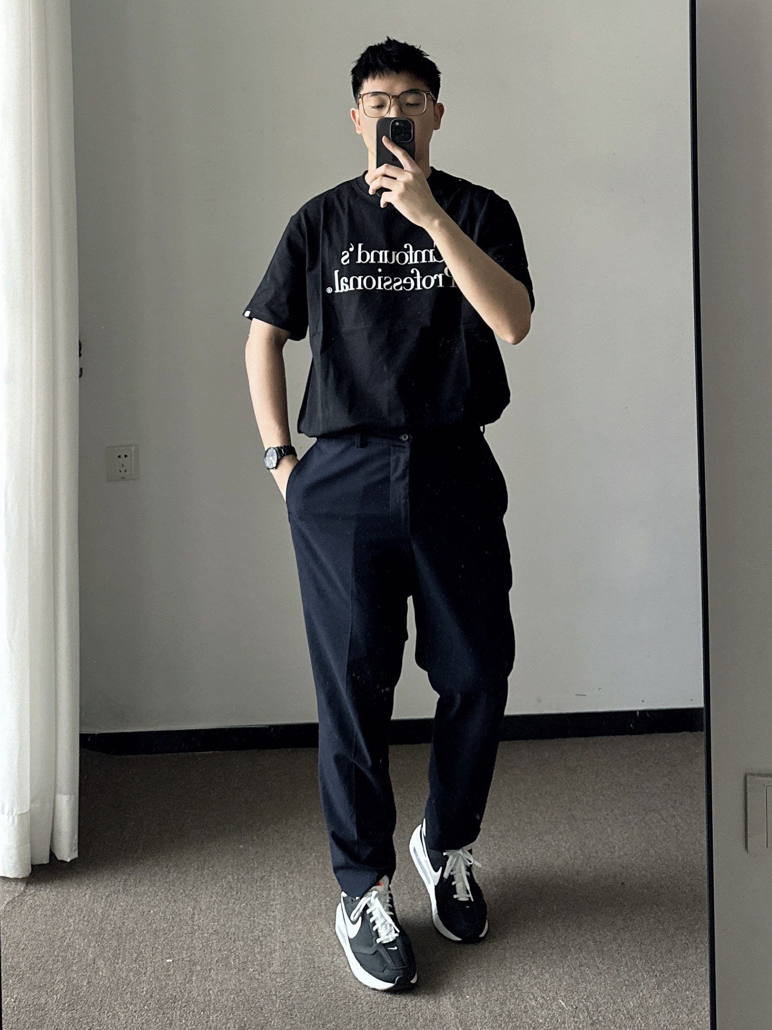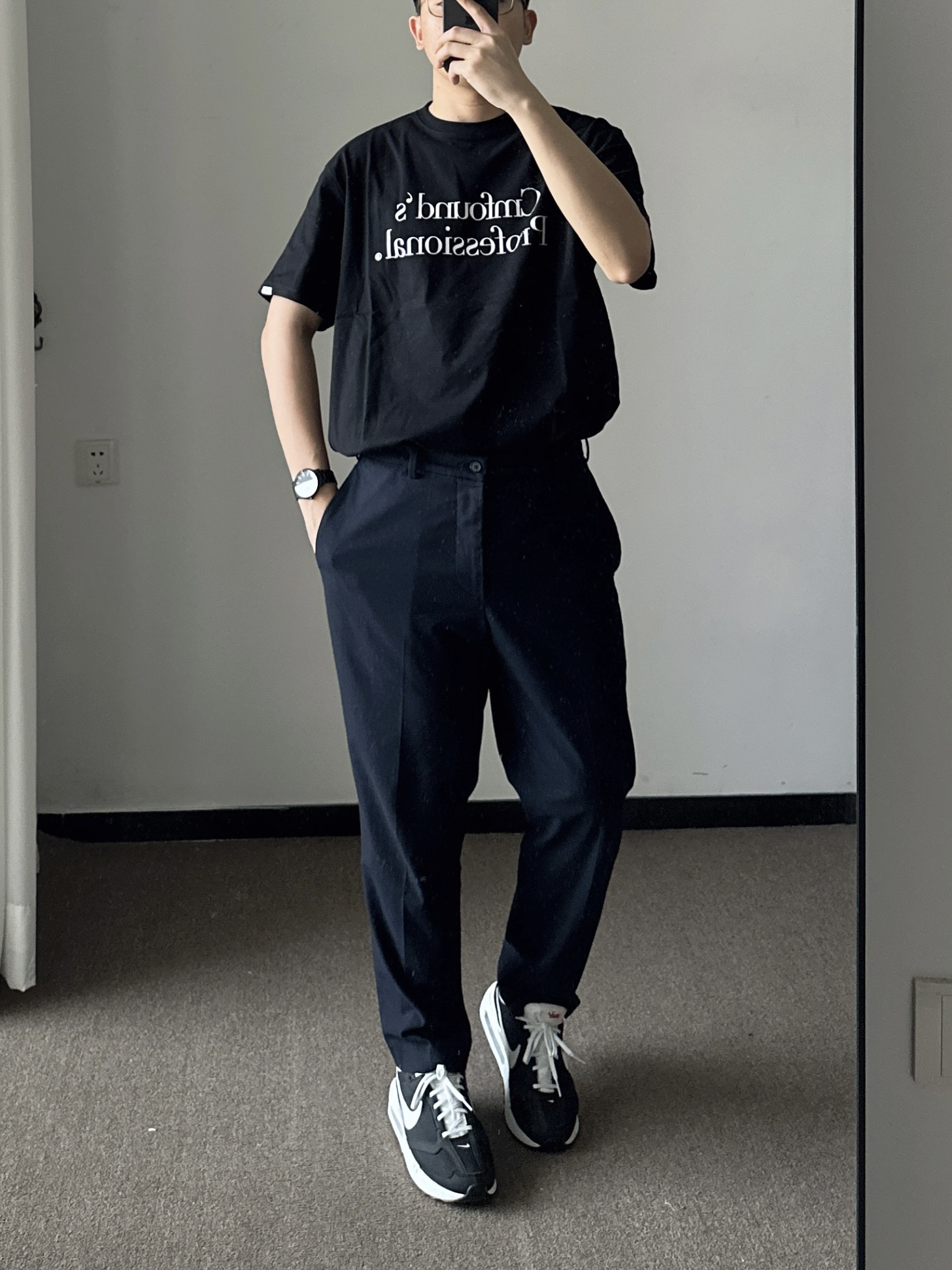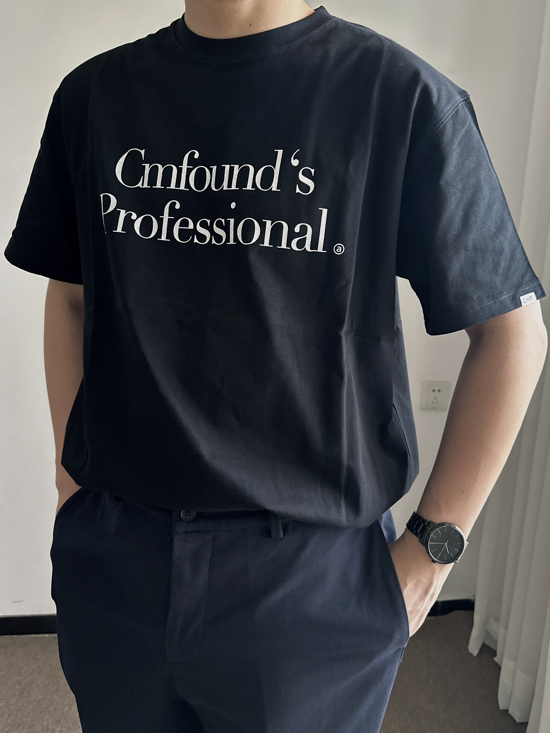 素人也能好看系列~ 174cm/65kg 🧥- 深色系的简约字母logo,两个百搭。 👖- 藏青色的微锥直筒西裤过渡一下吧! 👟- 奥利奥配色慢跑鞋,多少来点学院风。 ⌚- 极简风的表盘,经典耐看。全黑配色,金属质感,通勤百搭风。