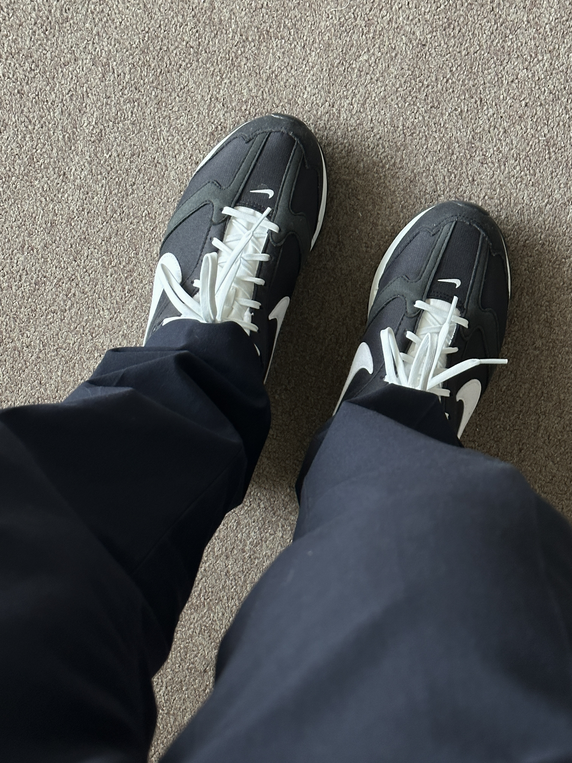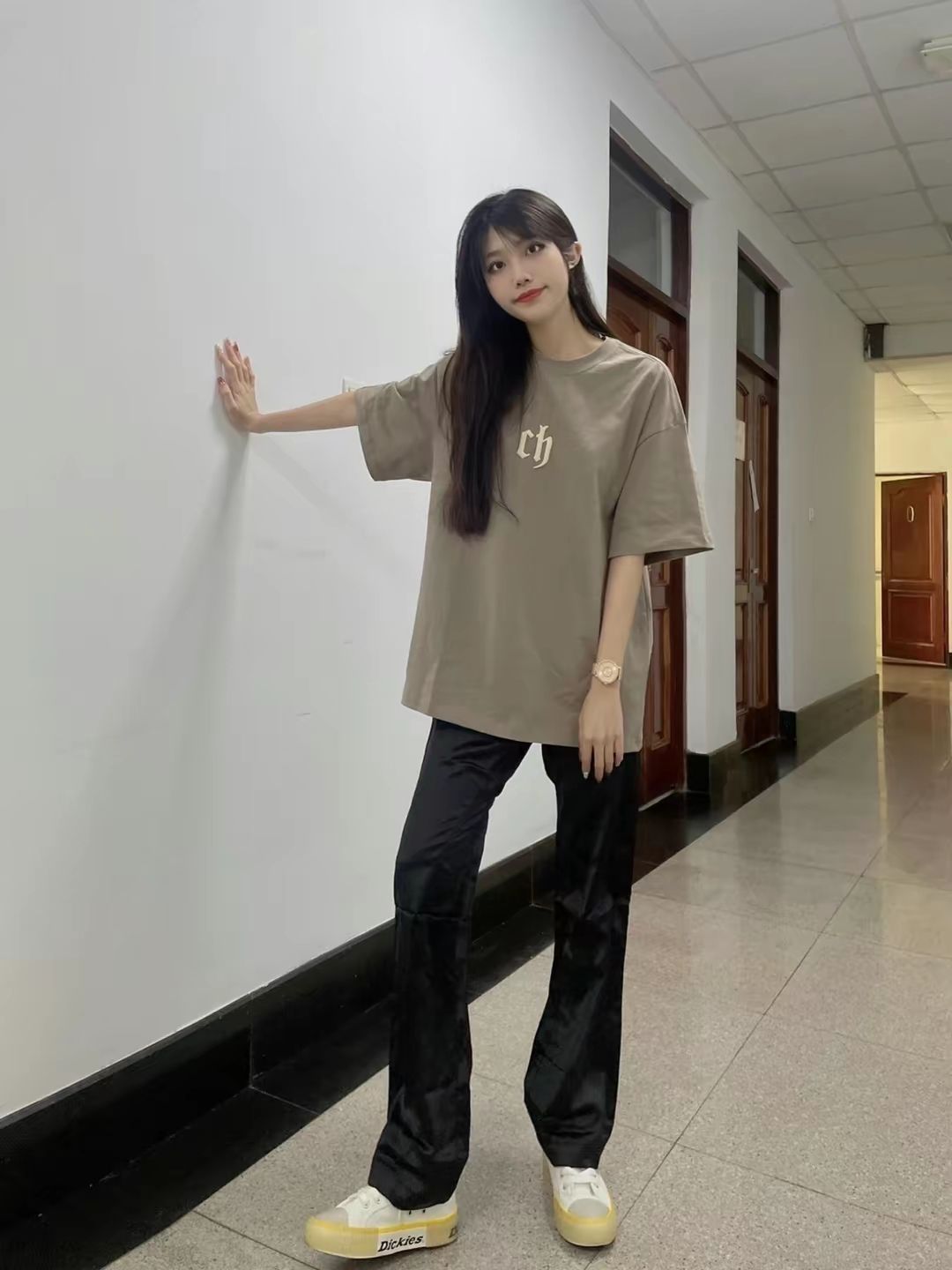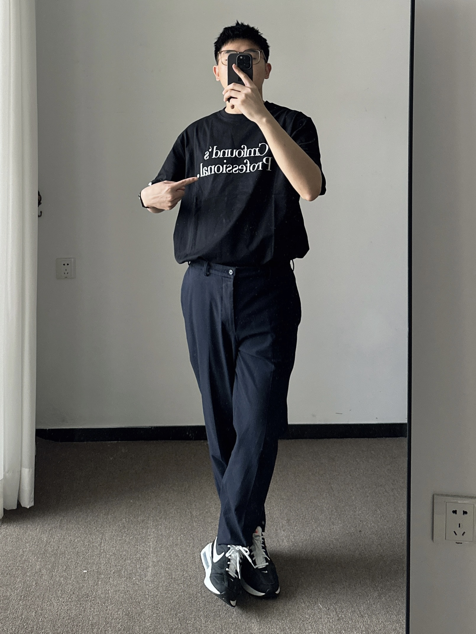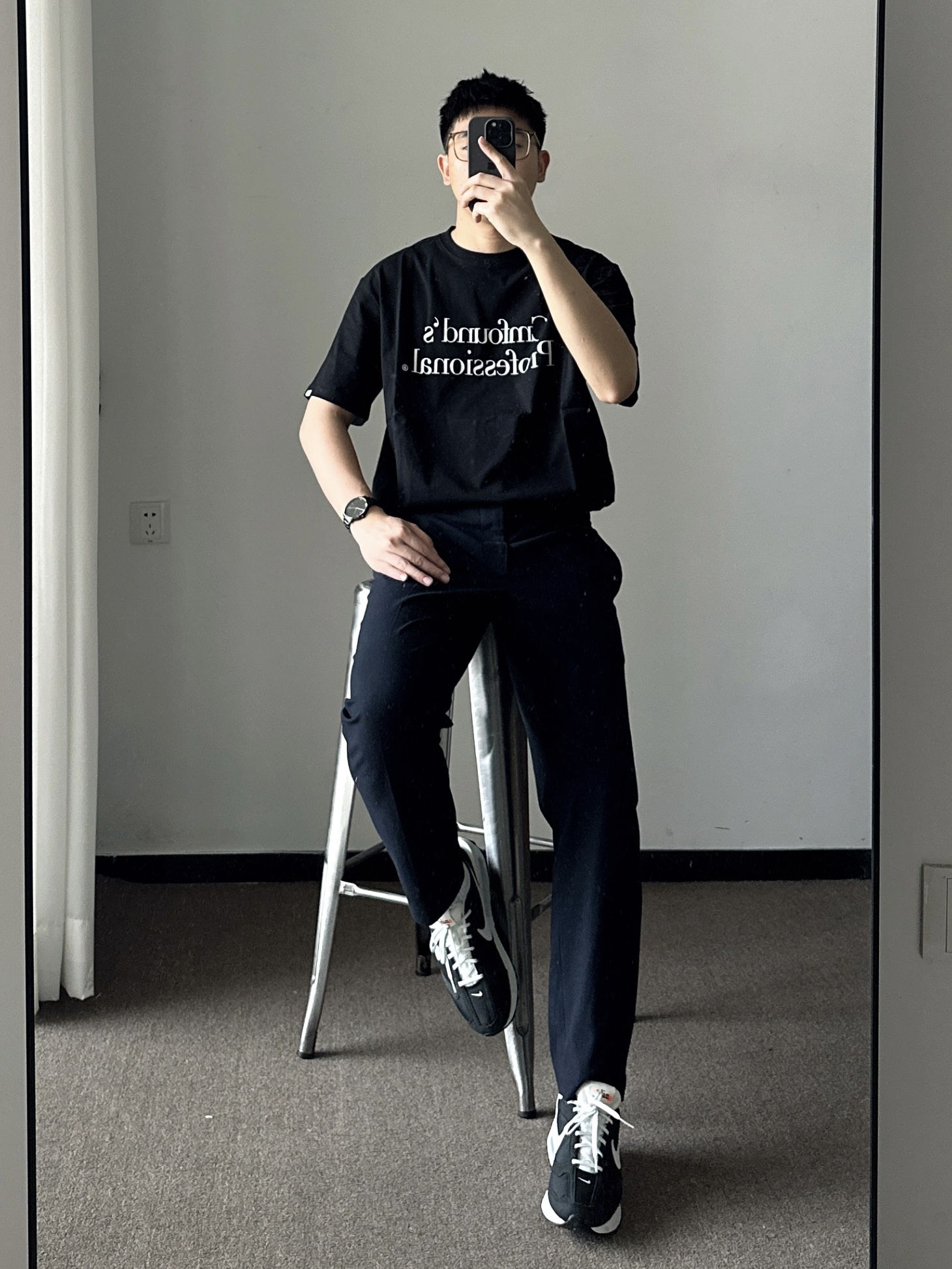 素人也能好看系列~ 174cm/65kg 🧥- 深色系的简约字母logo,两个百搭。 👖- 藏青色的微锥直筒西裤过渡一下吧! 👟- 奥利奥配色慢跑鞋,多少来点学院风。 ⌚- 极简风的表盘,经典耐看。全黑配色,金属质感,通勤百搭风。