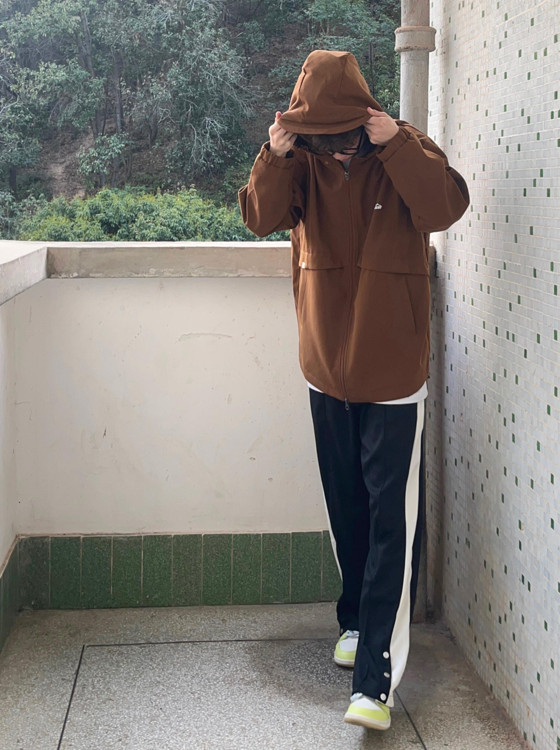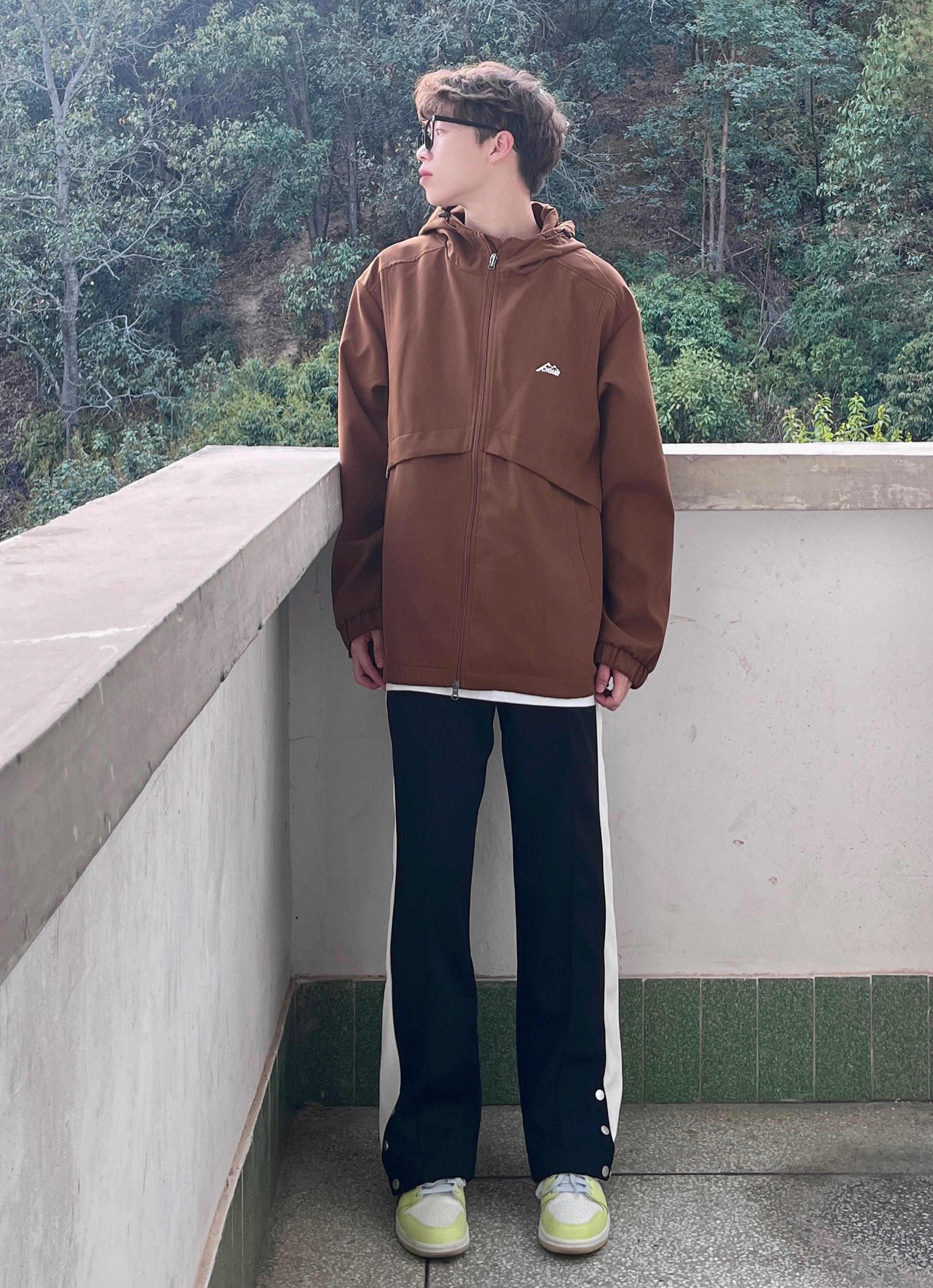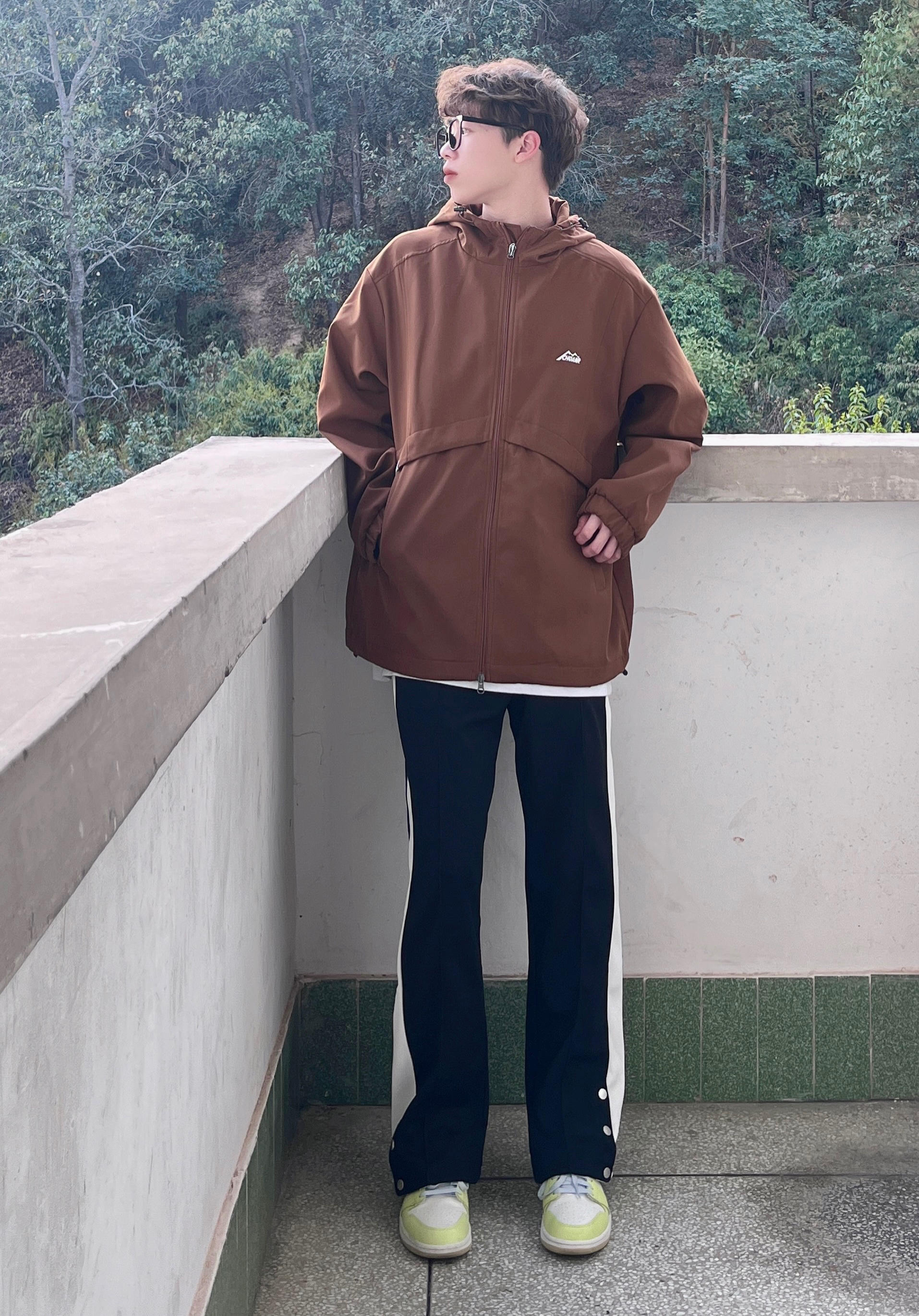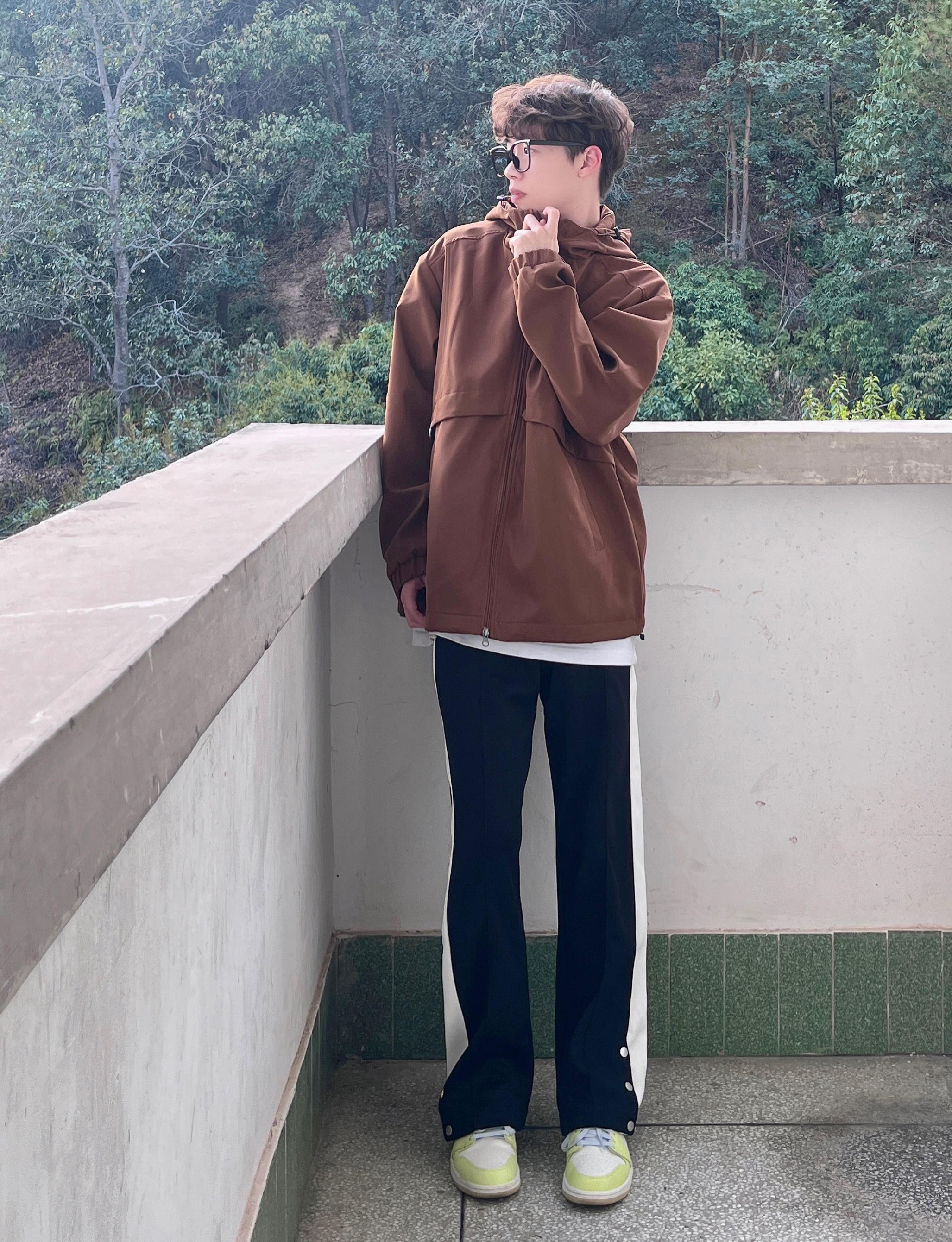 今天带来一套春季冲锋衣山系穿搭‼️ : 衣服是浅咖啡色的冲锋衣 拉链抽绳设计 穿上也很宽松舒适 质量非常不错 防风也防水 很适合户外活动🧗 - 裤子是黑色的休闲卫裤 裤脚处的排扣设计很有特点 版型宽松显腿型 面料和弹性都很不错 / 一套搭配下来 无论是冲锋外套还是排扣卫裤 都非常适合运动 你pick到了吗