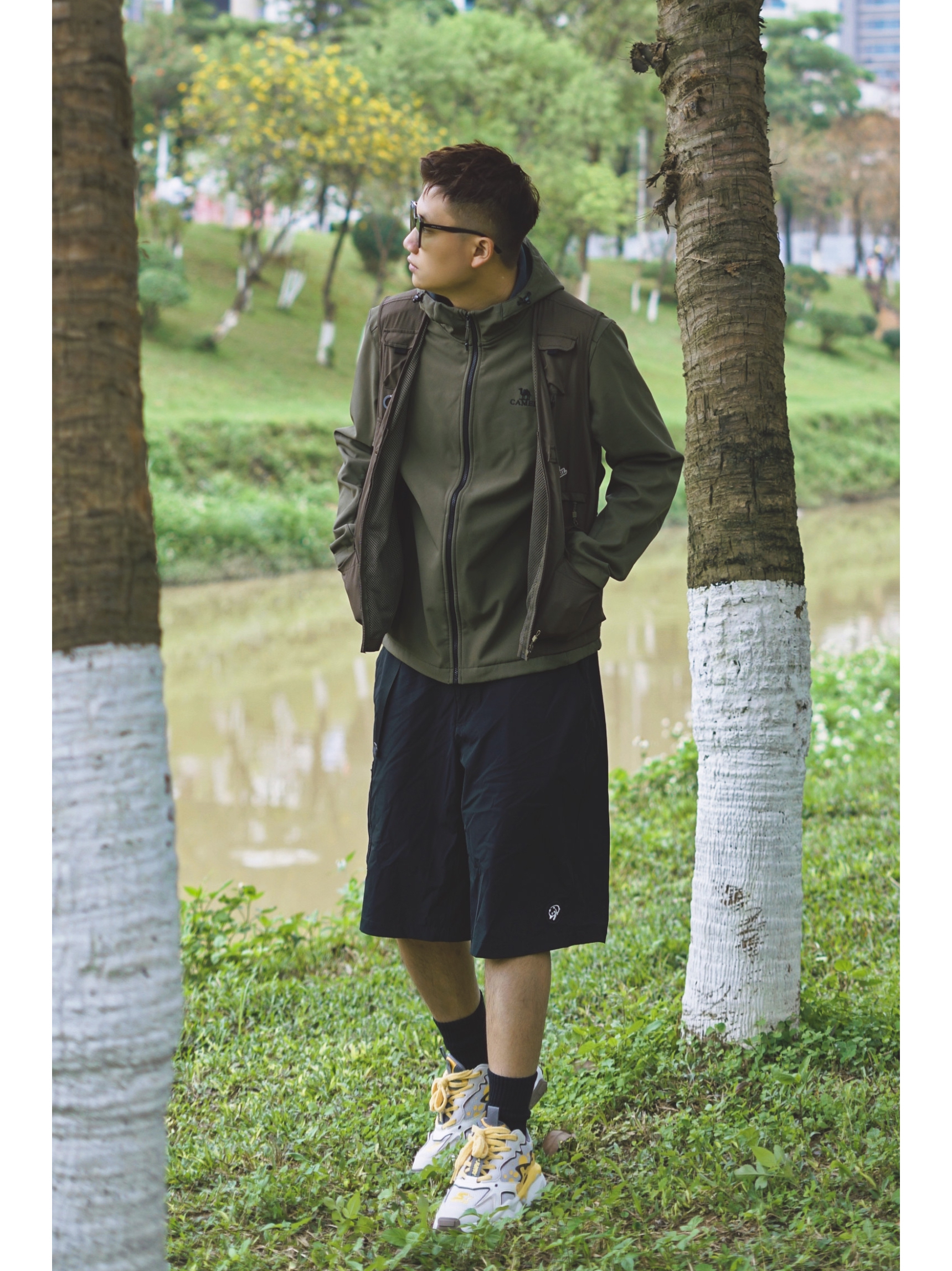 春夏的天气最舒服,加上户外郁郁葱葱 很适合去到户外活动,徒步呀露营呀~!都很不错 军绿色的单品估计就是为了户外活动的 而且很百搭,怎样都很好看~_🚶🏻 修身的冲锋衣,内里的摇粒绒穿着舒服 搭配网眼马甲和机能短裤~ 鞋子选择了近期入手的starter和tom&Jerry联名奶酪老爹鞋,童年回忆啊,而且整个鞋子脚感舒适,很适合户外活动 很适合活力夏天的氛围感~!