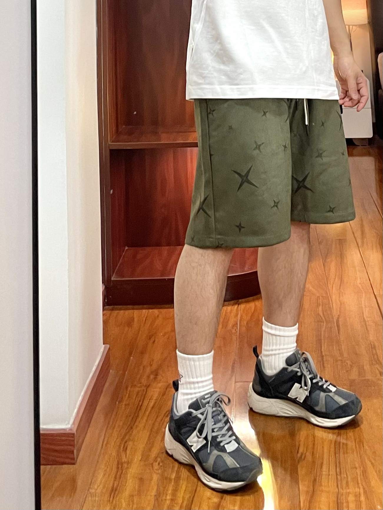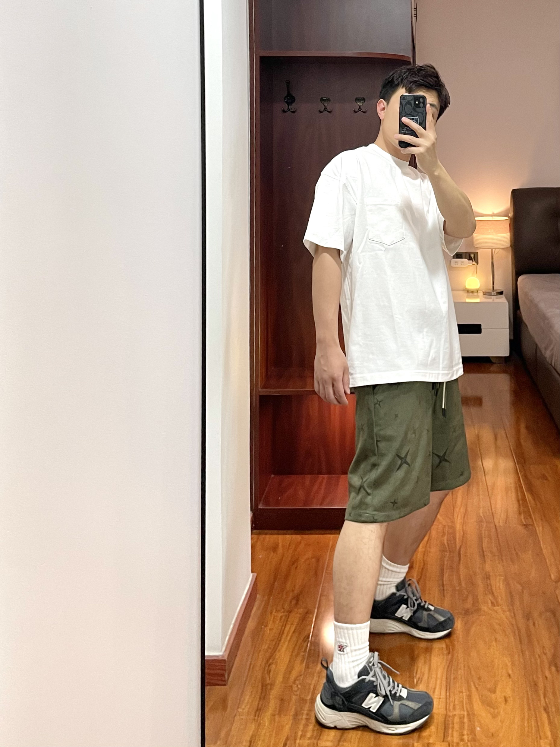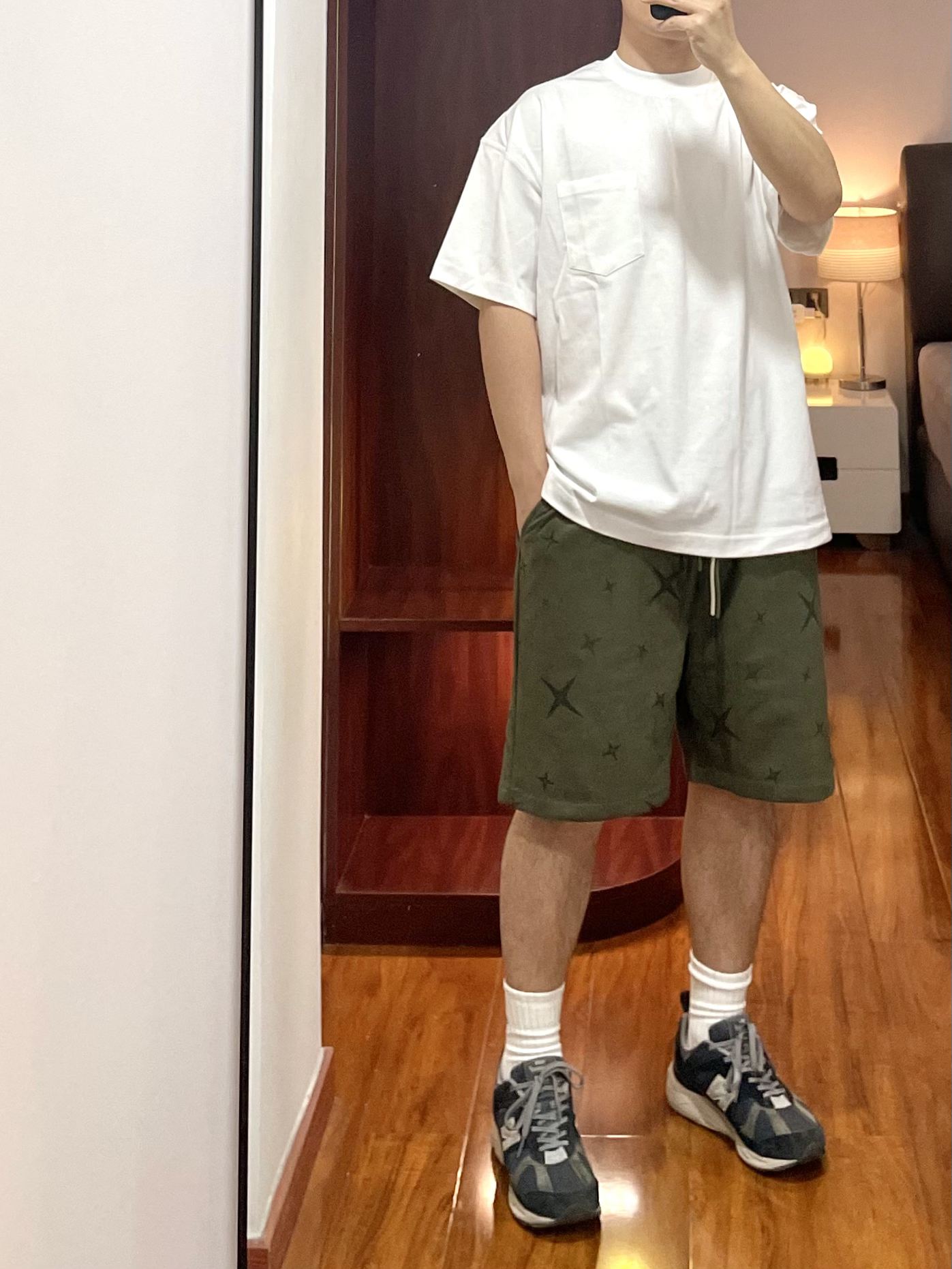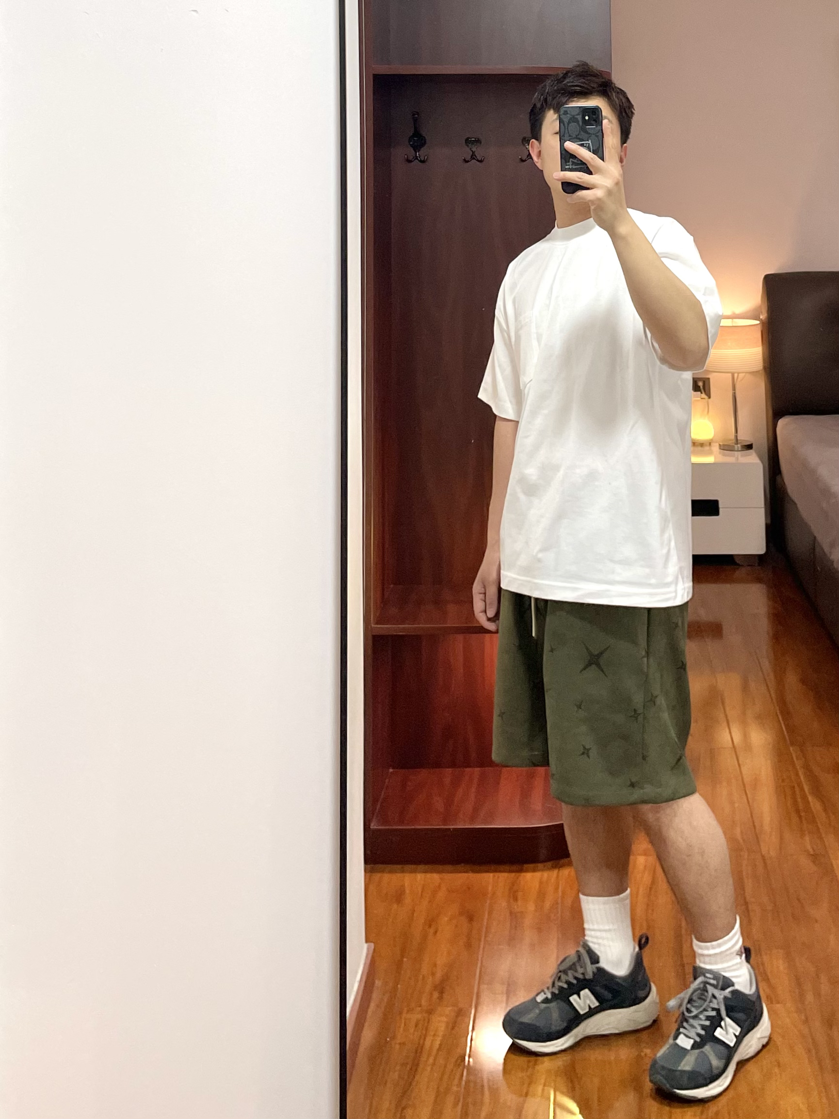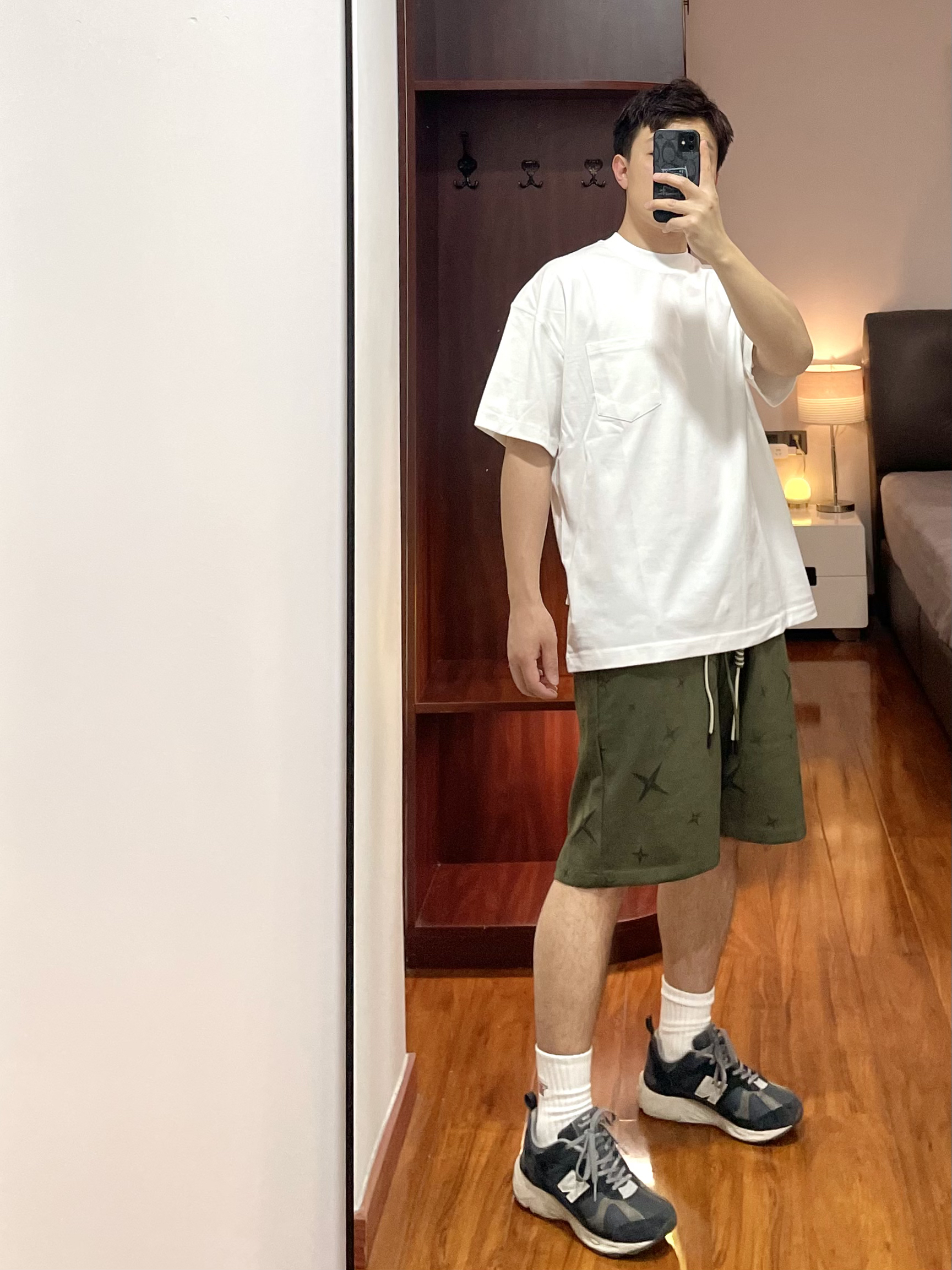 170cm/67kg 一个普通人的穿搭分享 👕:口袋T恤-M 简单基础的设计,白色干净清爽,衣服版型很oversize穿起来休闲简约,依然是喜欢的小领口。 👖:ZMOH 短裤-L 休闲宽松的短裤,运动休闲穿都合适,裤头是双抽绳裤身满文的四芒星印花还挺特别。 👟:new balance 878