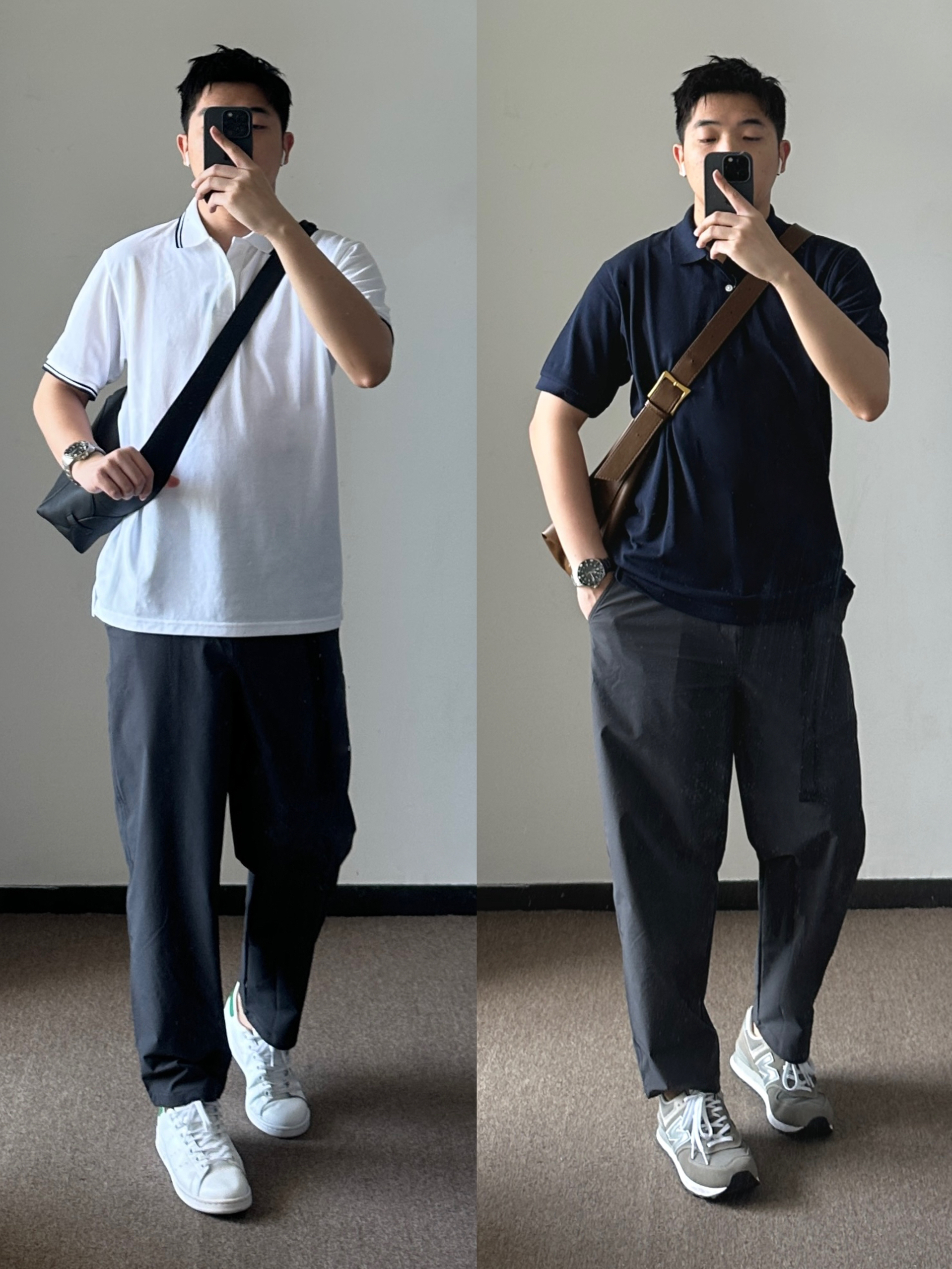 素人也能好看系列~ 174cm/65kg 🧥- 米色休闲外套,白色打底,中间用浅蓝色过渡,浅色系间用蓝色点缀。 👖- 草灰色伞兵裤,整体裤型没有太宽大,身高可以hold住,颜色比较吸引我。 👟- 复古板鞋来一双,米色+蓝色呼应一下上身吧!