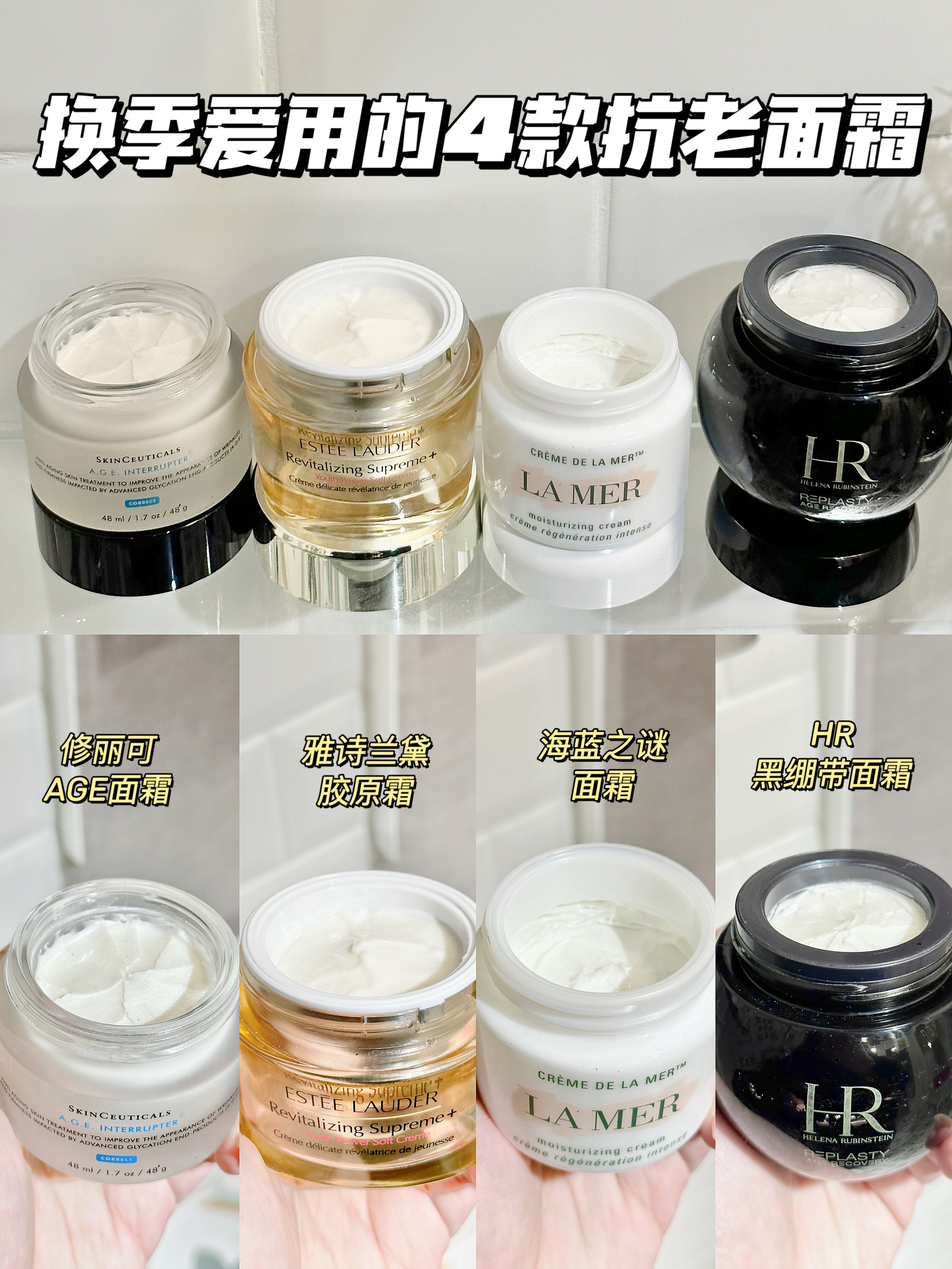 💁🏻♀️修丽可AGE面霜 绵密质地,上脸后呈哑光状态 肤感还蛮不错的,适合混油皮 主打的是抗糖抗老 去黄的感觉不错哦 坚持用一段时间小脸蛋细腻了不少呢 而且修护力也蛮不错的~ - 💁🏻♀️雅诗兰黛胶原霜 轻盈软糯质地,好吸收不粘腻 适合任何肤质,敏敏肌也能安心用 它抗老的效果还是蛮不错的 用一段时间小脸蛋明显紧致嘭弹了 法令纹细纹这些也有一些改善 完全不担心小脸蛋松垮了呢!! - 💁🏻♀️海...