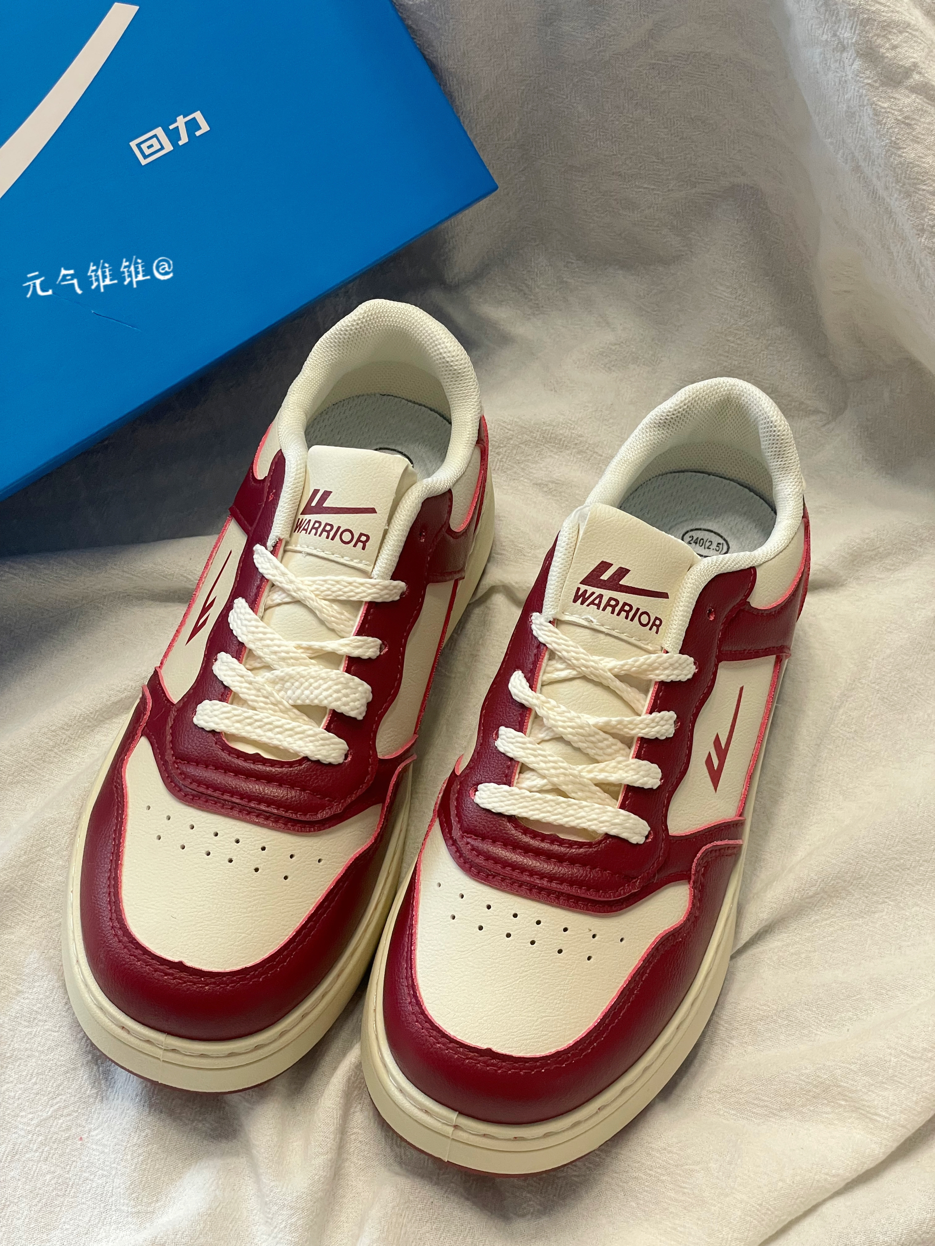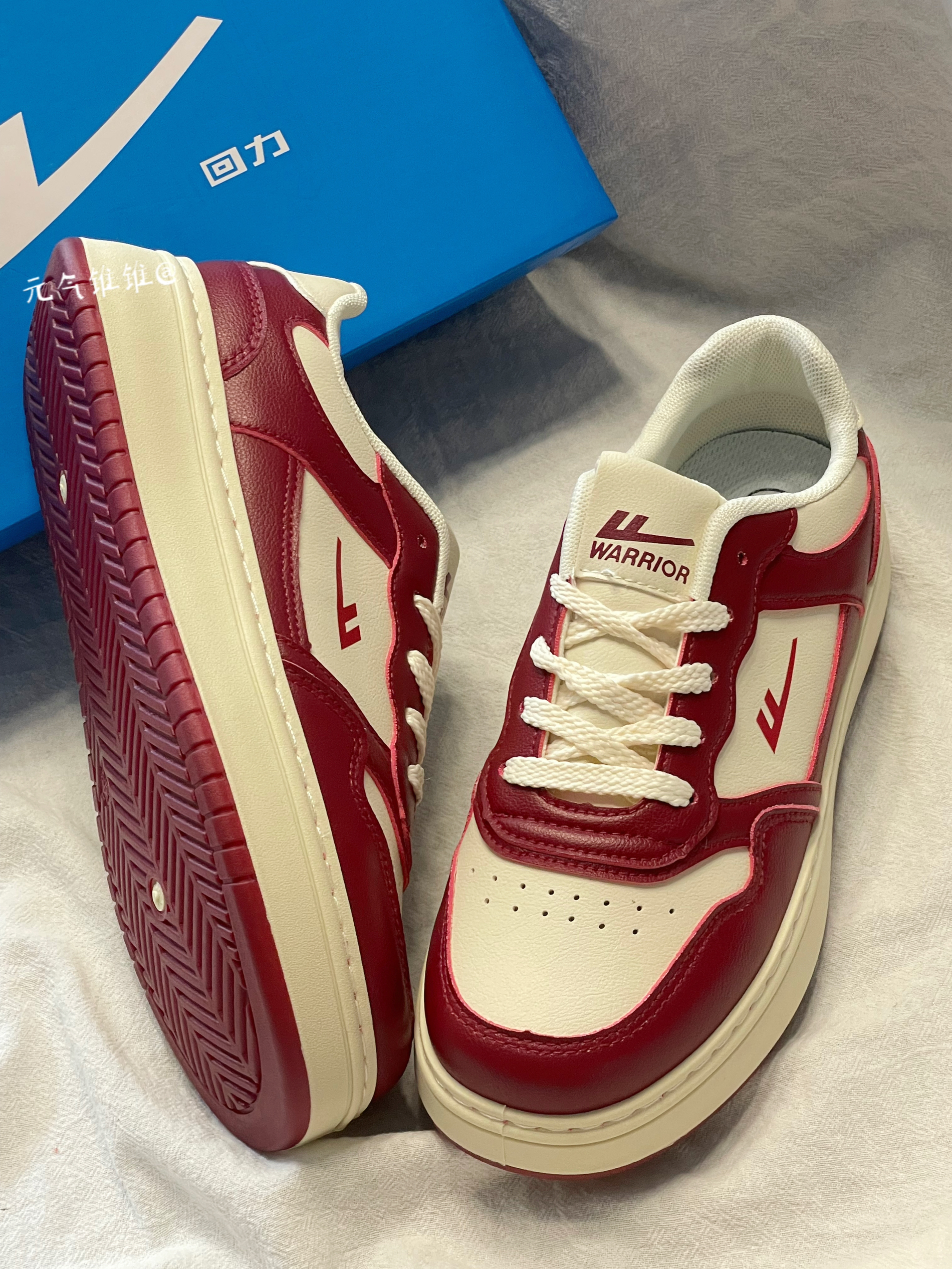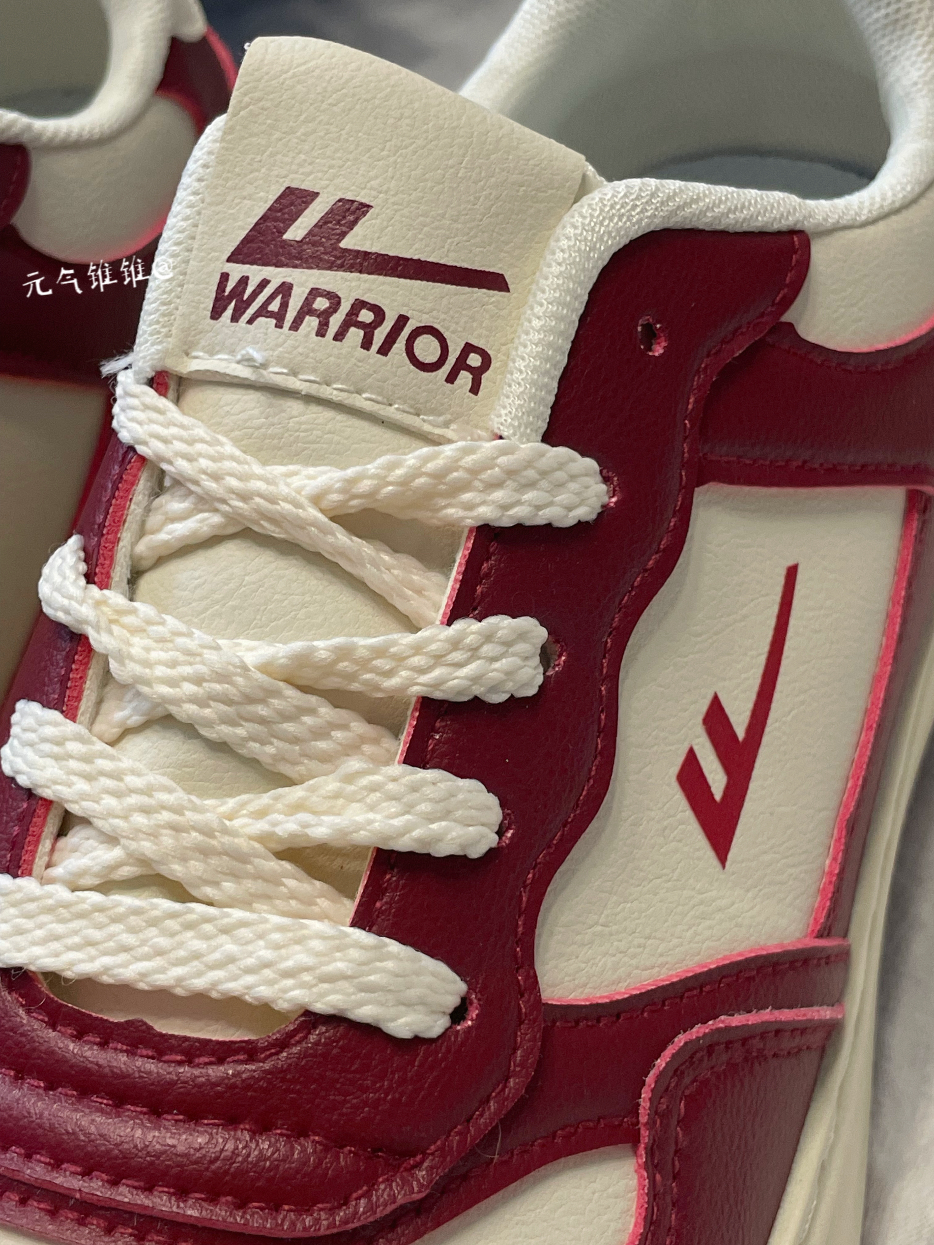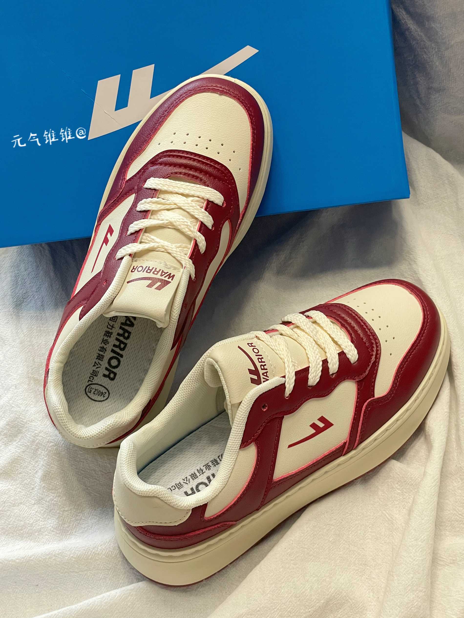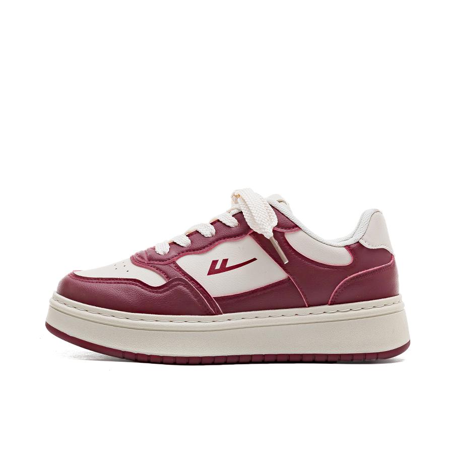 Warrior回力 复古 低帮板鞋 女款 米酒红 鞋身采用酒红和白色拼接搭配,鞋面合成革材质质感柔软,酒红色鞋框搭米白鞋面,鞋舌、外侧logo也是酒红色搭配,白色柔软内里,同时还搭配米白色厚底设计,必须得有增高!!搭配红色橡胶大底 配色比较简洁复古一点,日常也特别好搭配,还带有增高效果!