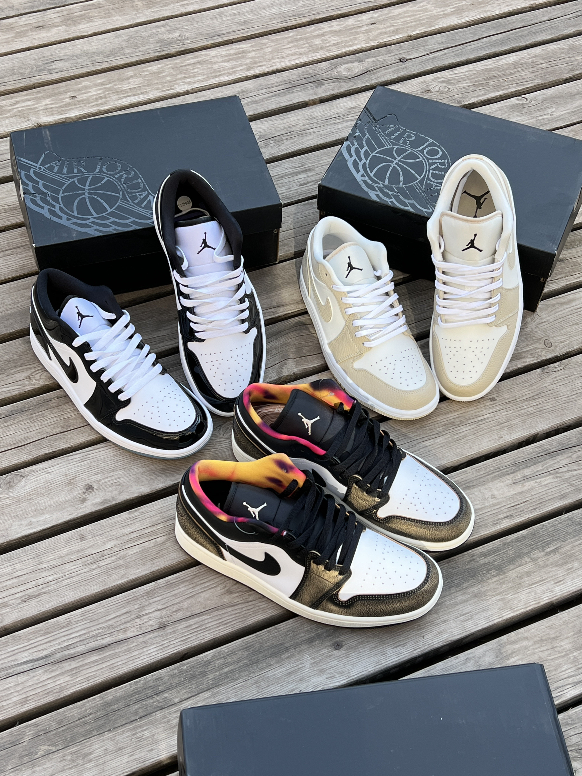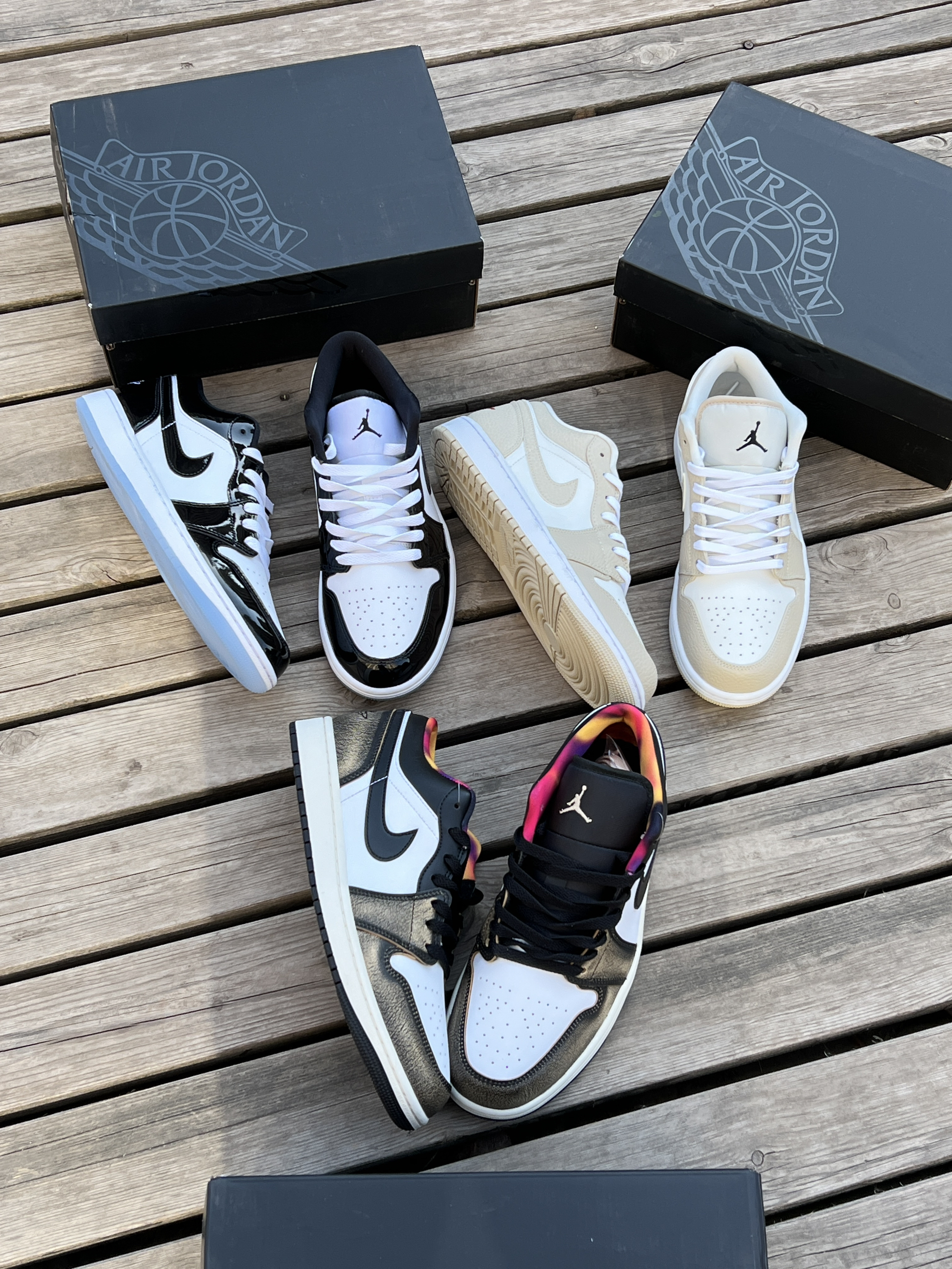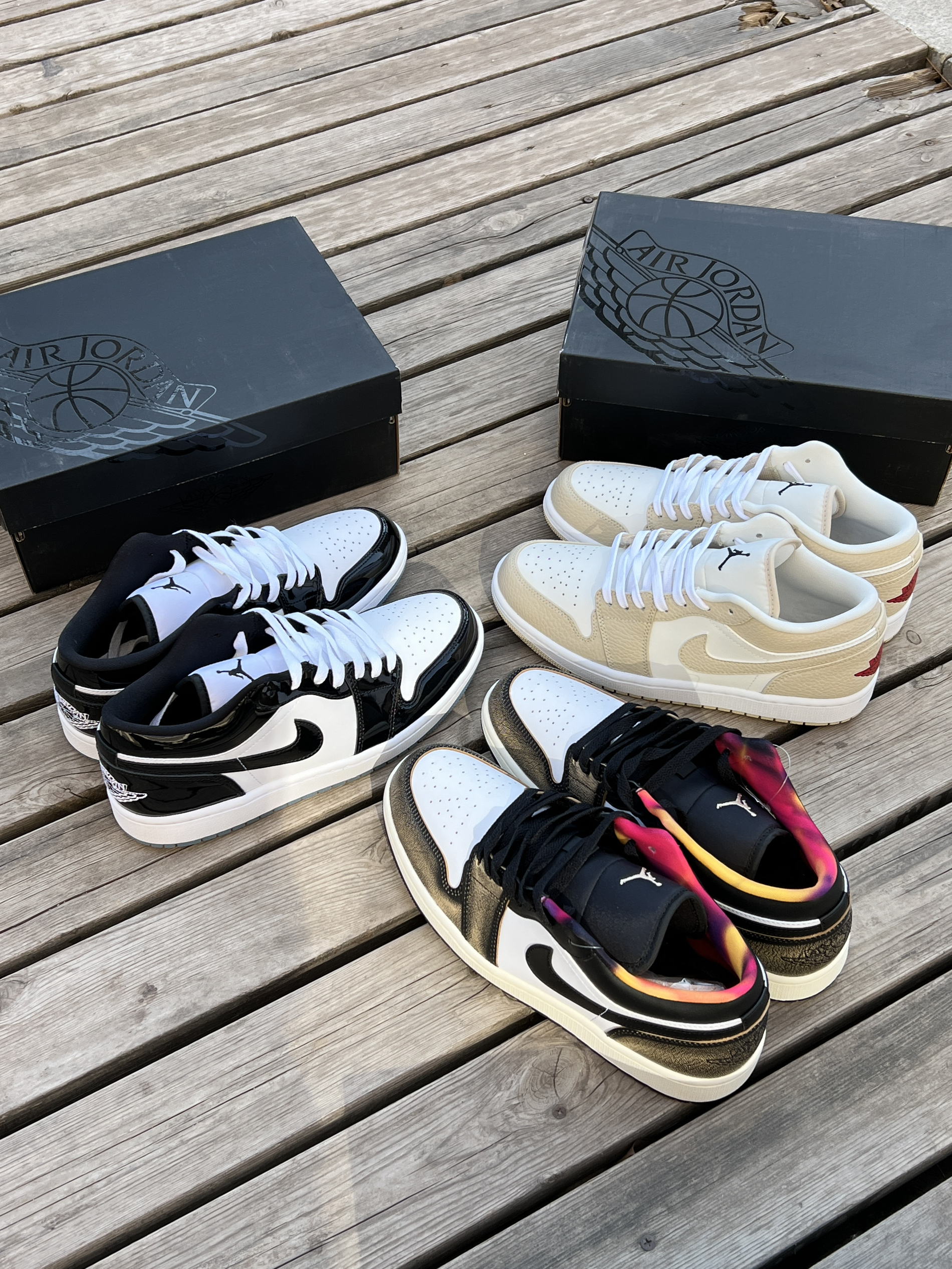 :9: Air Jordan 1 Low"concord”漆皮 防滑耐磨轻便 低帮 复古篮球鞋 白黑 婴:这双鞋子整体以黑色和白色组成,比较经典百搭的配色,鞋身采用漆皮材质,质感舒适,缺点就是容易褶皱,鞋舌有着乔丹飞人标志,后跟有着飞翼标志,鞋底采用水晶底,非常好看 壁:很好搭衣服的一款鞋子,比较适合学生 党,脚感中规中矩 盟:尺码推荐:正常尺码 2: : Jordan Air Jordan 1...