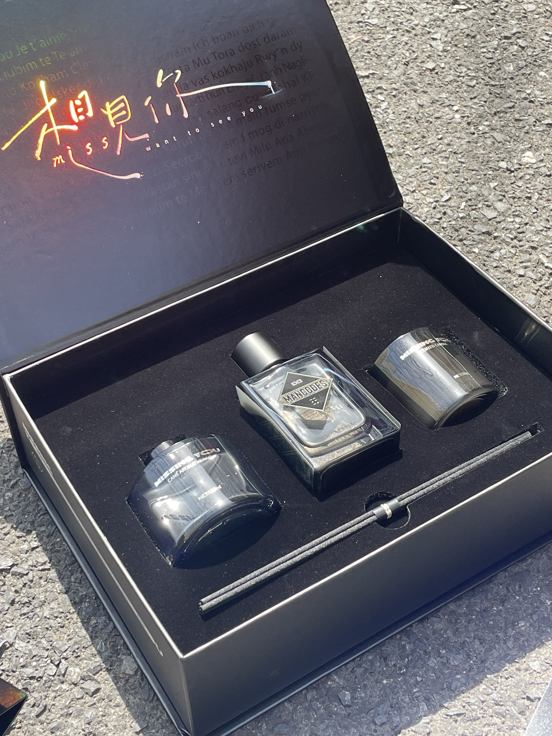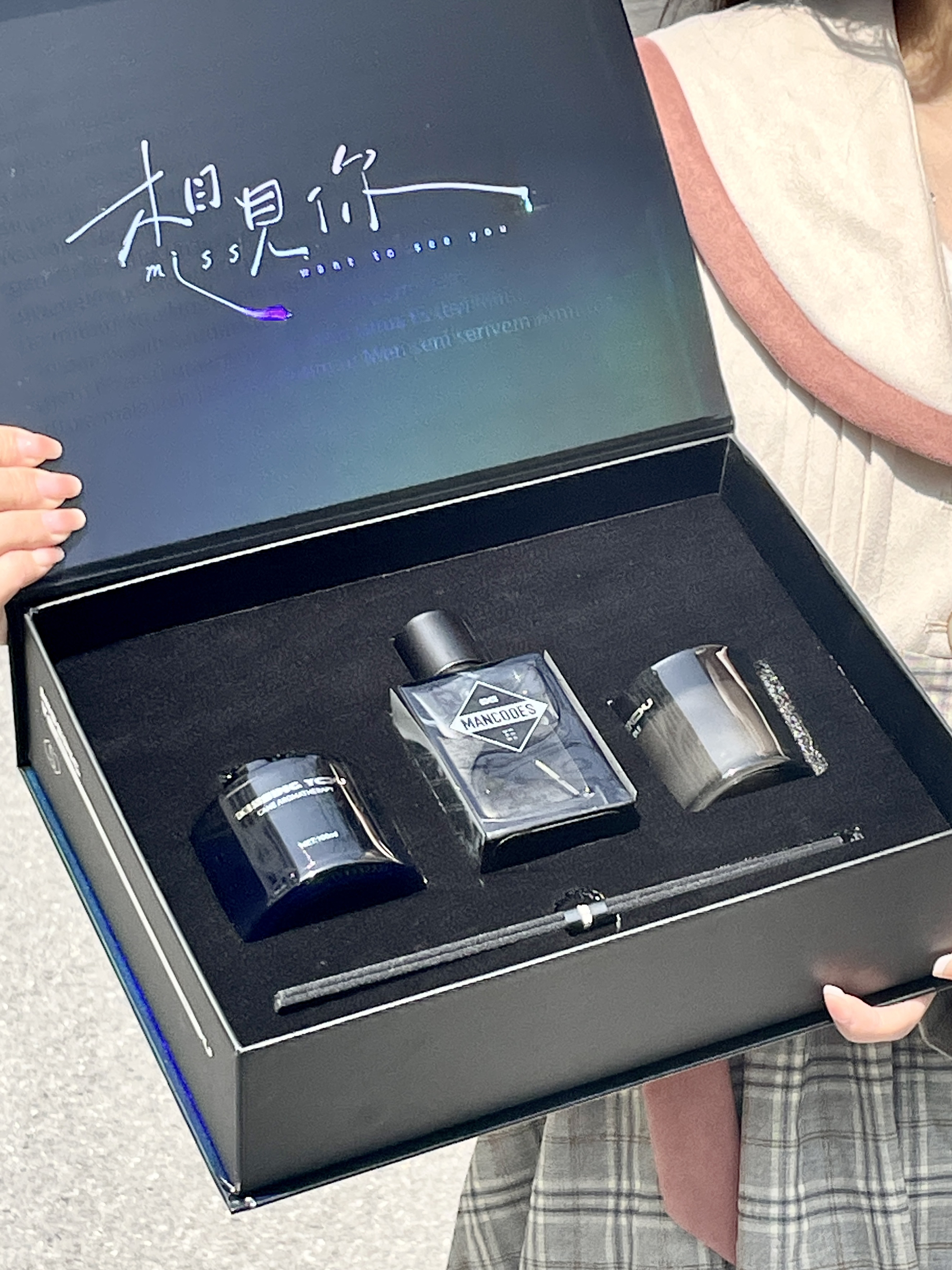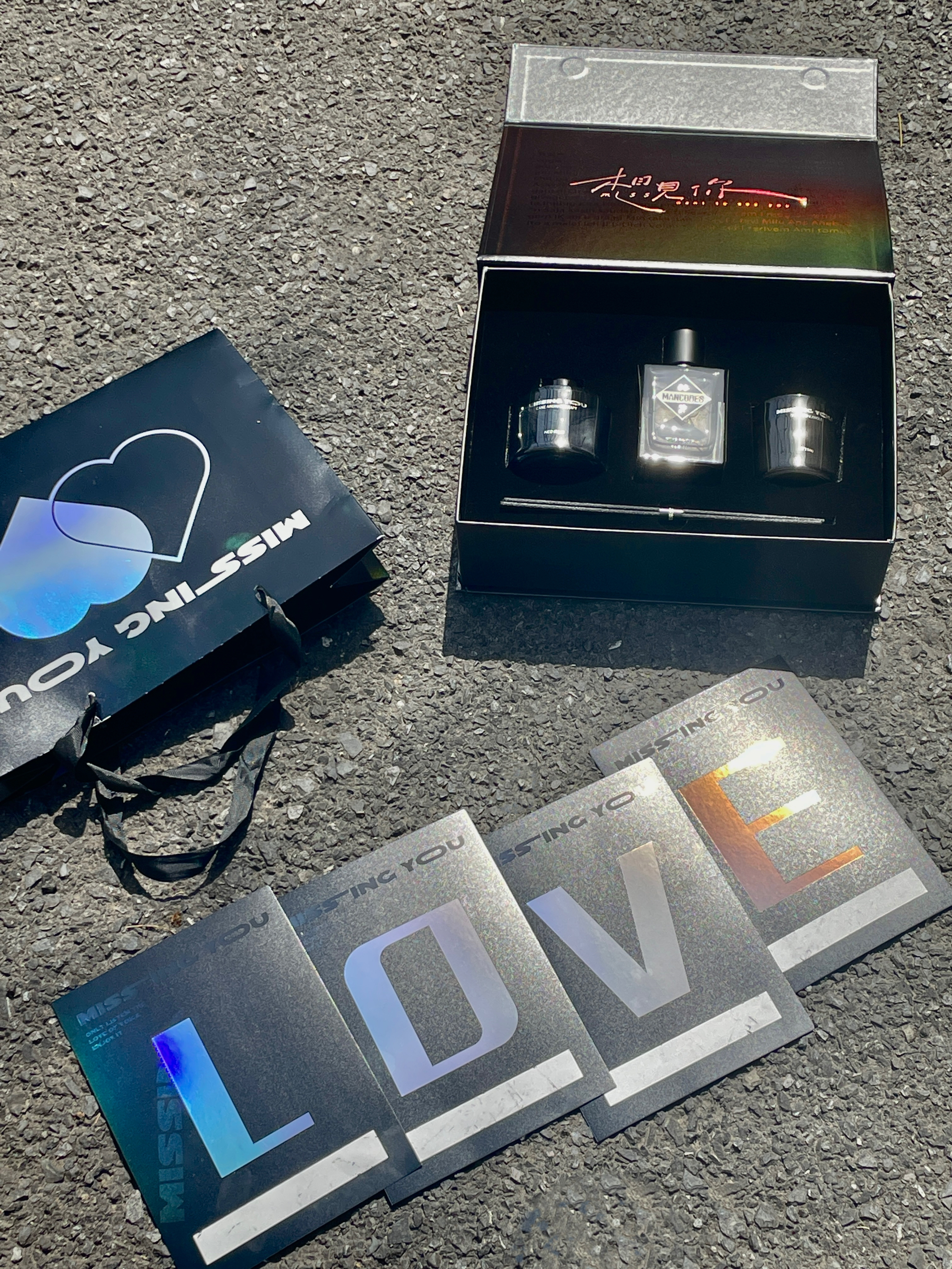因为我们是异地恋,是相隔一千公里的恋爱👫,所以我早早给男友准备了520的礼物。 真的很喜欢为爱的人准备礼物,把自己的真心一点一点拾掇给对方有种满足感~ 这次我准备的是左颜右色的miss you香氛礼盒,黑色镭射的盒子高级感满满。 里面有无火香薰➕香水➕香薰蜡烛,做了功课是男友比较喜欢的木质调🪵香,我是一个不太爱表达的人,那个蜡烛融化掉还会情话浮现,希望男友能明白我藏在心底的爱意。