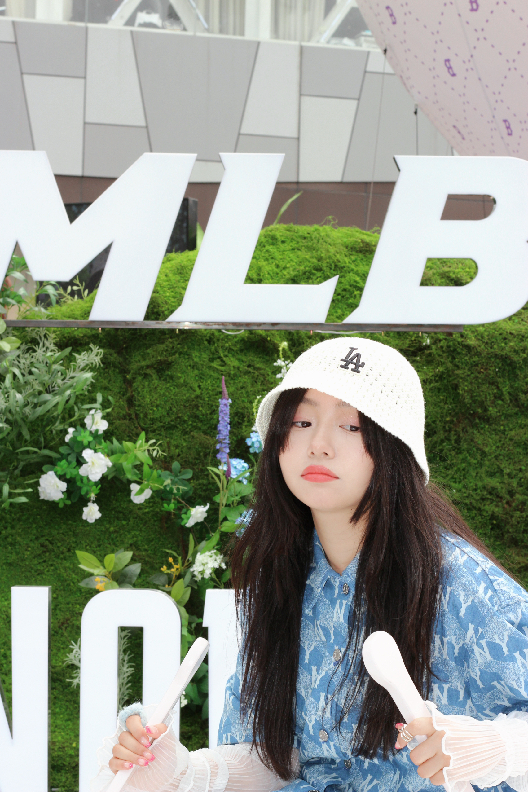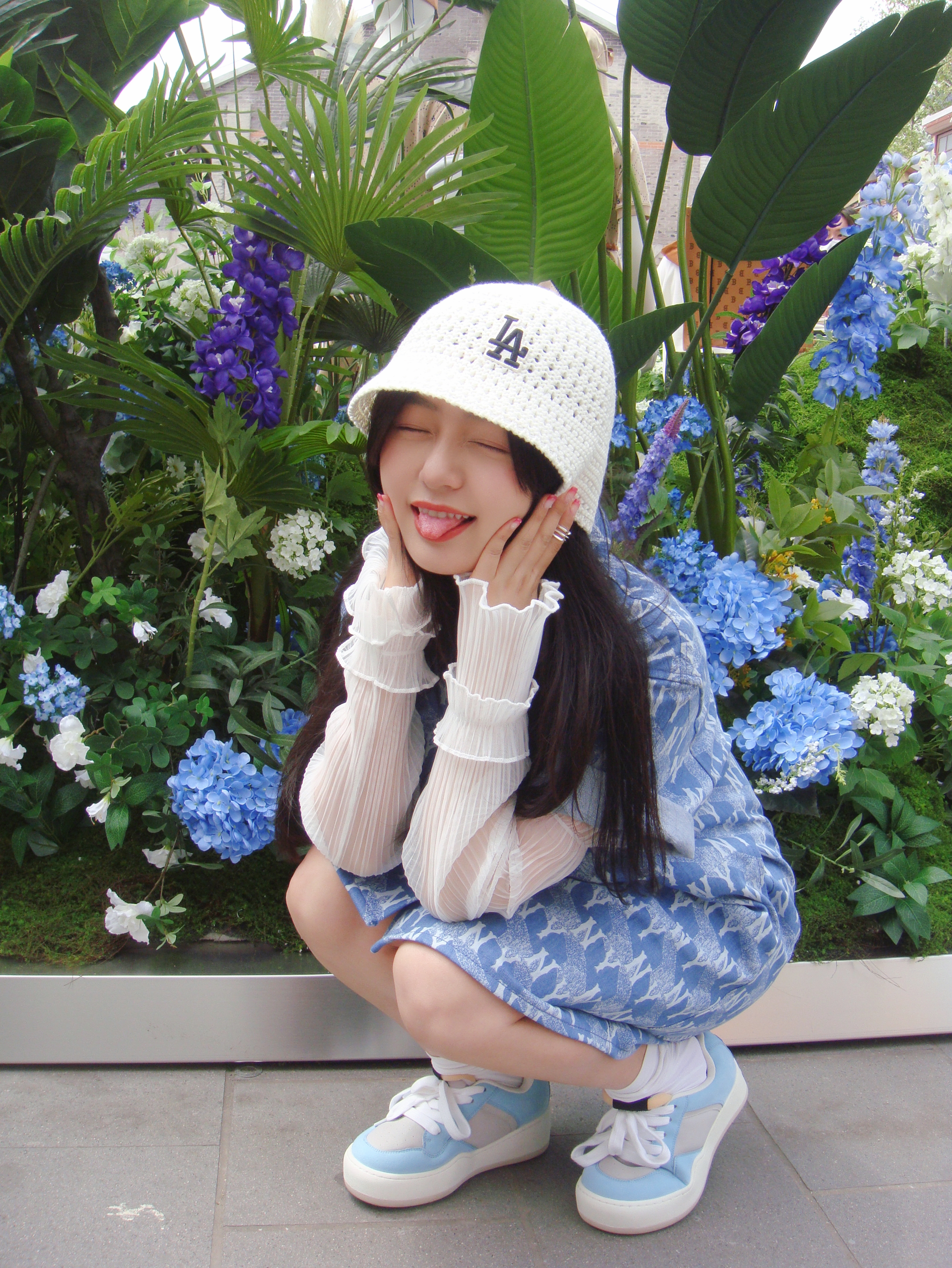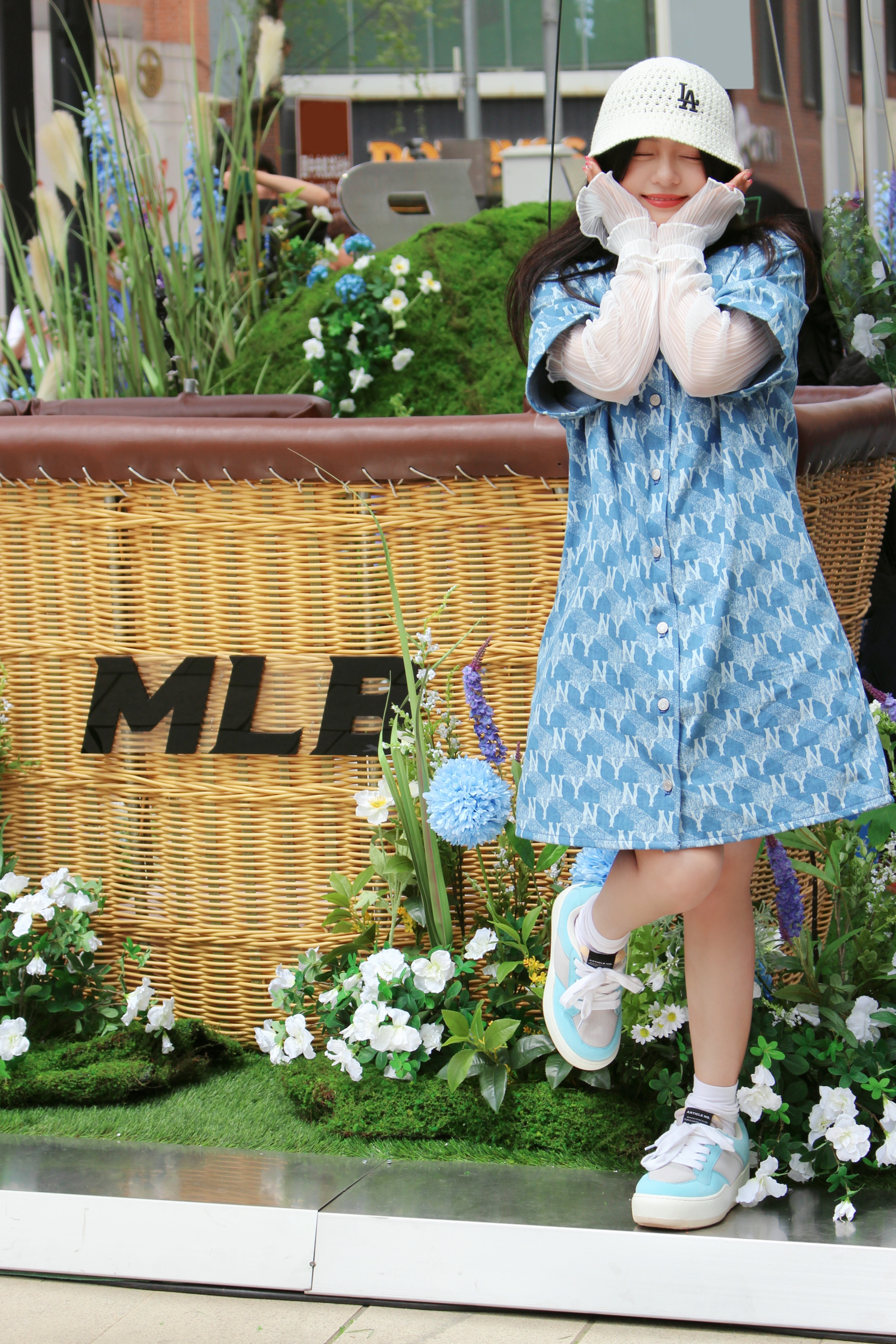 逛个展见到了@张凌赫z 。好瘦好高好白。 顺便夸一夸这个展好丰富,好玩! #Hedy OOTD# 看到最近泫雅在音乐节上的白色针织钩花帽子造型,立马搞了顶类似款,好看。[哇]牛仔连衣裙也被人夸了。 服装/帽子:MLB 鞋子:ARTICLE NO.