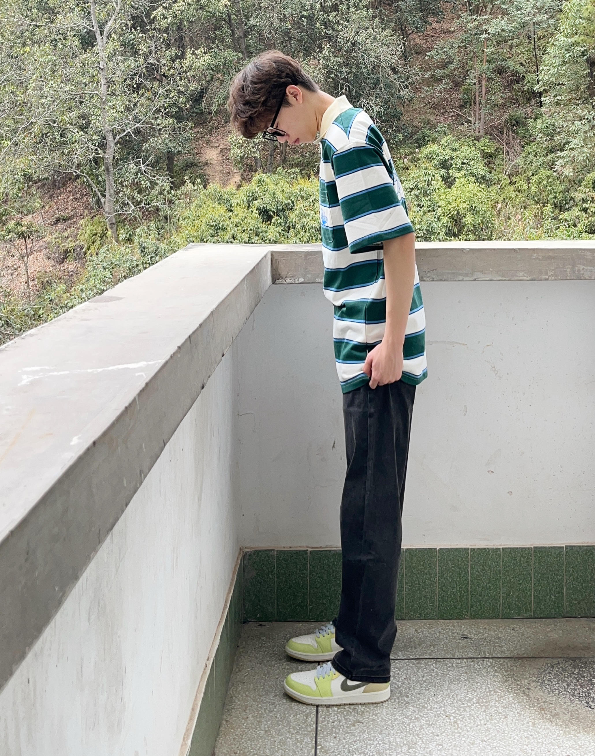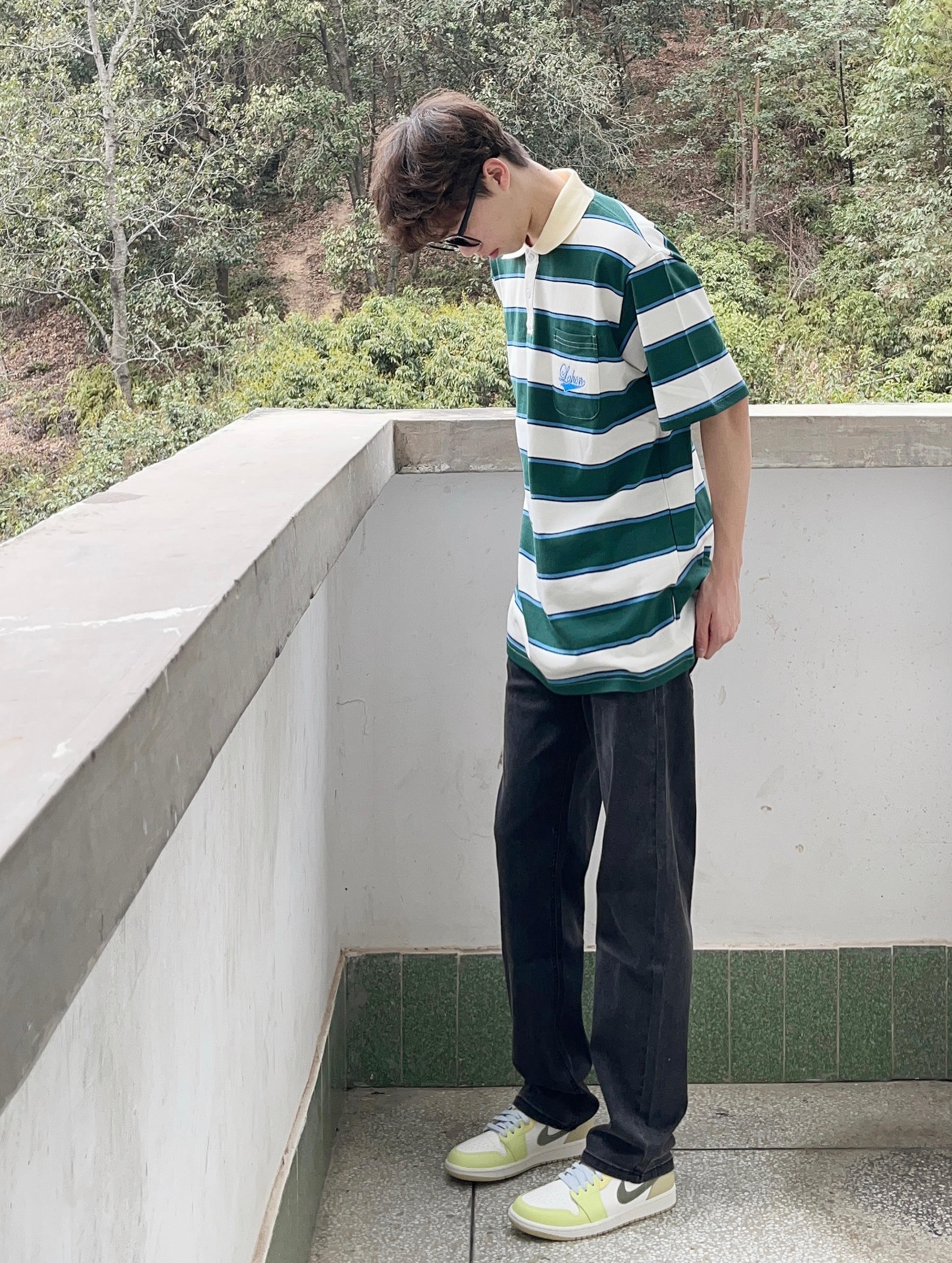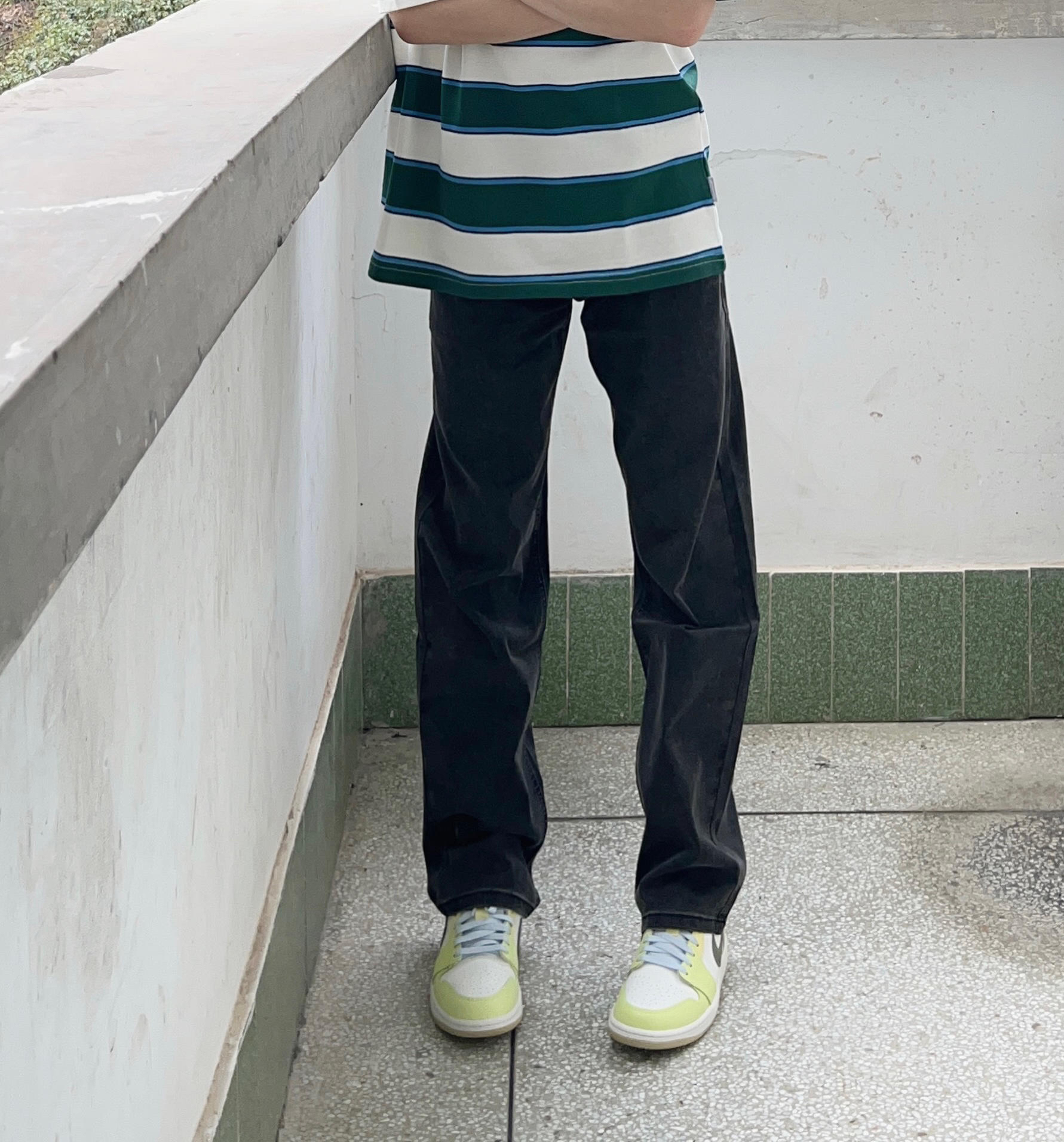 裤子是黑色水洗牛仔裤 版型宽松显瘦 裤子做工方面收腰弹力适中 穿上很显腿型 再搭配上一对黄绿色的百搭板鞋 一套下来 春夏穿非常好看