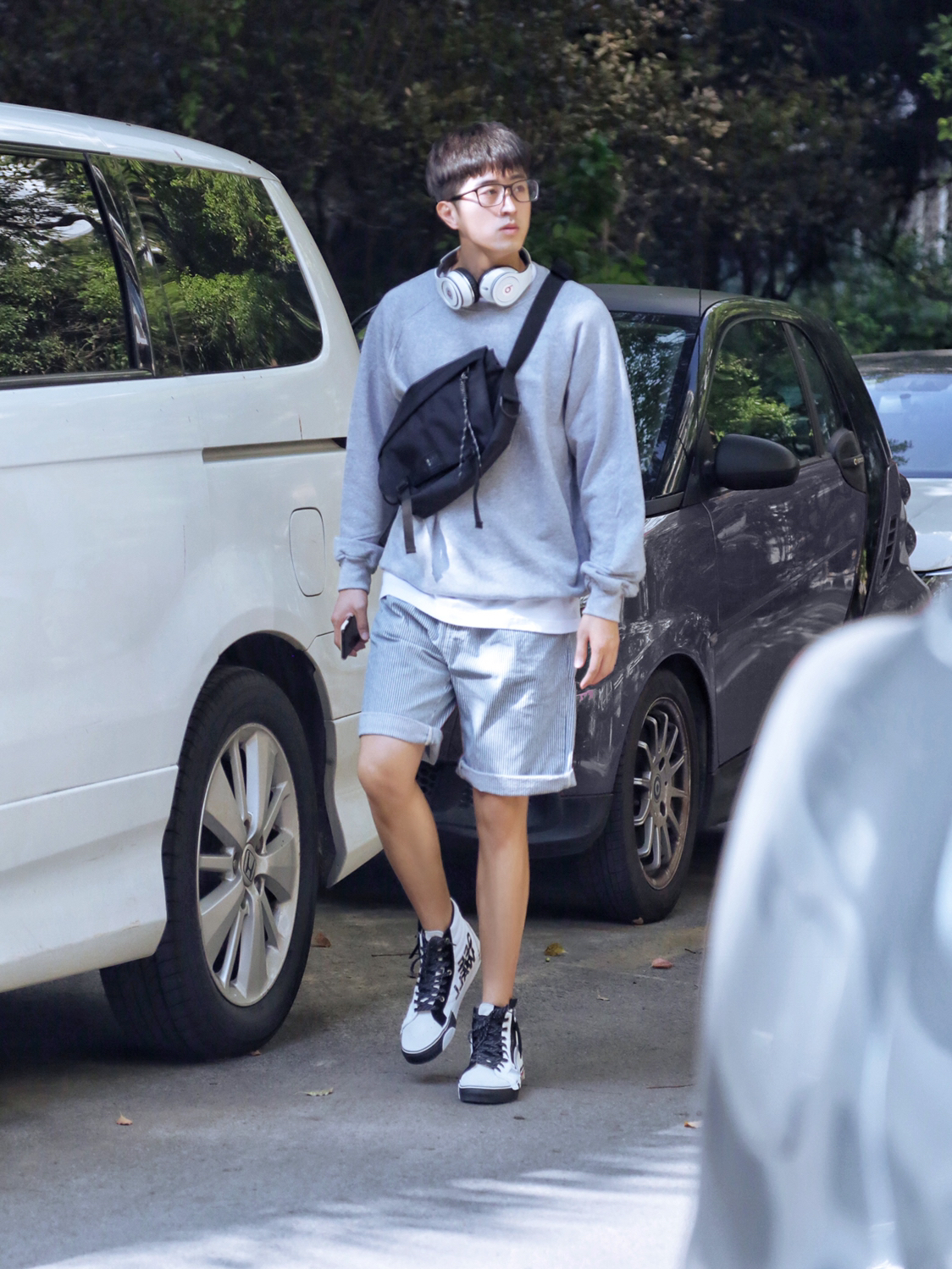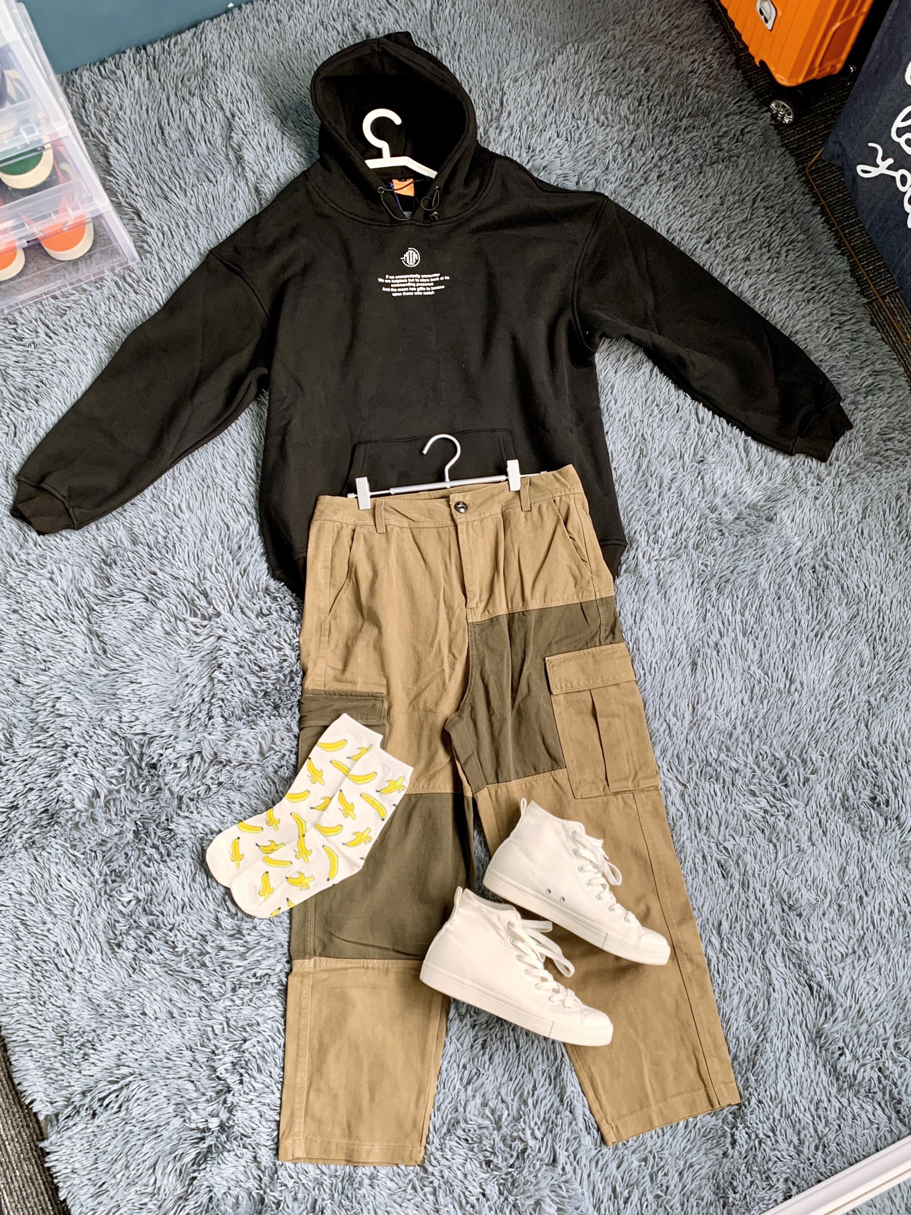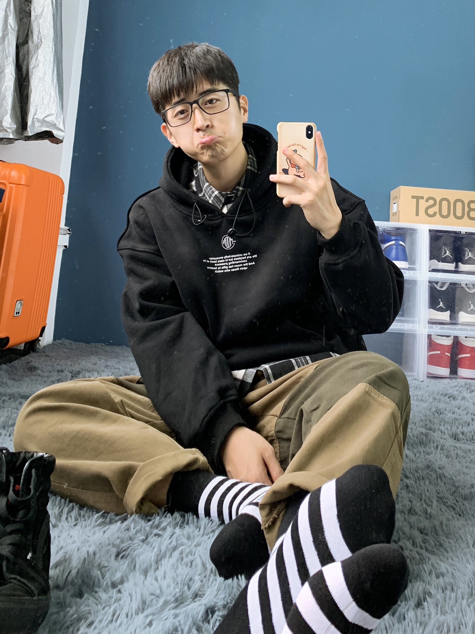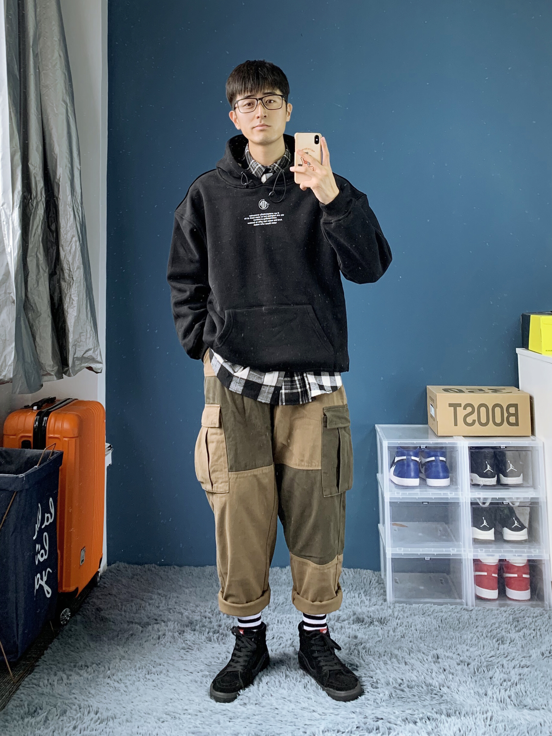 搬家之后,在房间里选了一面墙,刷上了自己很喜欢的深海蓝,每天看到这个颜色心情就会安静一会。其他小家具还在慢慢添置,先自拍穿搭来一套。以后,这里就是我的自拍空间。 — 今日男生秋季穿搭: ·上衣:黑色简约连帽卫衣—PD大人 ·打底:黑白格子衬衫—PD大人 ·裤子:卡其色拼接工装裤—PD大人 ·袜子:黑白条纹长袜—KAXX ·鞋子:我的黑武士...
