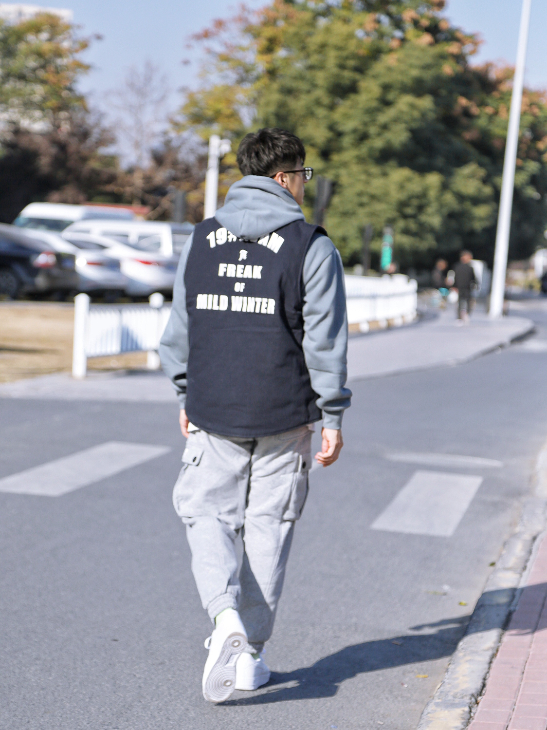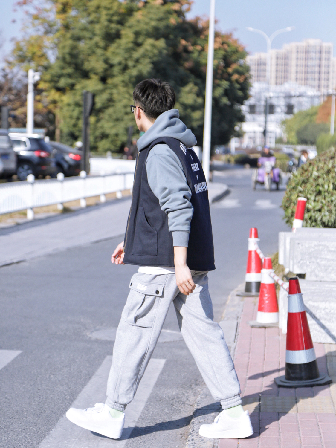 今天的杭州,依旧灿烂,我很暖! — 距离我穿这种学院风运动款的束脚裤,应该有两三年了。好久没入手这类单品,真心舒服好穿。搭配我的AF1小白鞋,满满的校园气息,这种日常简约街头学院风搭配,也满适合男生约会穿搭的。 — ⭐️今日穿搭打卡⭐️ ·上衣:【藏青色】背后印花工装棉马甲:PD大人 ·内搭:【雾霾蓝】加绒连帽卫衣甲:PD大人 ·裤子:【学院灰】工装口袋运动束脚裤甲:PD大人 ·鞋子:【纯白色】空...