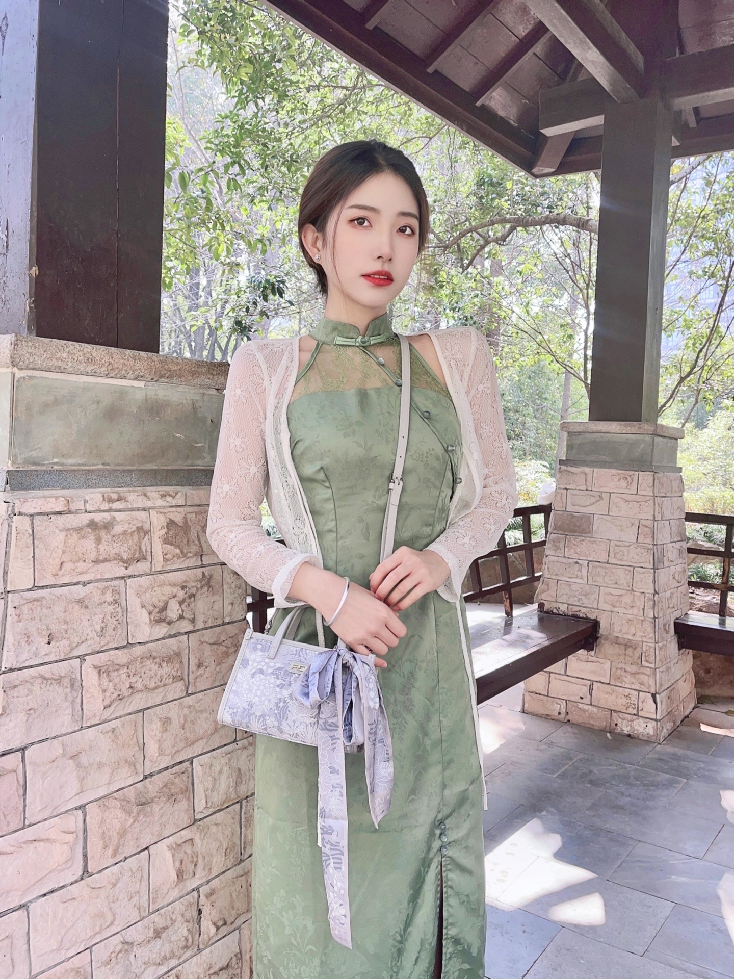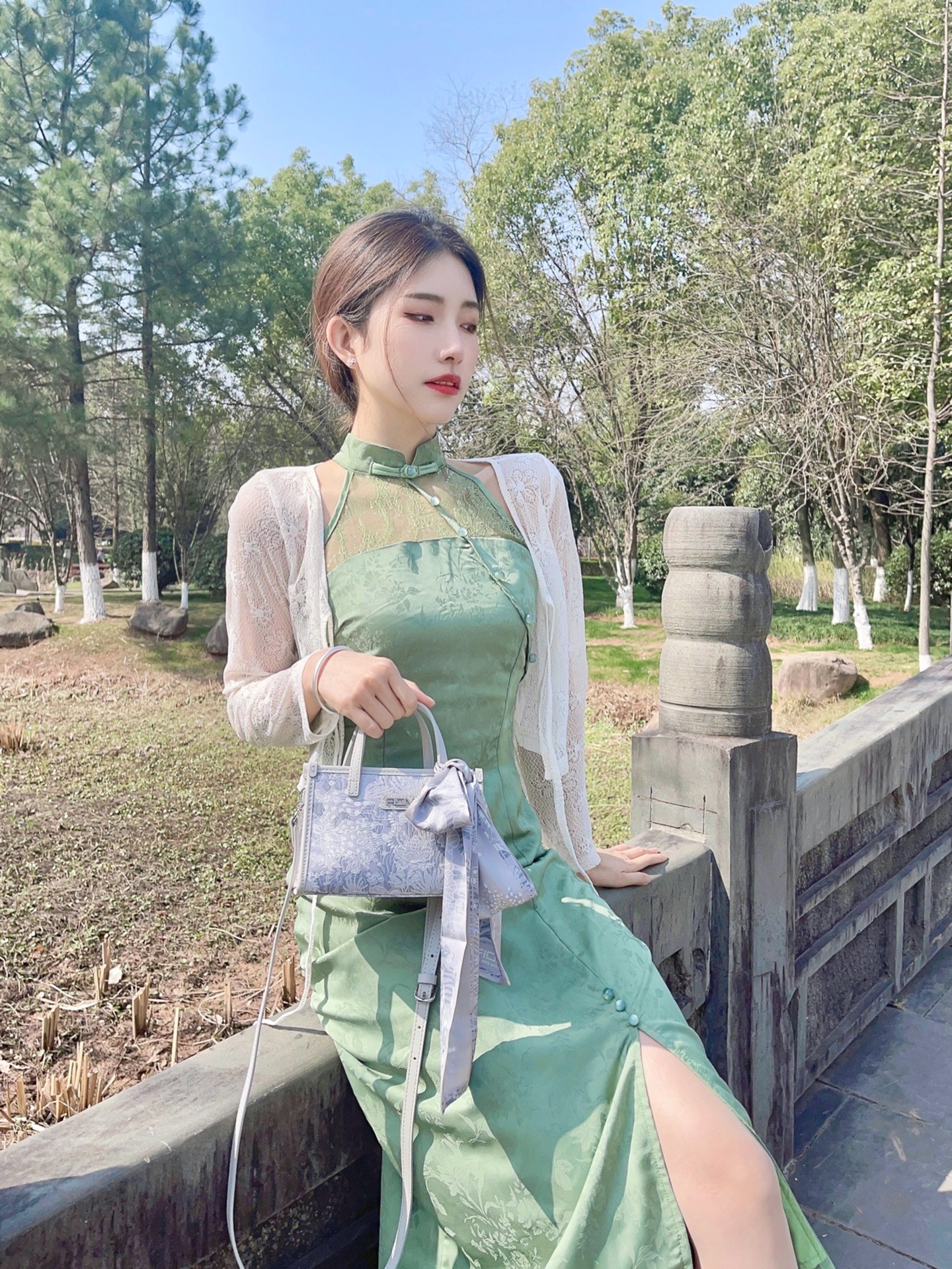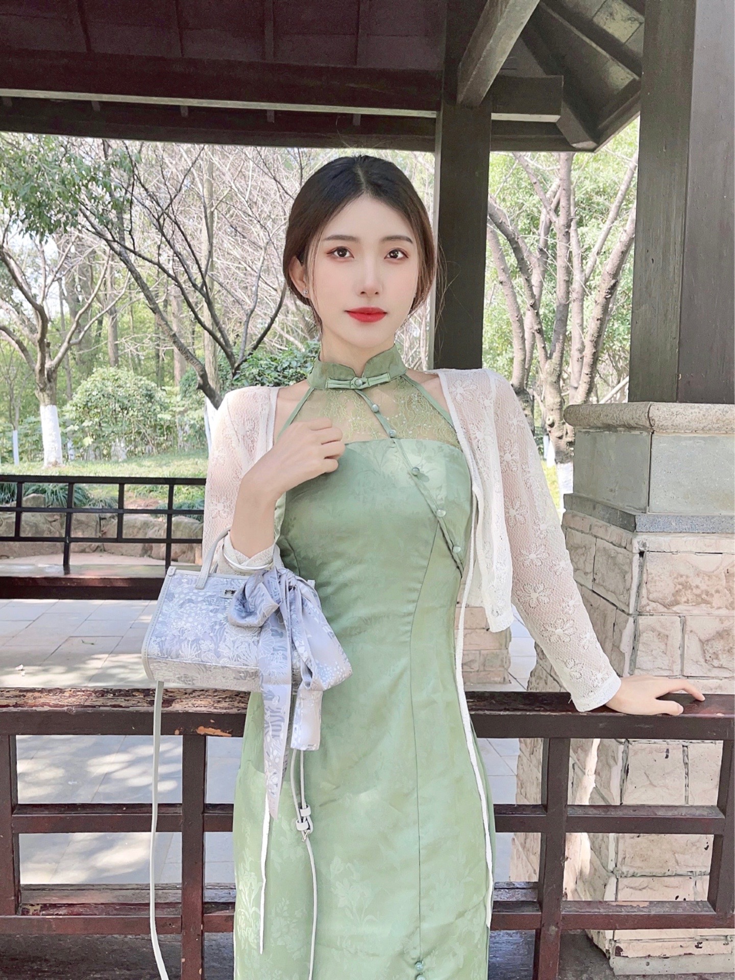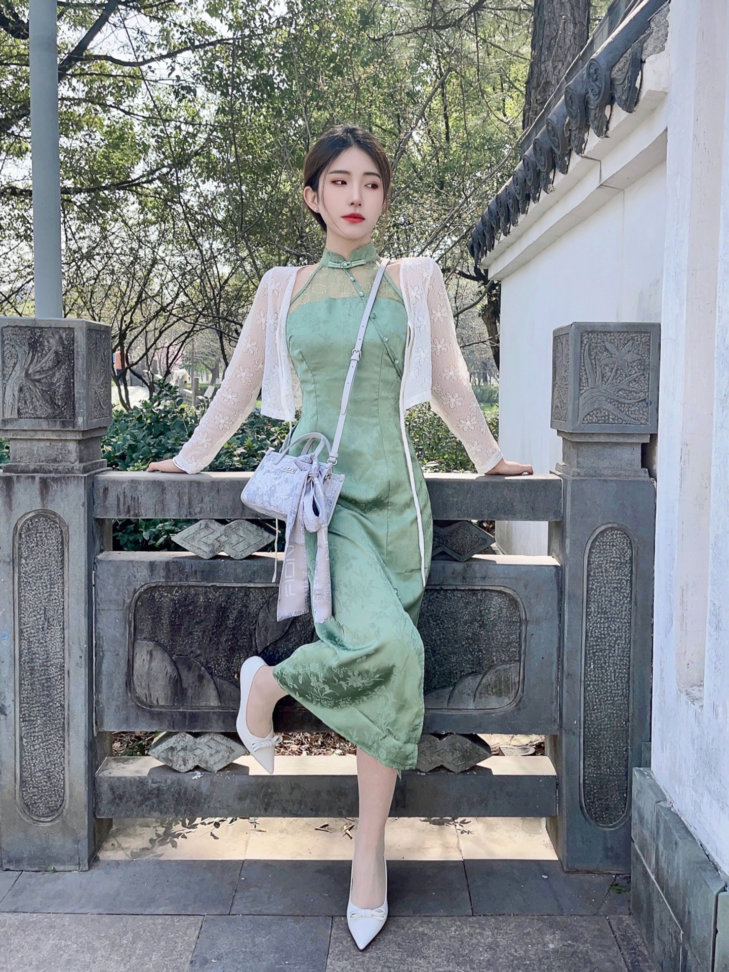 论🍃春季穿搭还得是新中式 翡翠绿色系的长款旗袍➕小开衫 再搭配一双白色系高跟鞋 韵味十足 包包选择了FION菲安妮小方包 锦鲤刺绣🪡精致到位 设计细节满满 附带的丝巾装饰在包包上增加丰富性 根据自己习惯单肩、斜挎、手拎都可以 容量合适 日常出门必需品足够容纳啦~ 不得不说新中式国风才是yyds! 👛:FION菲安妮 👠:honeyGIRL #换季这件小饰 #该穿春装了 #我的春季LOOK #新...