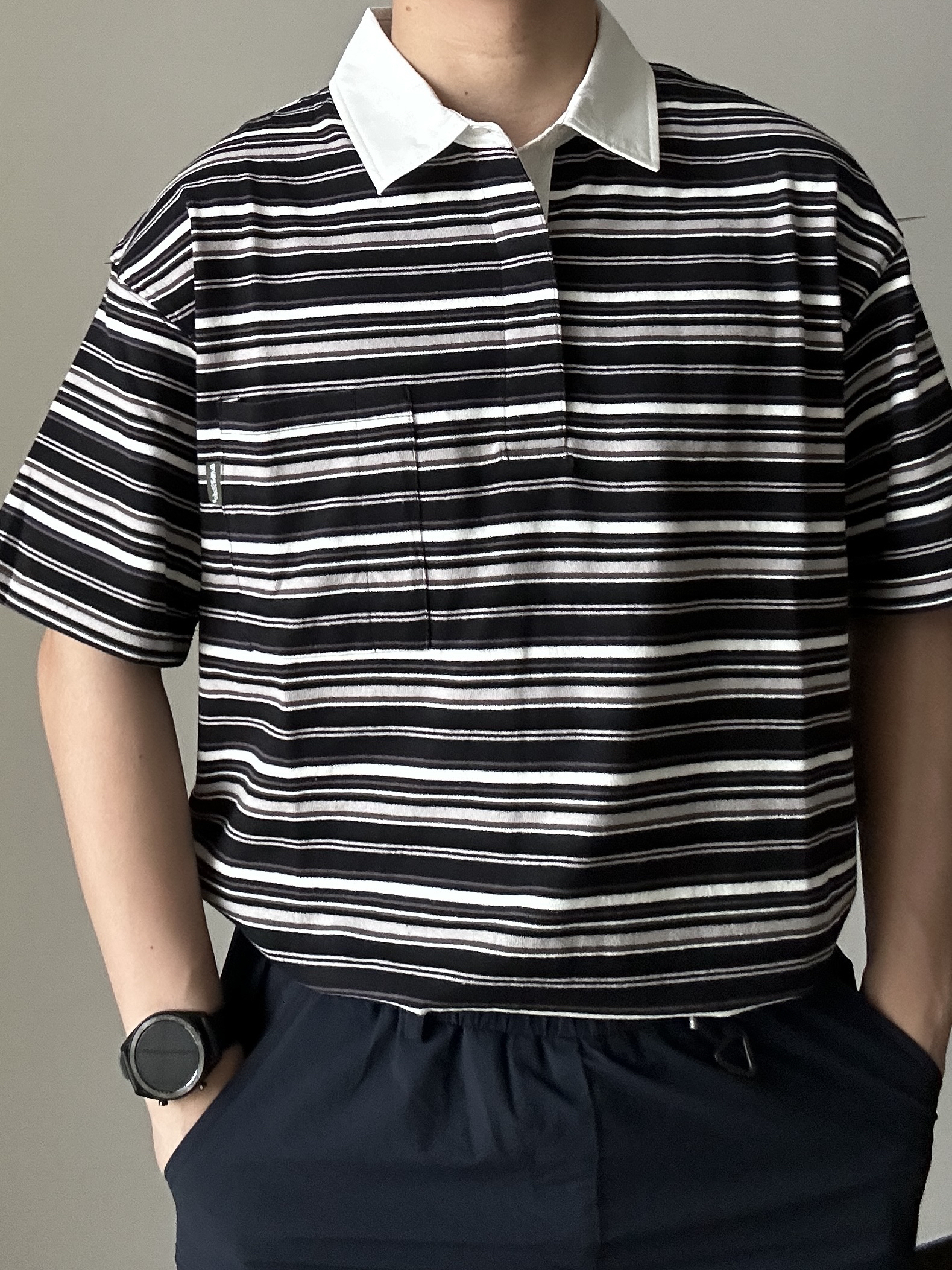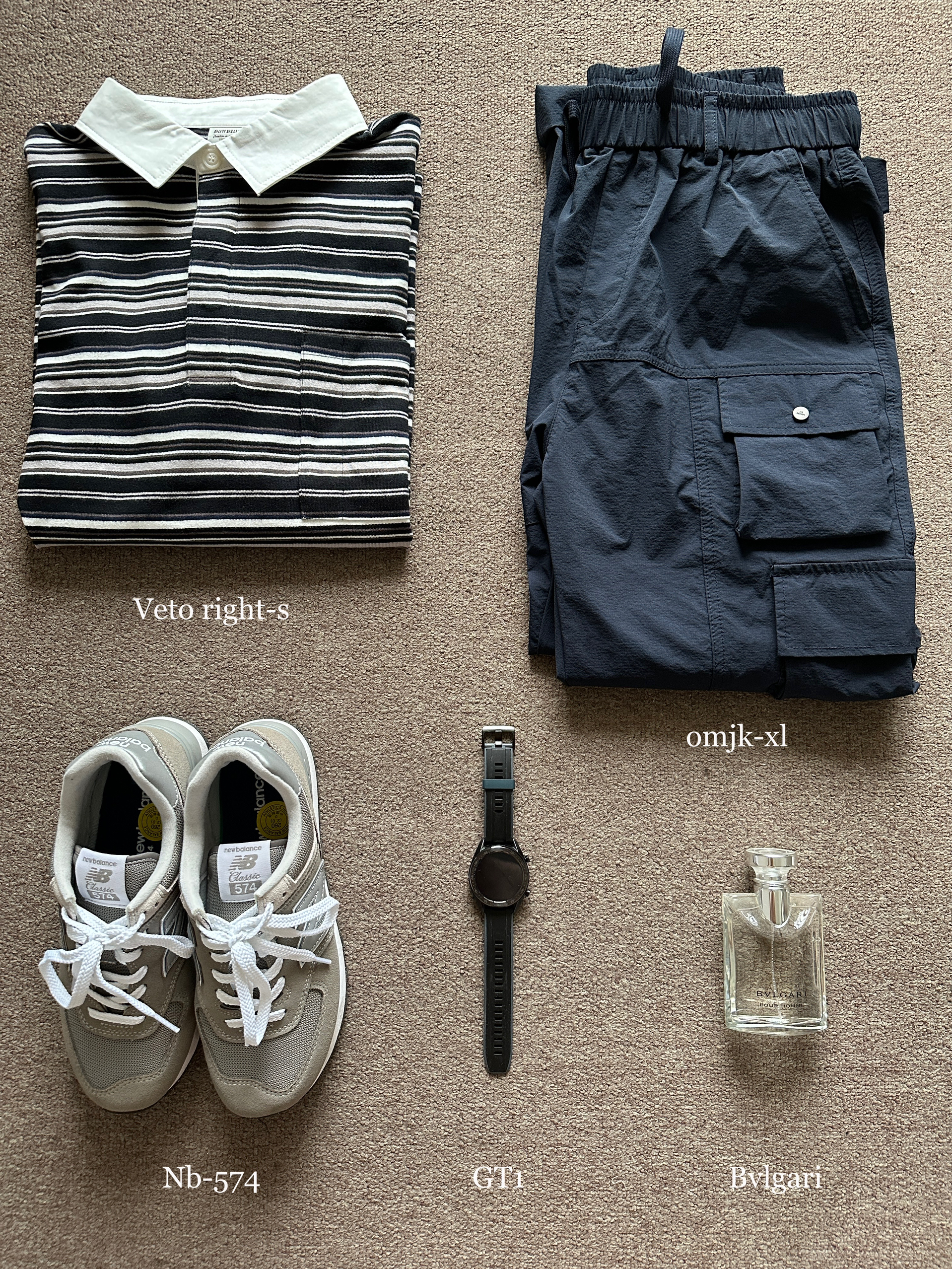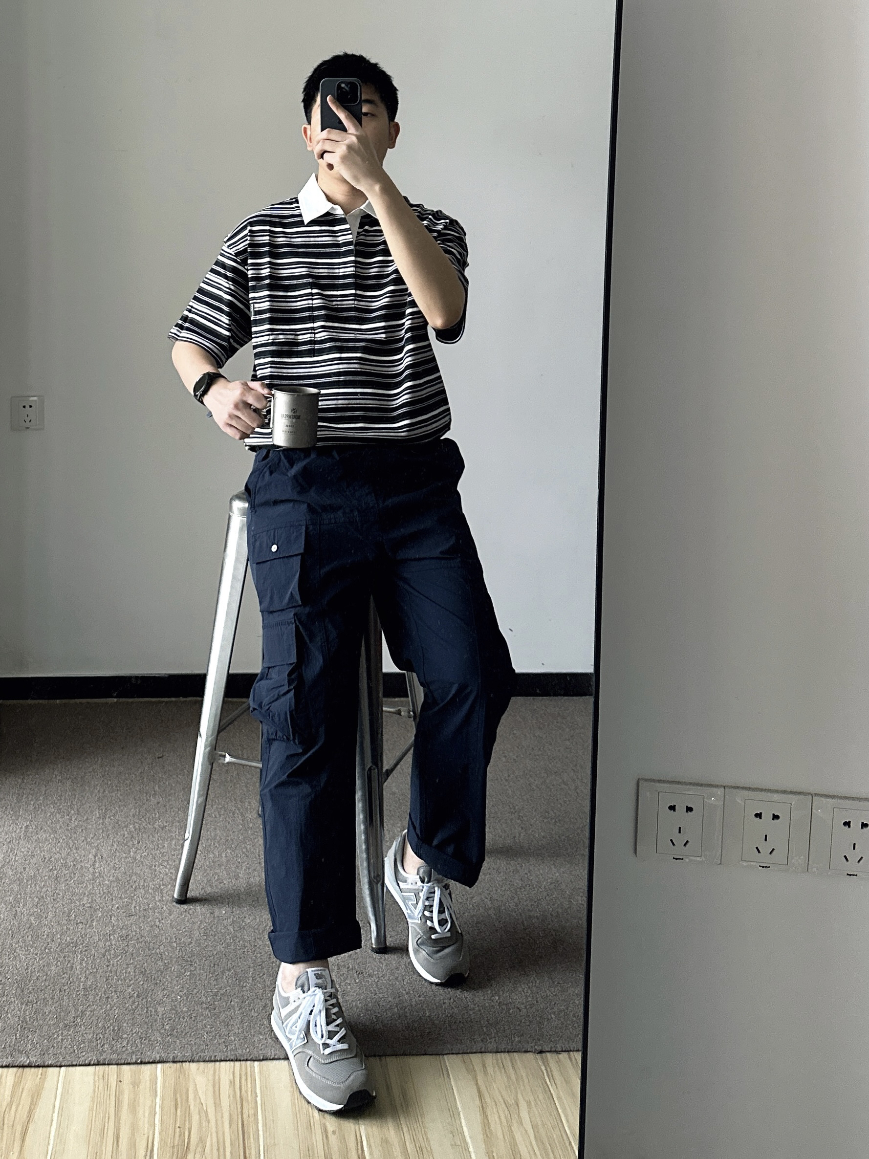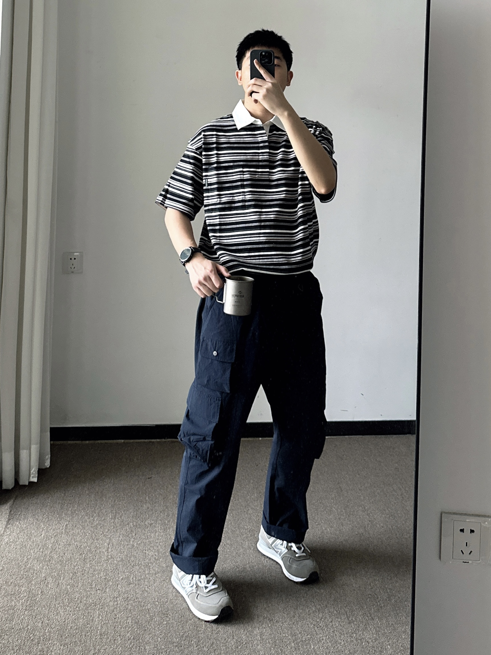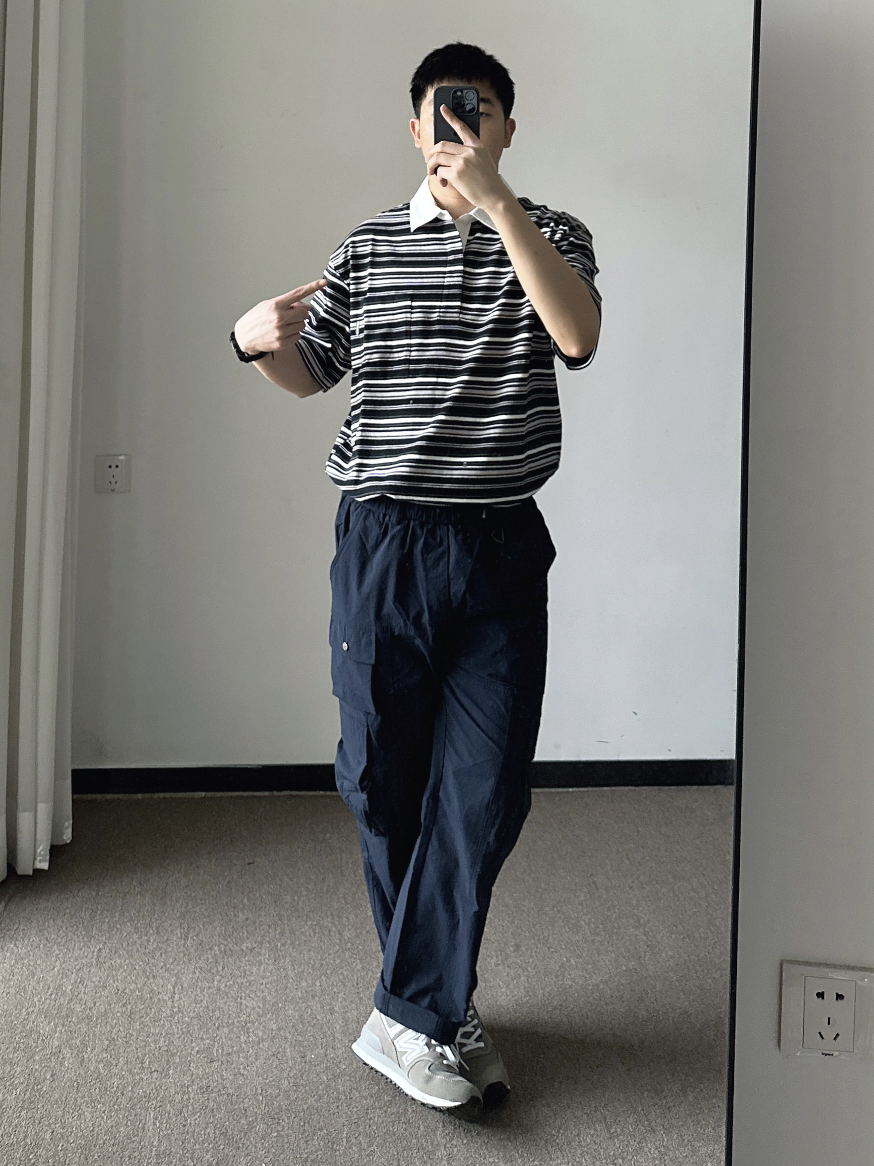 素人也能好看系列~ 174cm/65kg 🧥- 日系复古条纹polo,黑白灰细条纹。翻领比较宽大,休闲复古味重。 👖- 机能工装裤,面料比较轻薄,适合夏天穿着。 👟- 经典的元祖灰配色。
