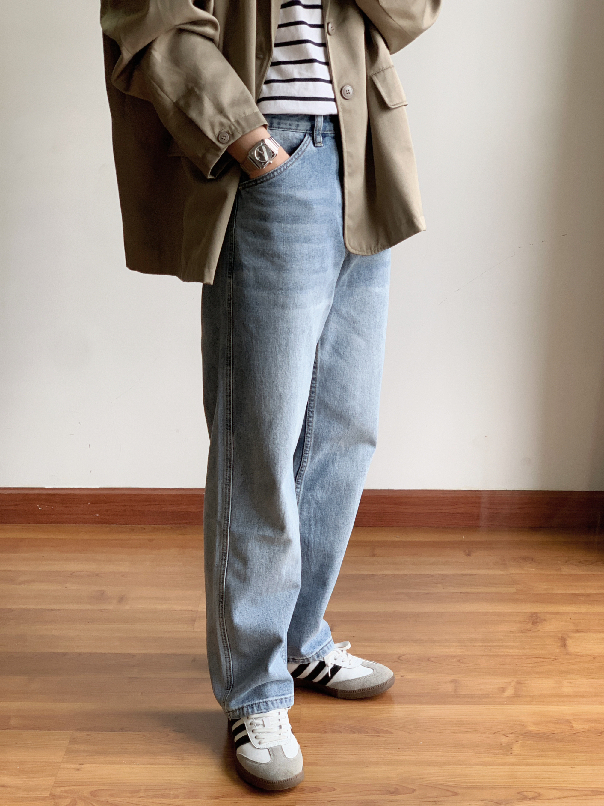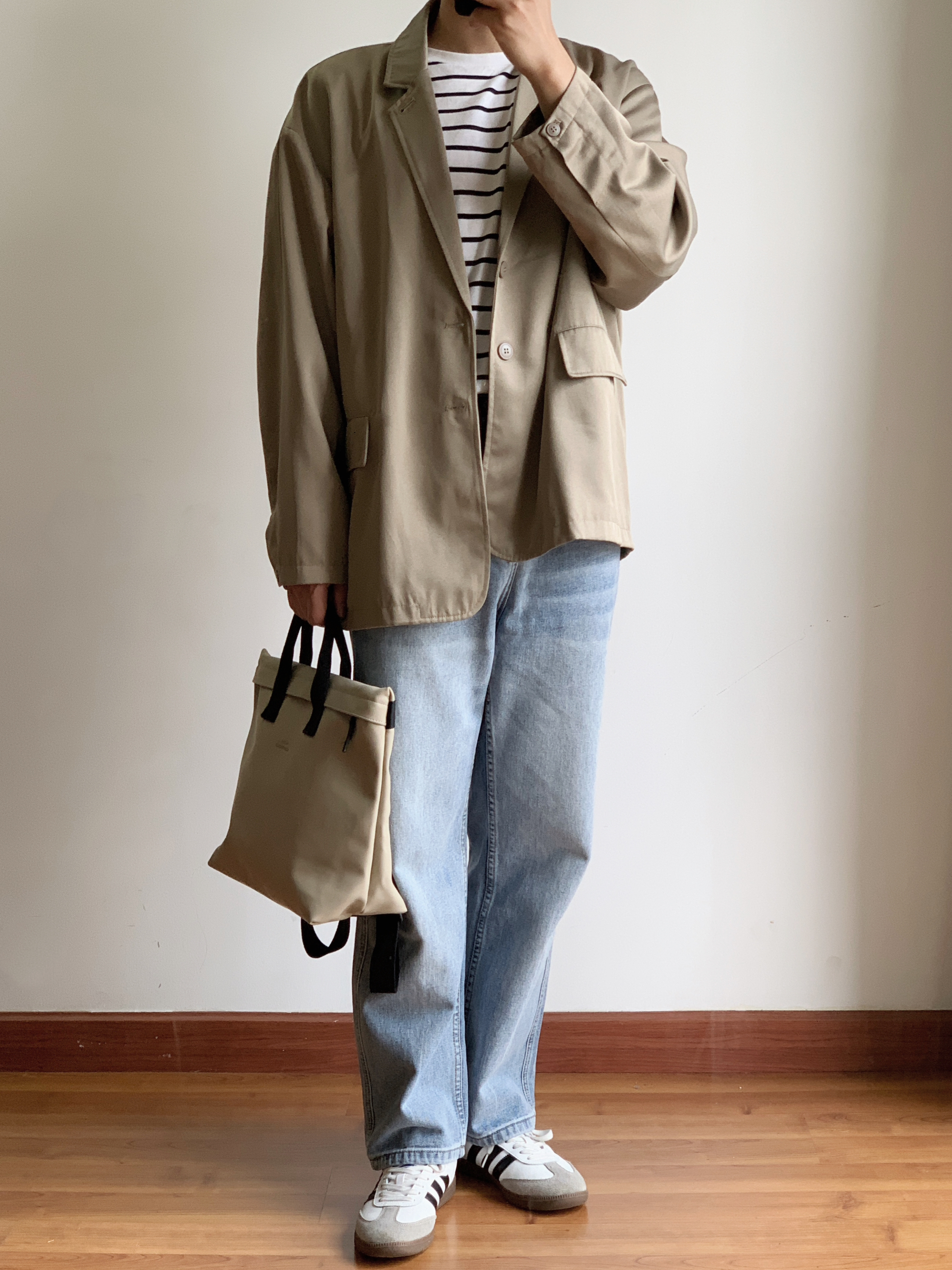 hey 这里是每天记录通勤穿搭的社畜日记 OOTD: 条纹短袖+卡其西装+浅色牛仔裤+samba | 极简穿搭 | 显瘦穿搭 | 通勤穿搭 | 男生穿搭 | | 每日穿搭 | 我的日常 | 春季穿搭 | 体质穿搭 |