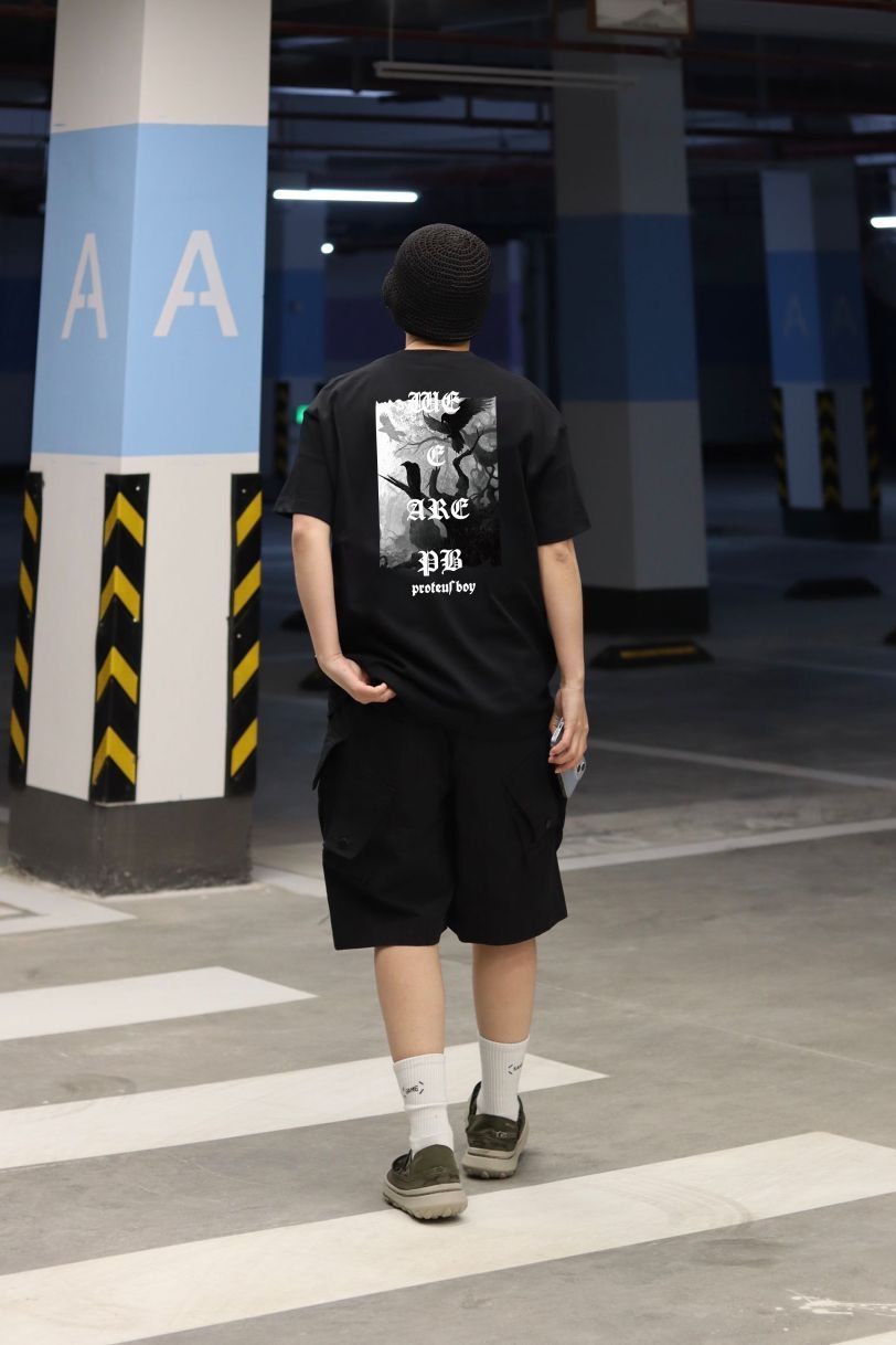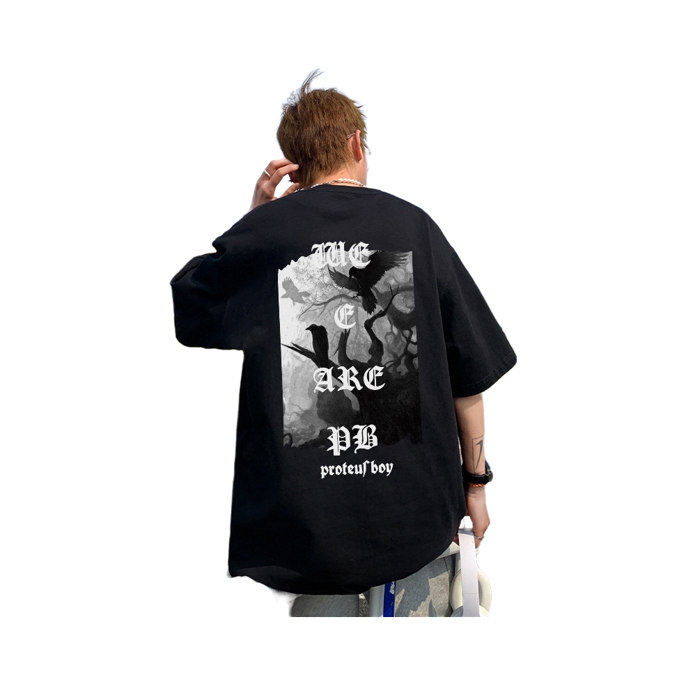 夏天的短袖大致都差不多 不选择一件有特色的款式几乎很难穿出感觉 这件暗黑系乌鸦森林的t恤 可以说是冲出重围了 整体以简约宽松的版型为主 搭配电影感的暗黑系乌鸦森林印花 上身有着独特的风格气息 很百搭新潮的一件单品~