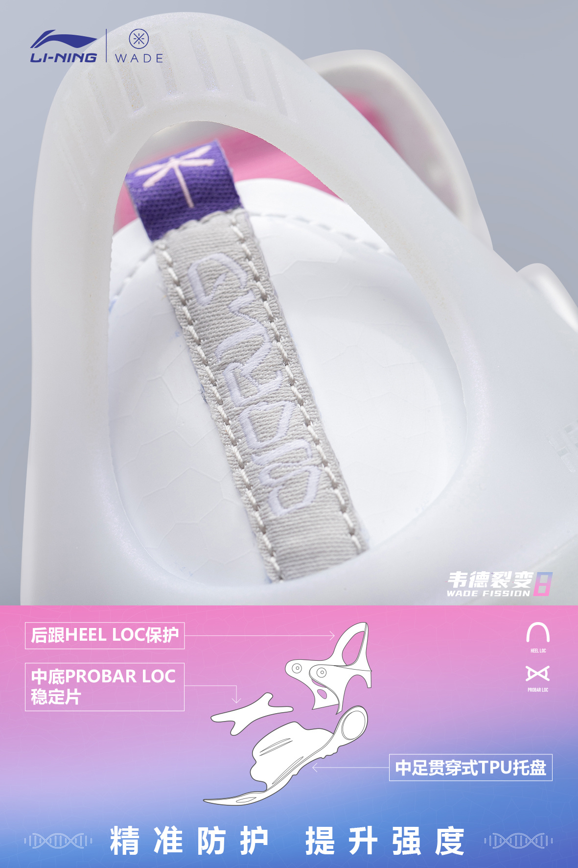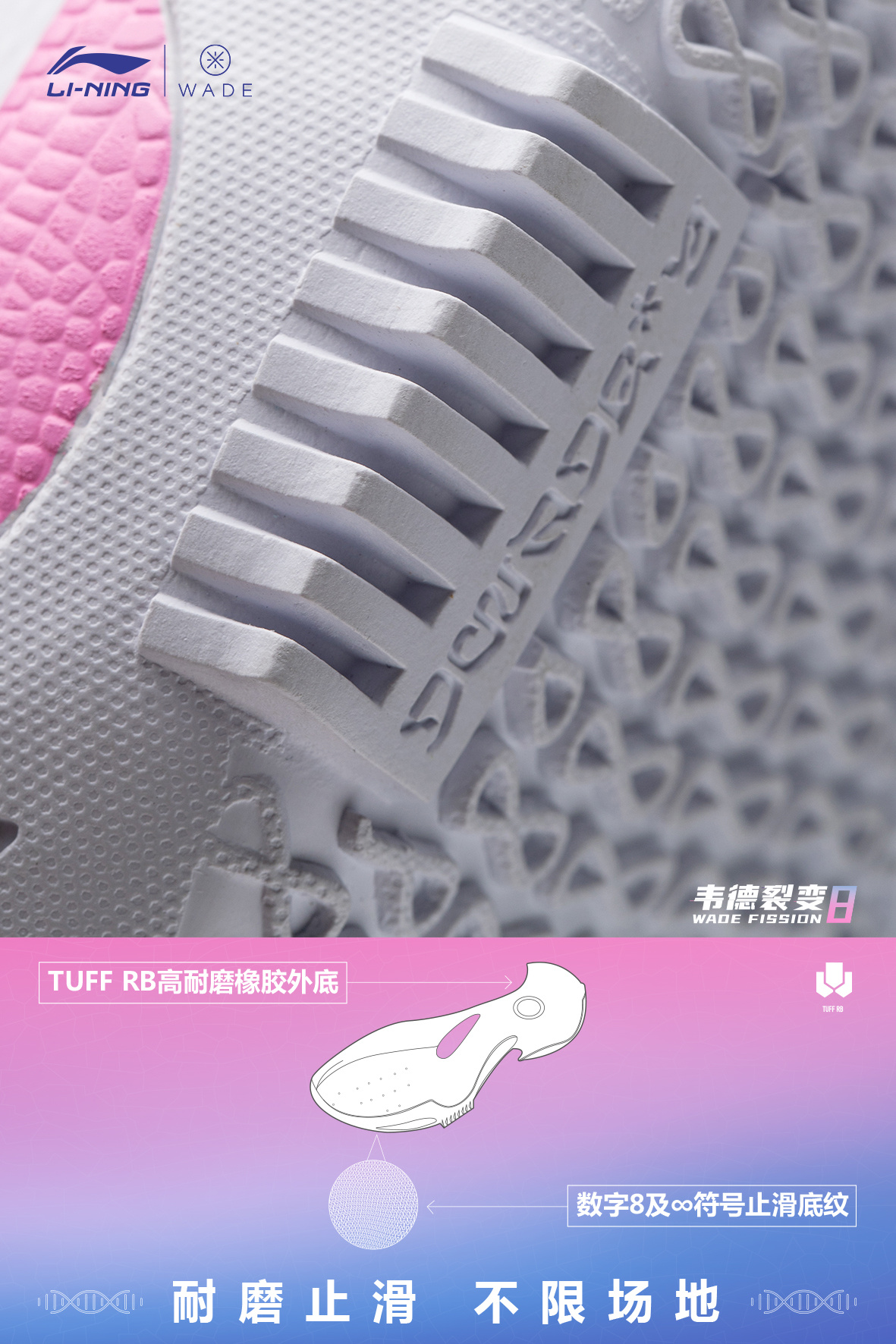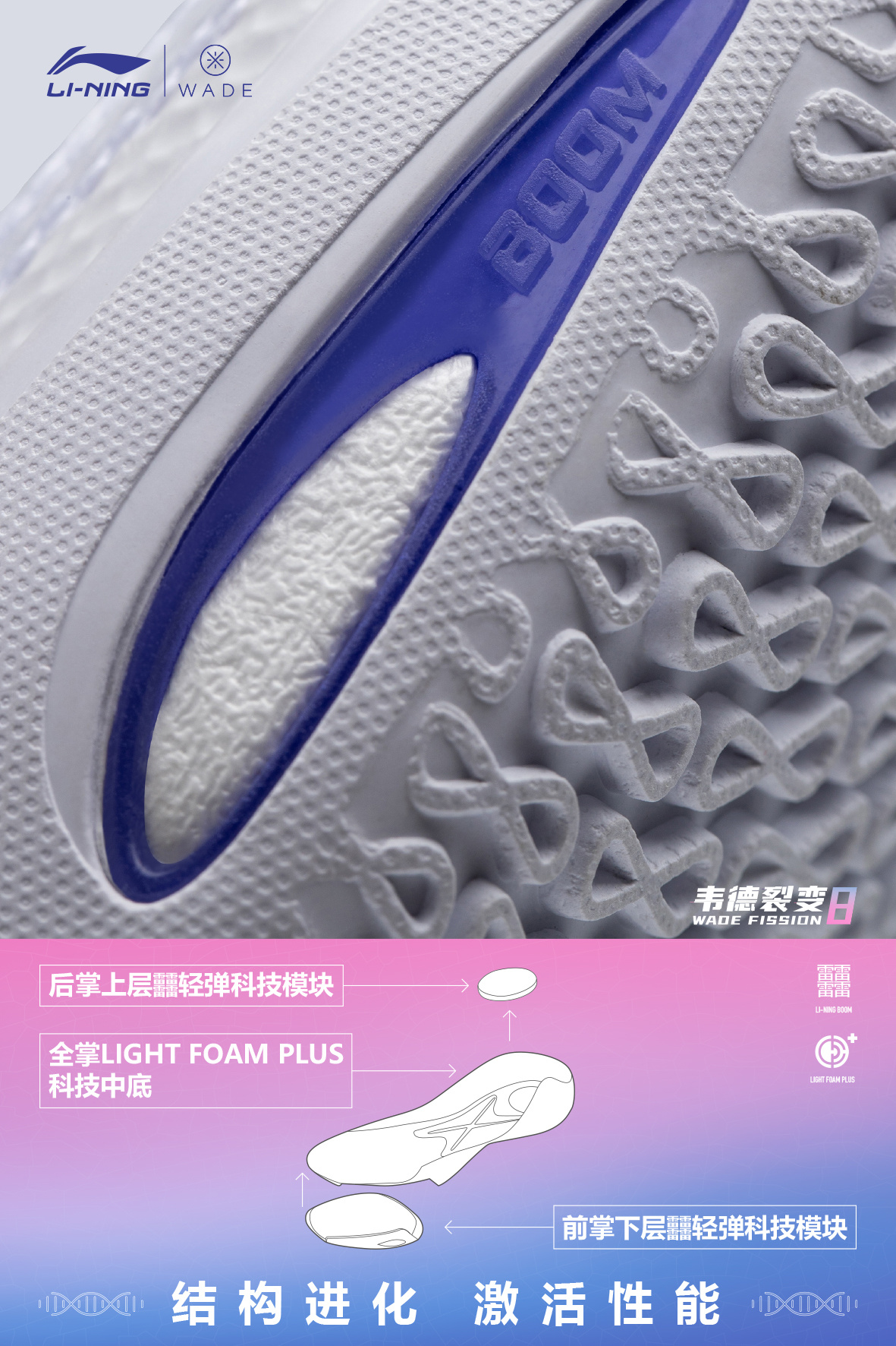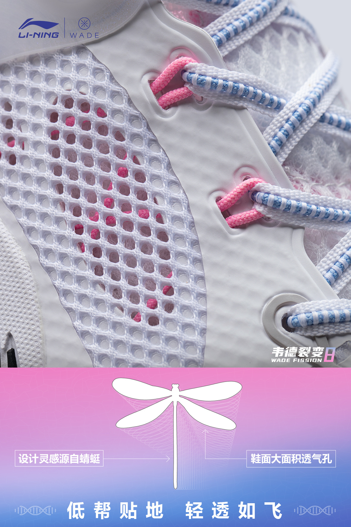 外场基因,环保加持。♻️ 李宁品牌携手@DwyaneWade 秉持WECYCLE计划理念,让篮球与环保极致融合,打造#外场新物种#,呼吁Young DWade用篮球改变世界。🧬 全新韦德系列团队战靴——韦德裂变8,以蜻蜓为设计灵感,鞋面使用回收材料,大面积透气孔,轻松应对春夏季外场环境;改变传统双密度中底内填形式,以全掌LIGHT FOAM PLUS科技中底为框架,前掌下部放置䨻轻弹科技模块,回...