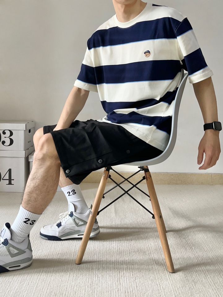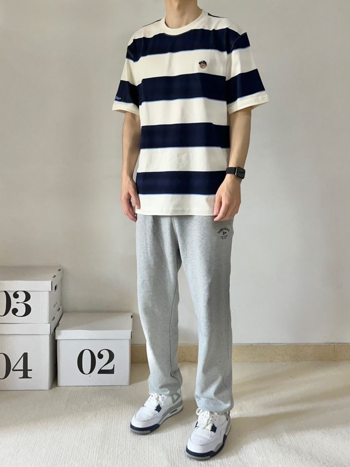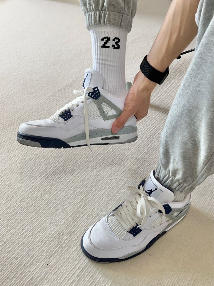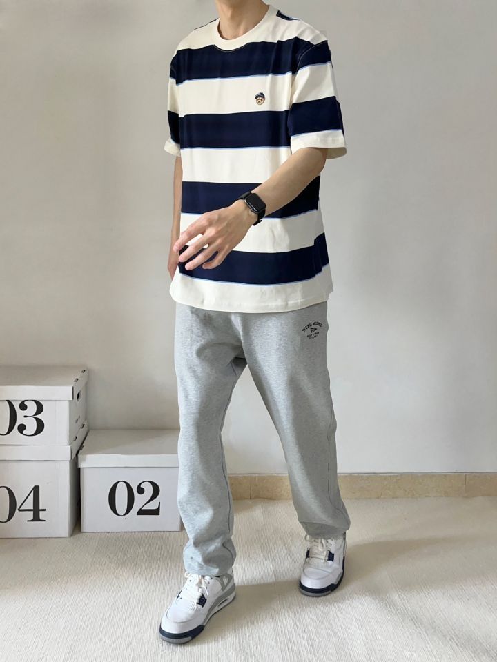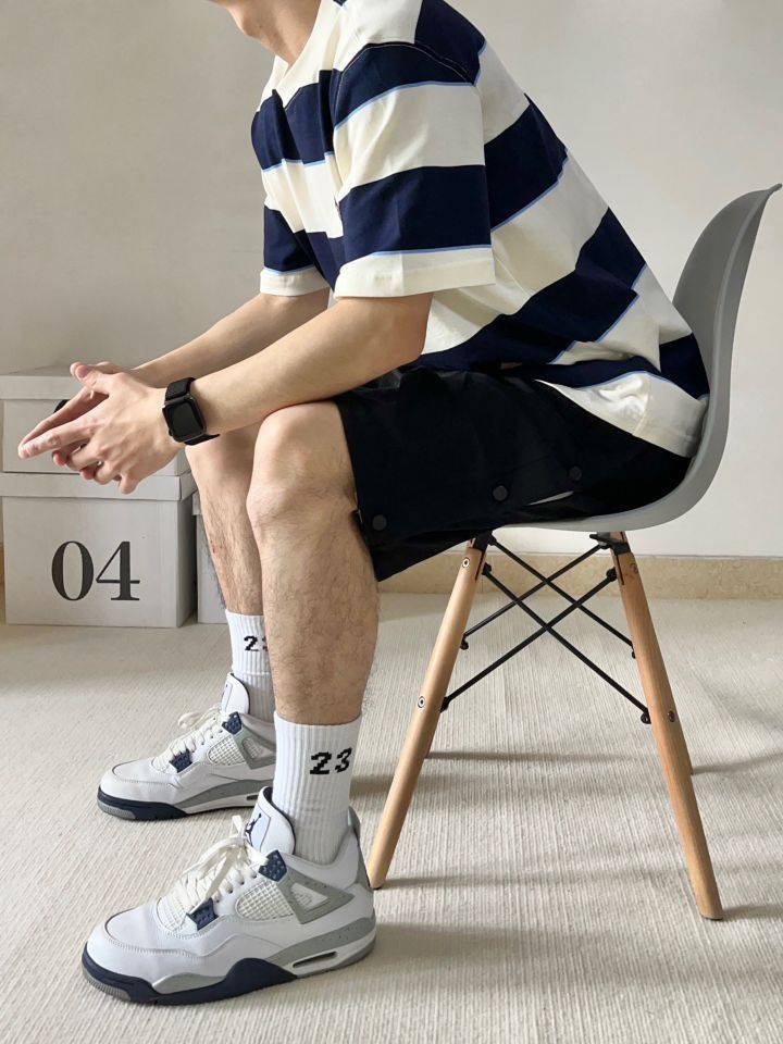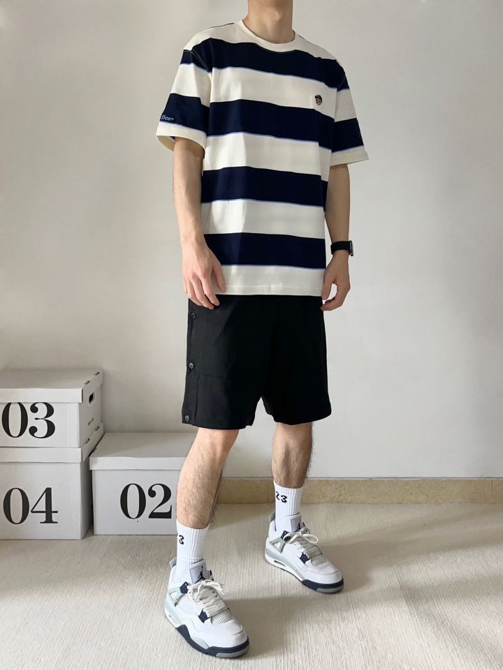 Air Jordan 4 午夜蓝真的好帅 爱了! 最好搭的aj 这双也能有一席之位 熟悉的白水泥配色,灰色和海军蓝点缀少年感拉满 搭配上选一件限定大条纹T恤 重磅面料~亲肤透气 宽松版型+落肩设计,男孩子上身真的很阳光💯 下装搭配我最喜欢的灰运动裤 微锥版型,很显腿长 夏天还可以搭配篮球排扣短裤 日常很百搭,无论是通勤还是运动,搭任何鞋子都ok 一眼就是那个爱运动的大男孩 清爽的...