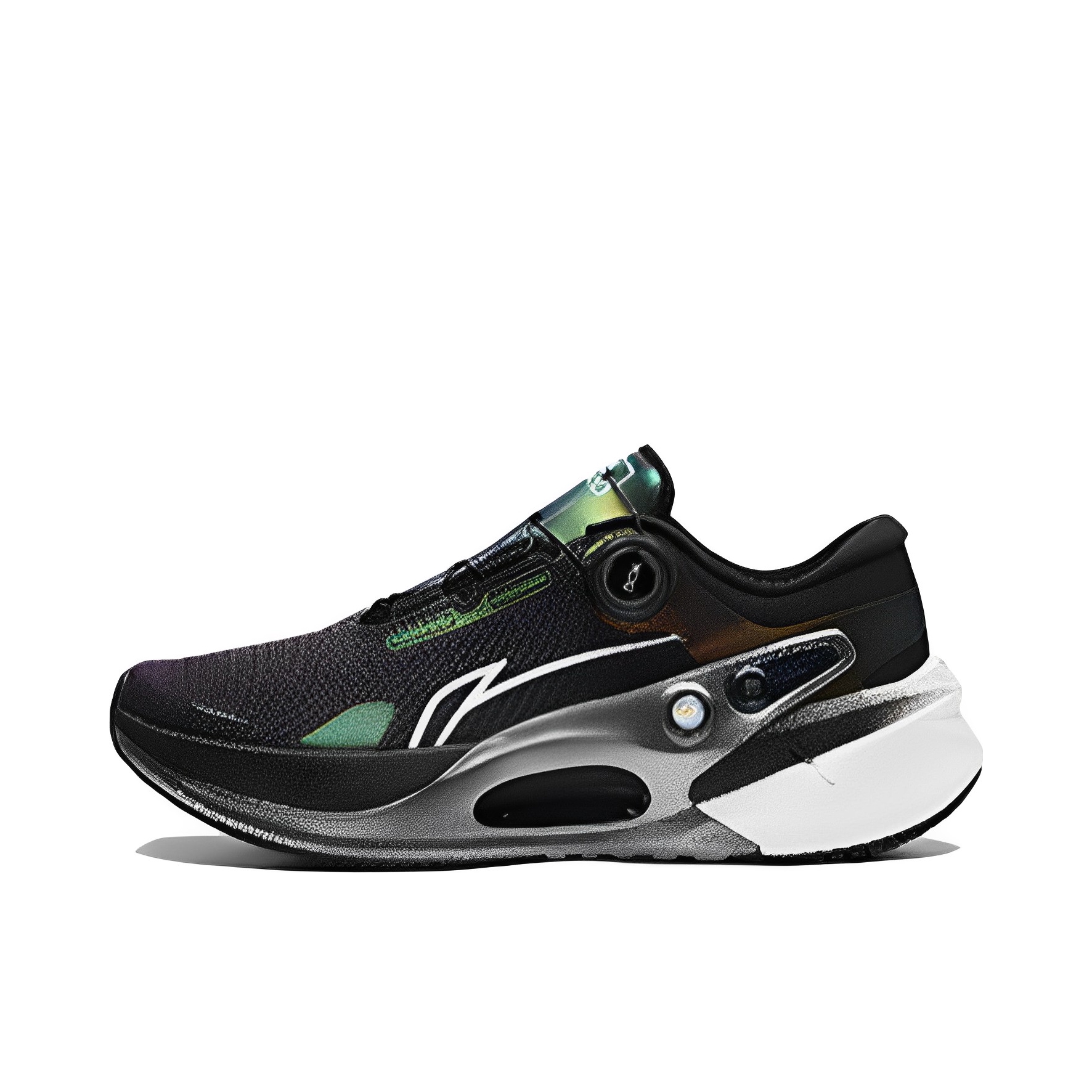 我一开始他在出的时候 我就挺想买的了 也不管他的具体的 实用跑步功能怎么样啊 单说这个造型就挺吸引我的 你看 作为日常的通勤穿或者搭衣服穿 我觉得还都是一个不错的配色 呃上面这些绿色的暗 这个五彩斑斓的黑啊 五彩斑斓的黑 颇有那个蜘蛛人那个奇异博士 他的上面那个啊 夜魔侠啊对 夜魔侠的那个涂装的那个风格 那种绿色 墨绿色泛着金属金属涂装的这个风格 整个黑色的鞋面上 也是有一些泛着紫色的 因为他是 ...