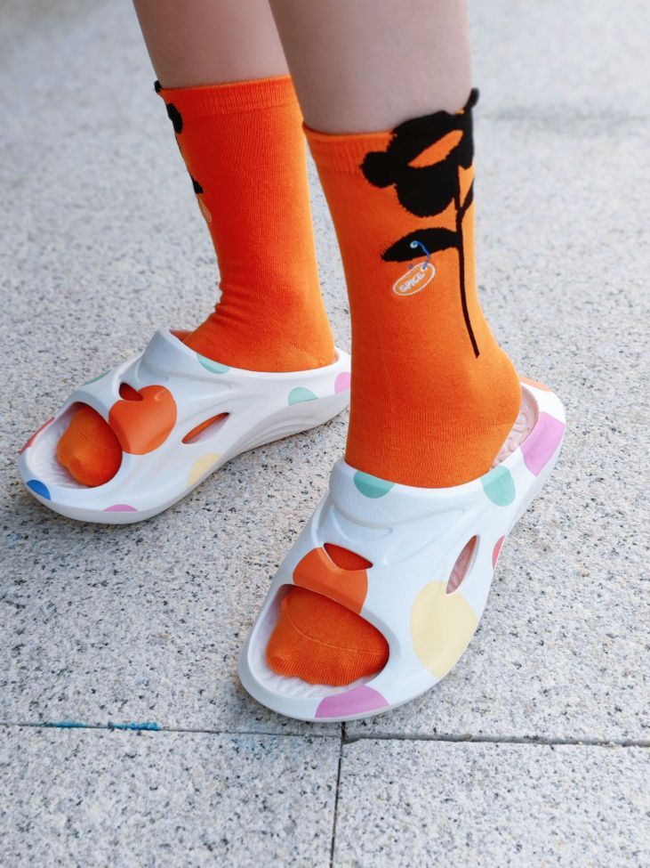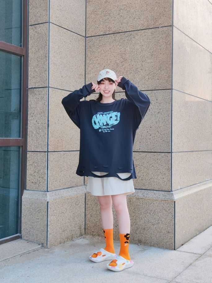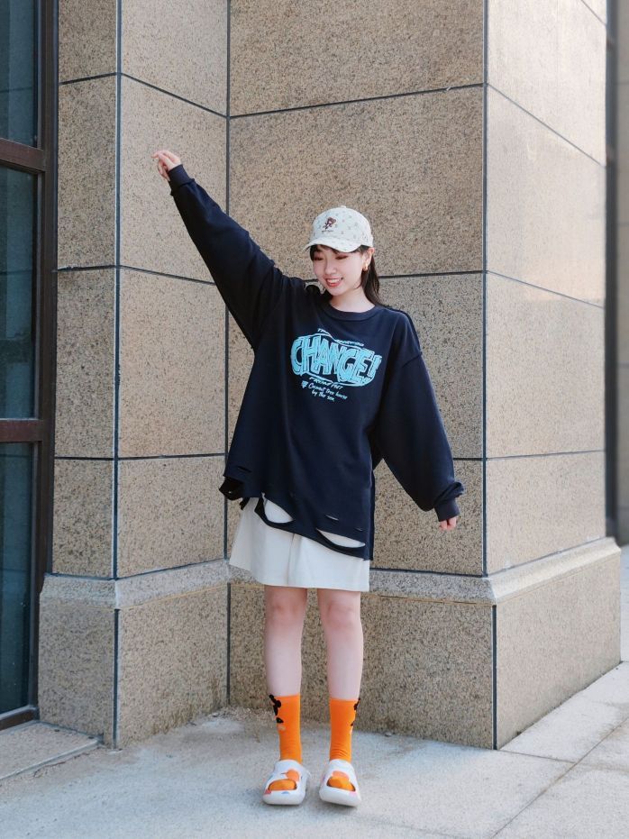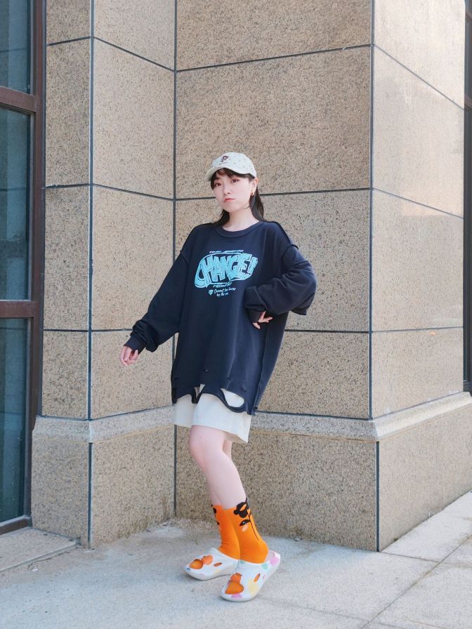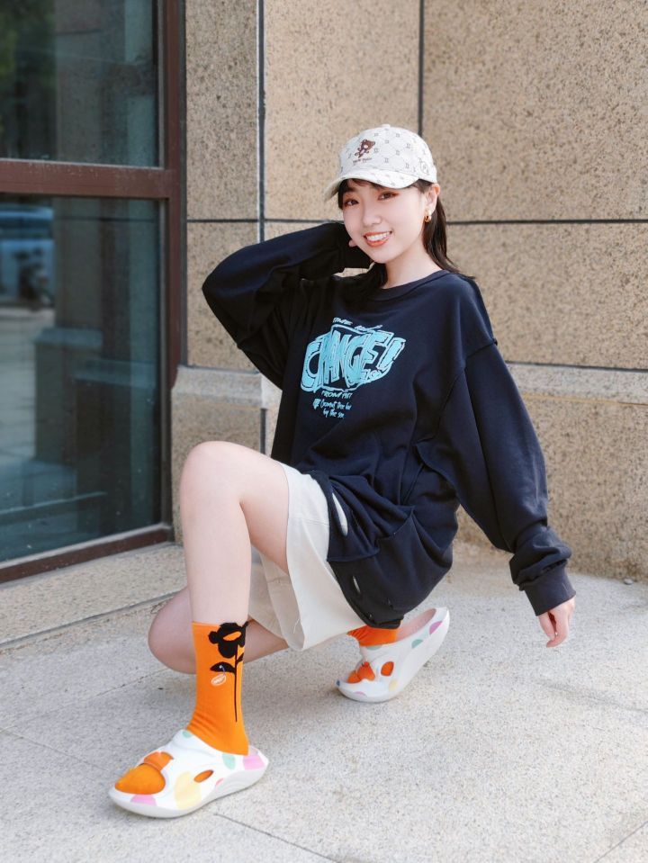 🌞160cm/46kg ↓ 今天是不太甜有点咸的嘻哈cool女孩! 宽松的薄款卫衣搭配大短裤👖, 很🈶舒服休闲感~ 袜子配拖鞋我真的太喜欢了, 夏天穿舒适还不会闷热, 橘色袜子🧦让我一眼就看到亮点, 弹力不错质量贼好, 上面的小花花🌸装饰好别致~ 今天穿这套轻松出街回头率蛮高呢!