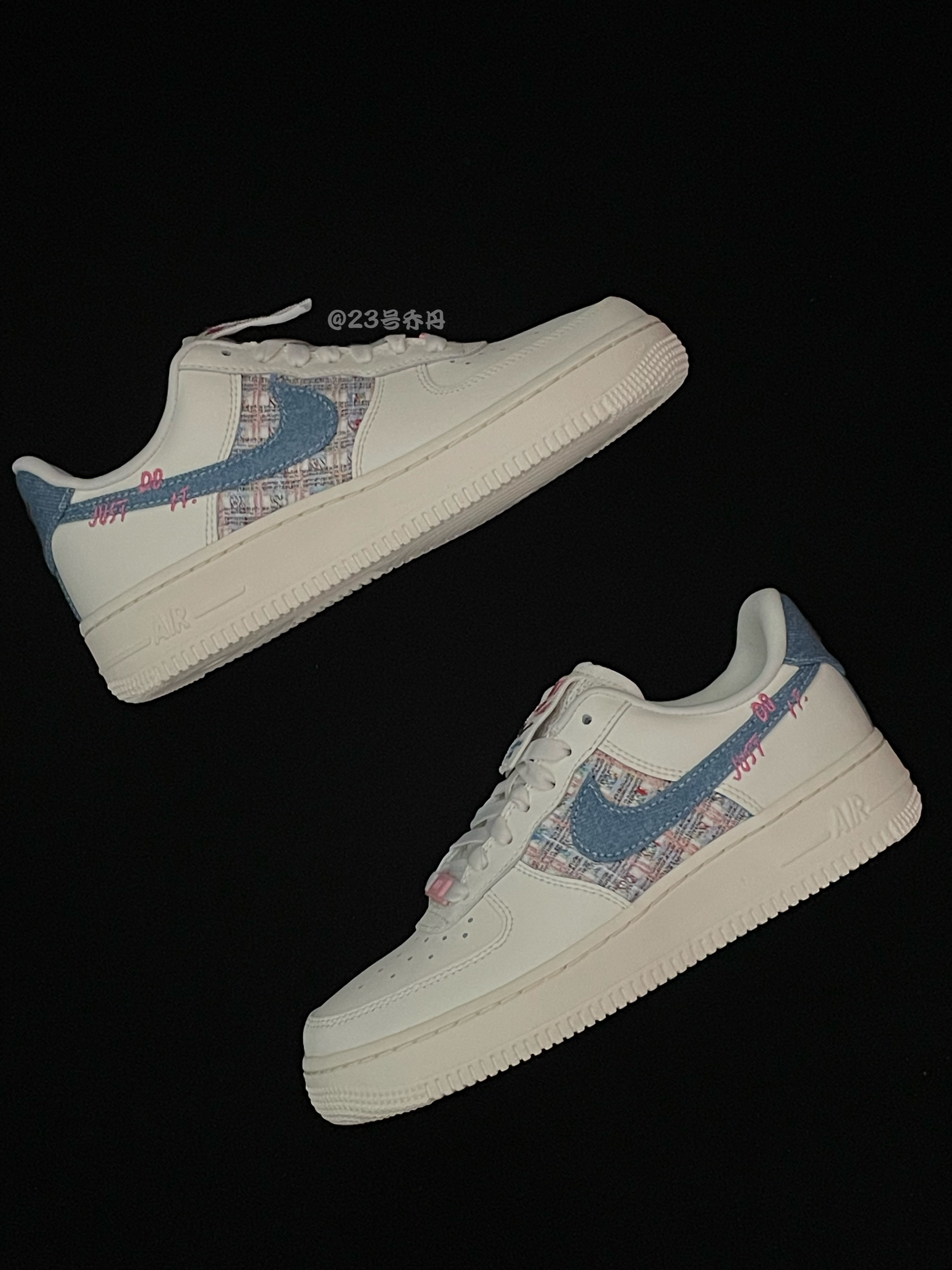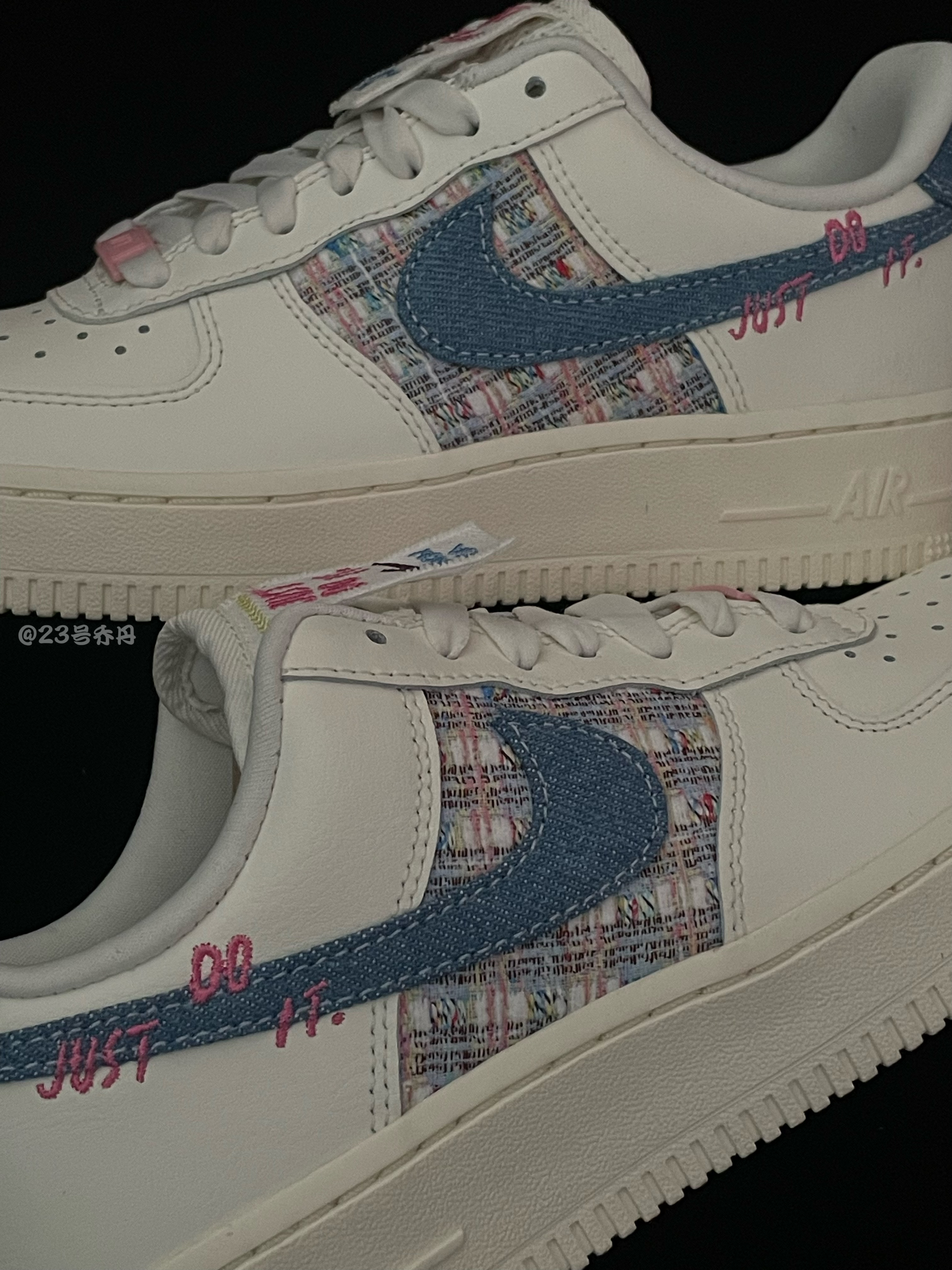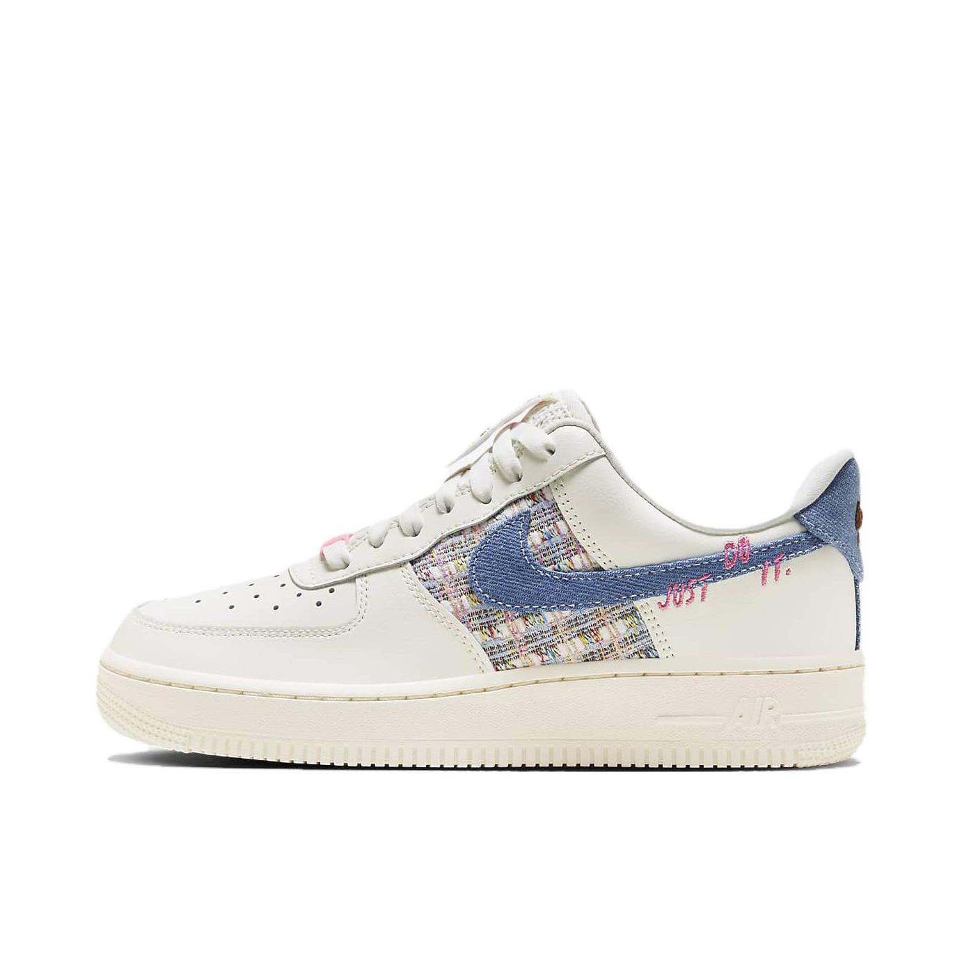 今天给大家分享这双近期发售的 Nike Air Force 1 Low『JUST DO IT』白蓝 整双鞋以米白色为主色调 鞋面运用了皮革和多种织物的拼接设计 鞋身中部两侧选用了多色棉麻织物 鞋侧的Swoosh则使用了蓝色丹宁织物 并且设计有粉色的『JUST DO IT』刺绣 鞋舌标签的半缝合设计十分独特有趣 米白色的中底和同色的橡胶大底收尾 这双AF1『白蓝』低帮鞋款 颜值在线 甜美可爱 很适合...
