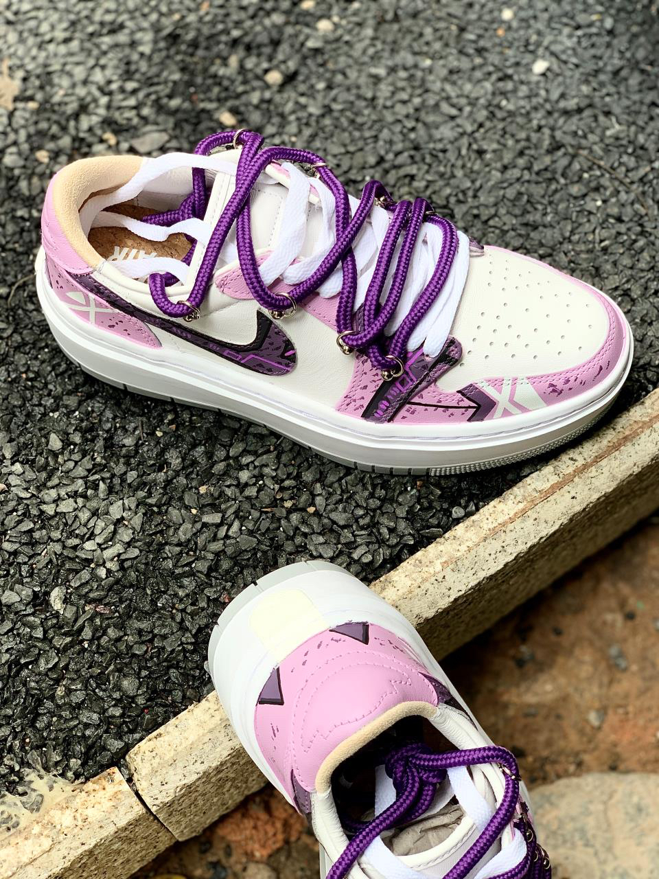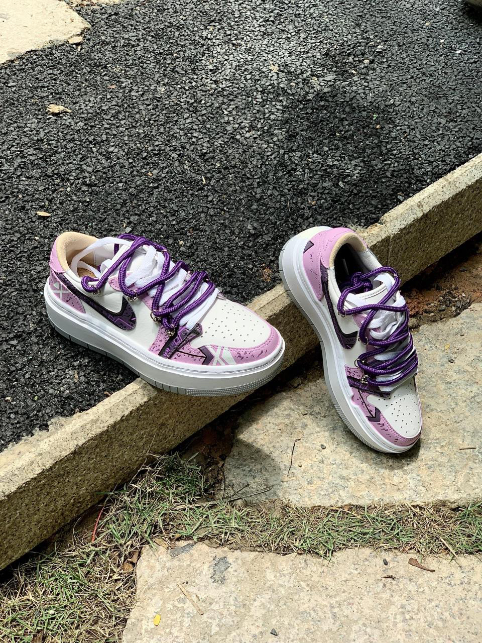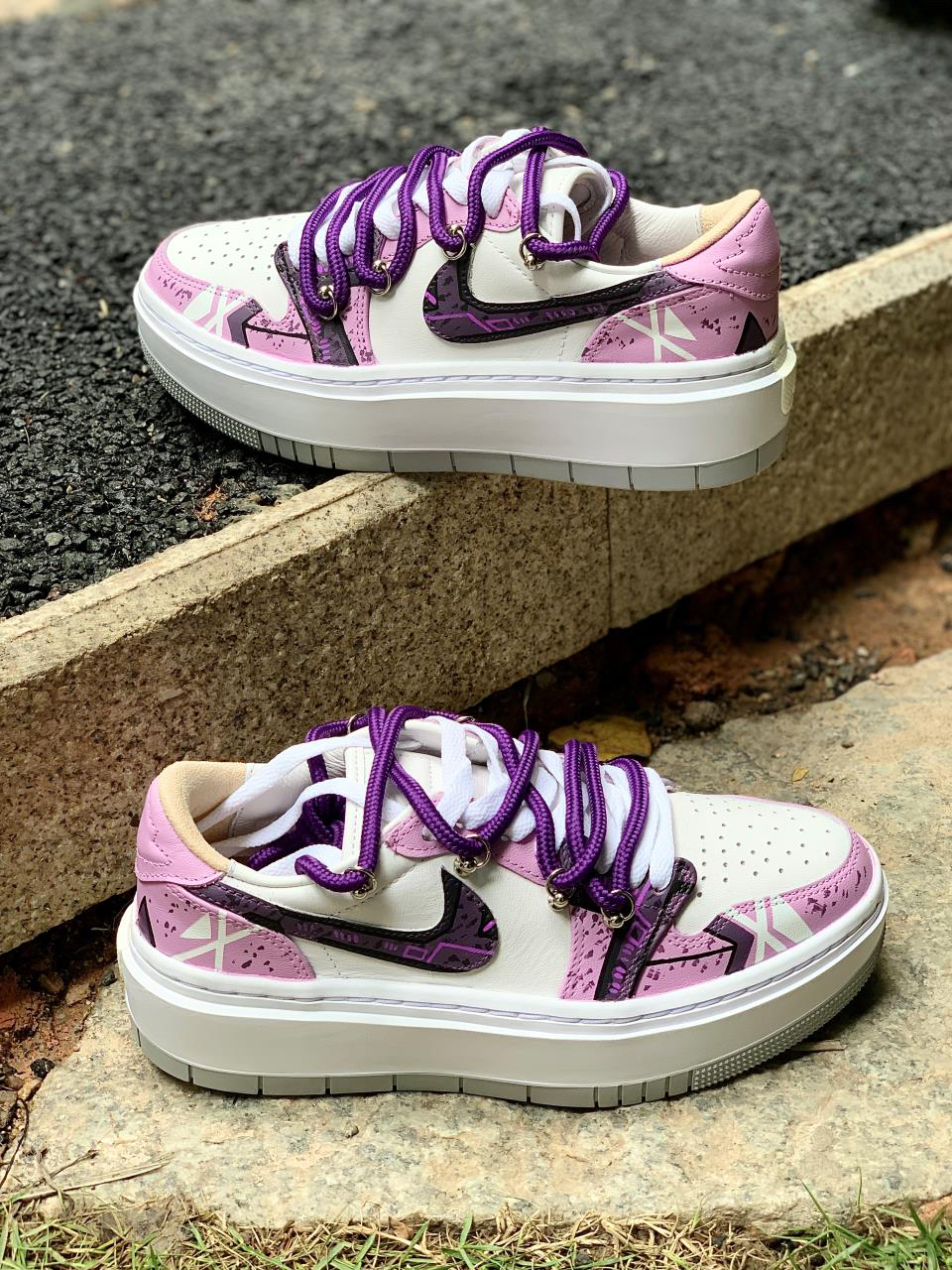 紫色系谁会不爱?分享下这款近期新入手的AJ1 elevate low还是带有赛博朋克元素的实在是太酷啦~ 鞋身紫红白三色相结合,带来不错的视觉效果 看起来颜值很高!鞋身侧面还是带有赛博朋克风的涂鸦,满满机械感,非常酷帅有型,Swoosh也是经过机械风及做旧处理的,鞋带在原有的基础上再添加了一条紫色的登山鞋带,层次感拉满看上去就很好看~ 很适合女生穿的一款板鞋,尤其是小姐姐穿起来不仅增高还很显腿...