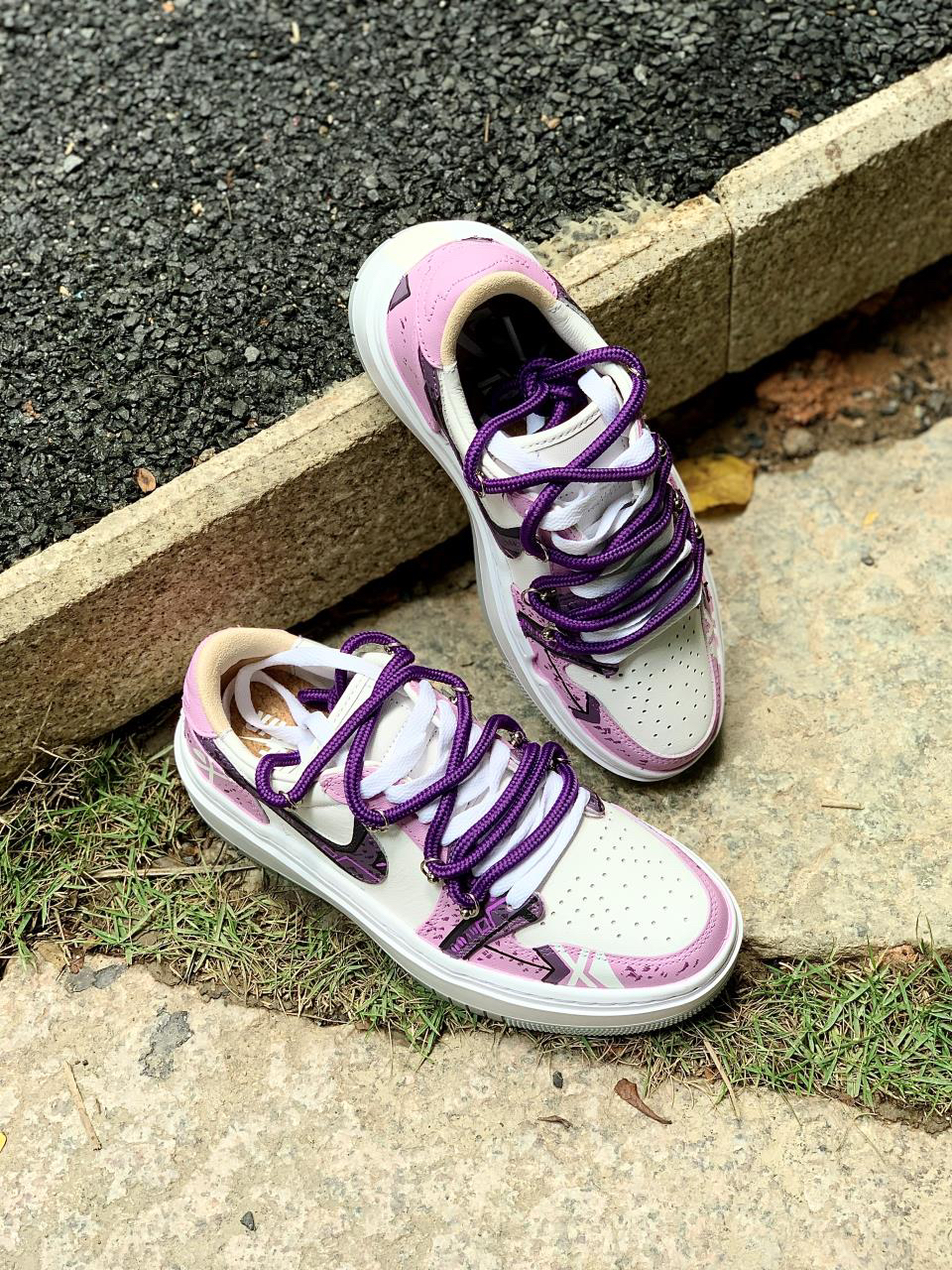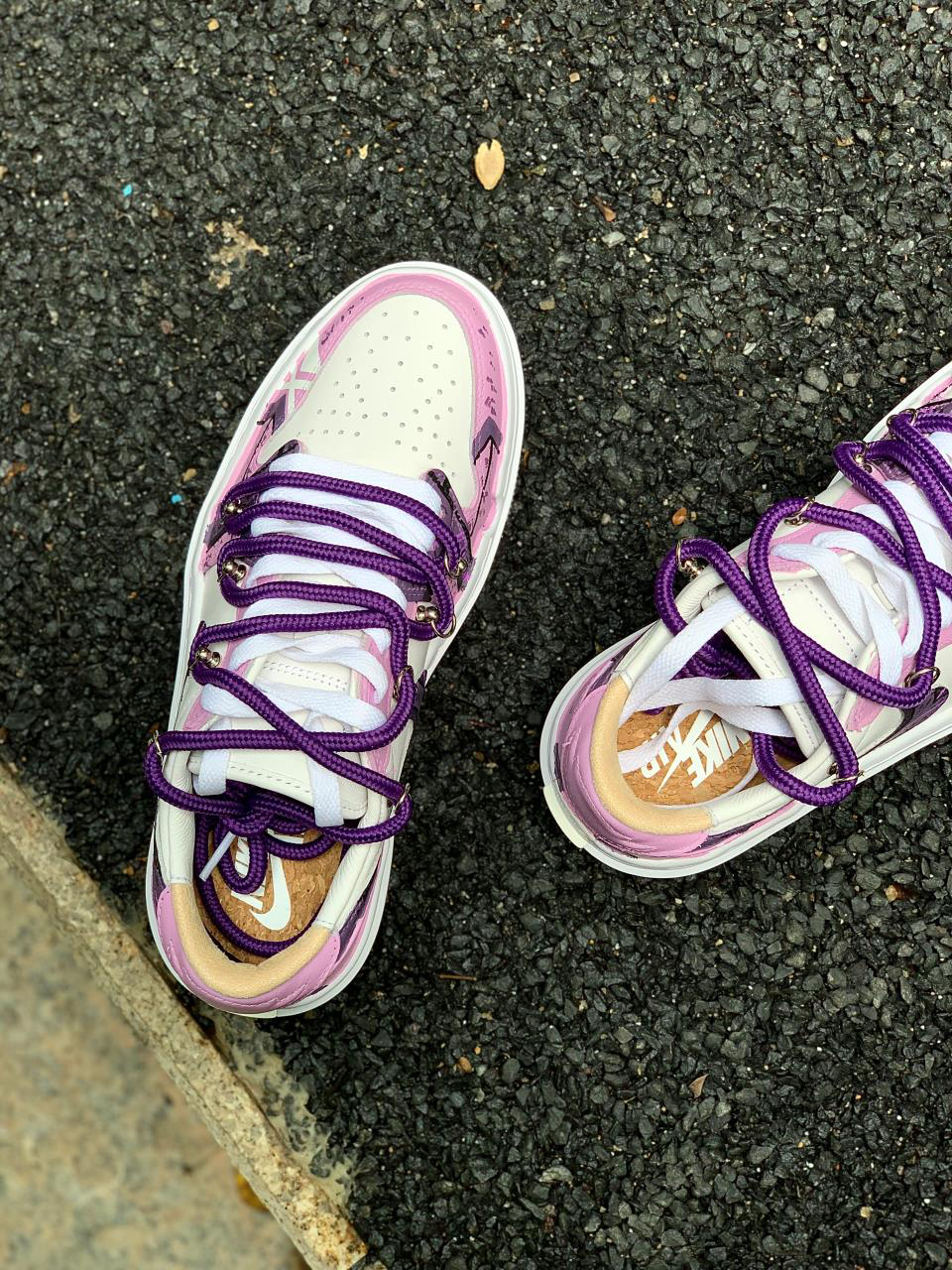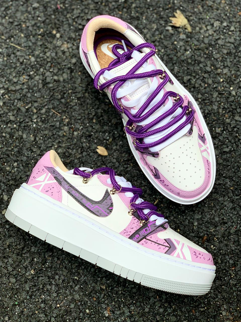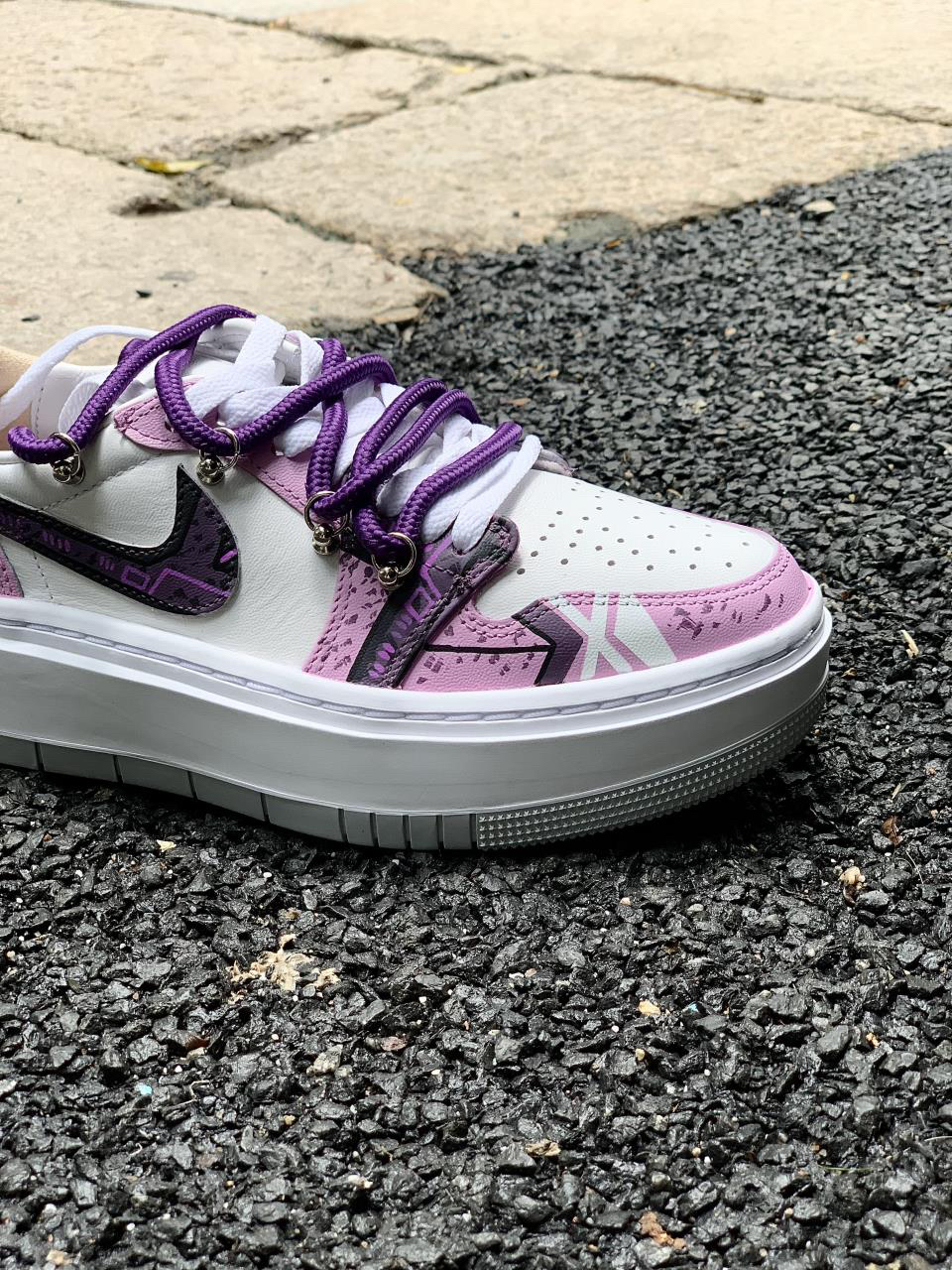 紫色系谁会不爱?分享下这款近期新入手的AJ1 elevate low还是带有赛博朋克元素的实在是太酷啦~ 鞋身紫红白三色相结合,带来不错的视觉效果 看起来颜值很高!鞋身侧面还是带有赛博朋克风的涂鸦,满满机械感,非常酷帅有型,Swoosh也是经过机械风及做旧处理的,鞋带在原有的基础上再添加了一条紫色的登山鞋带,层次感拉满看上去就很好看~ 很适合女生穿的一款板鞋,尤其是小姐姐穿起来不仅增高还很显腿...