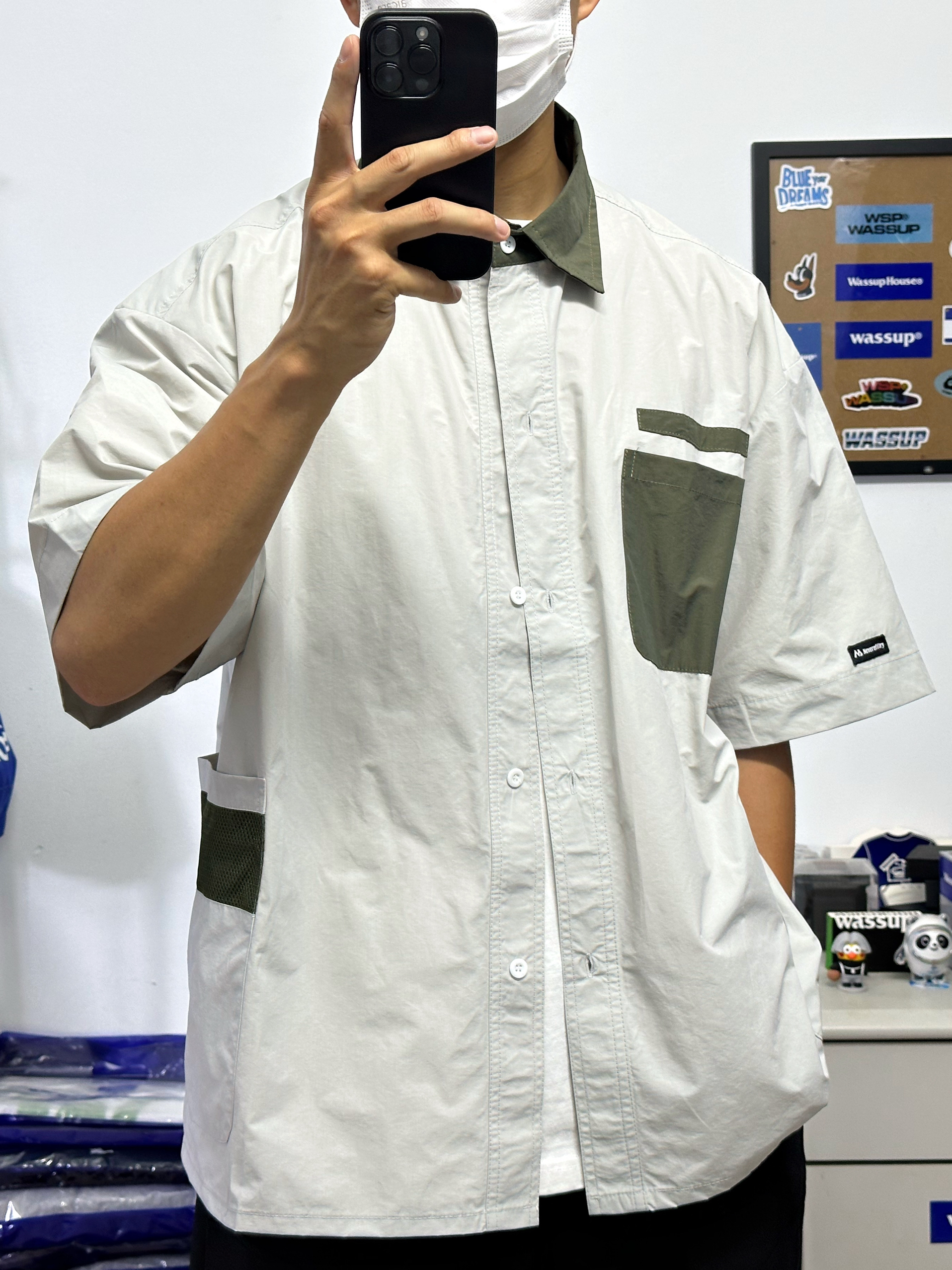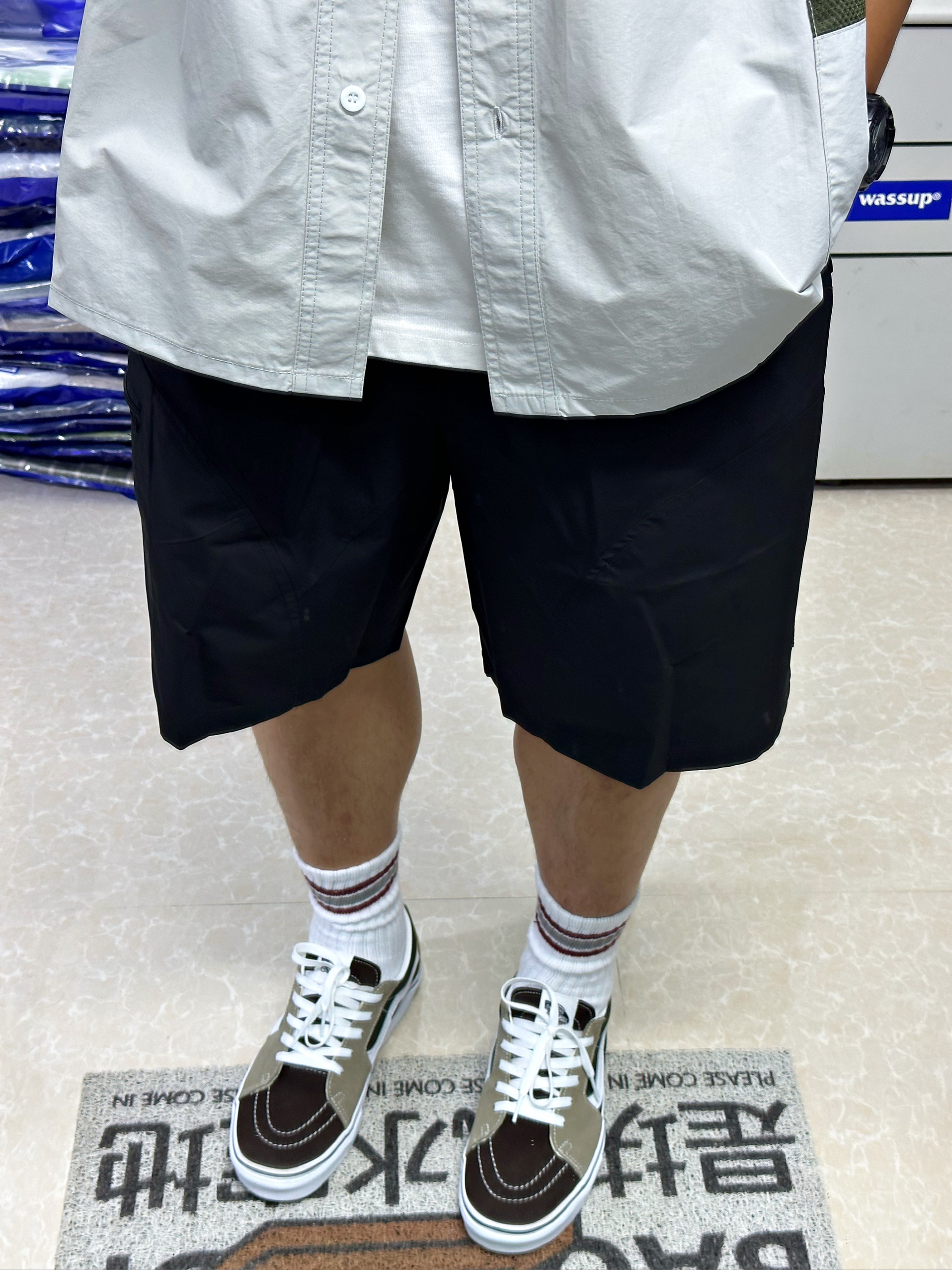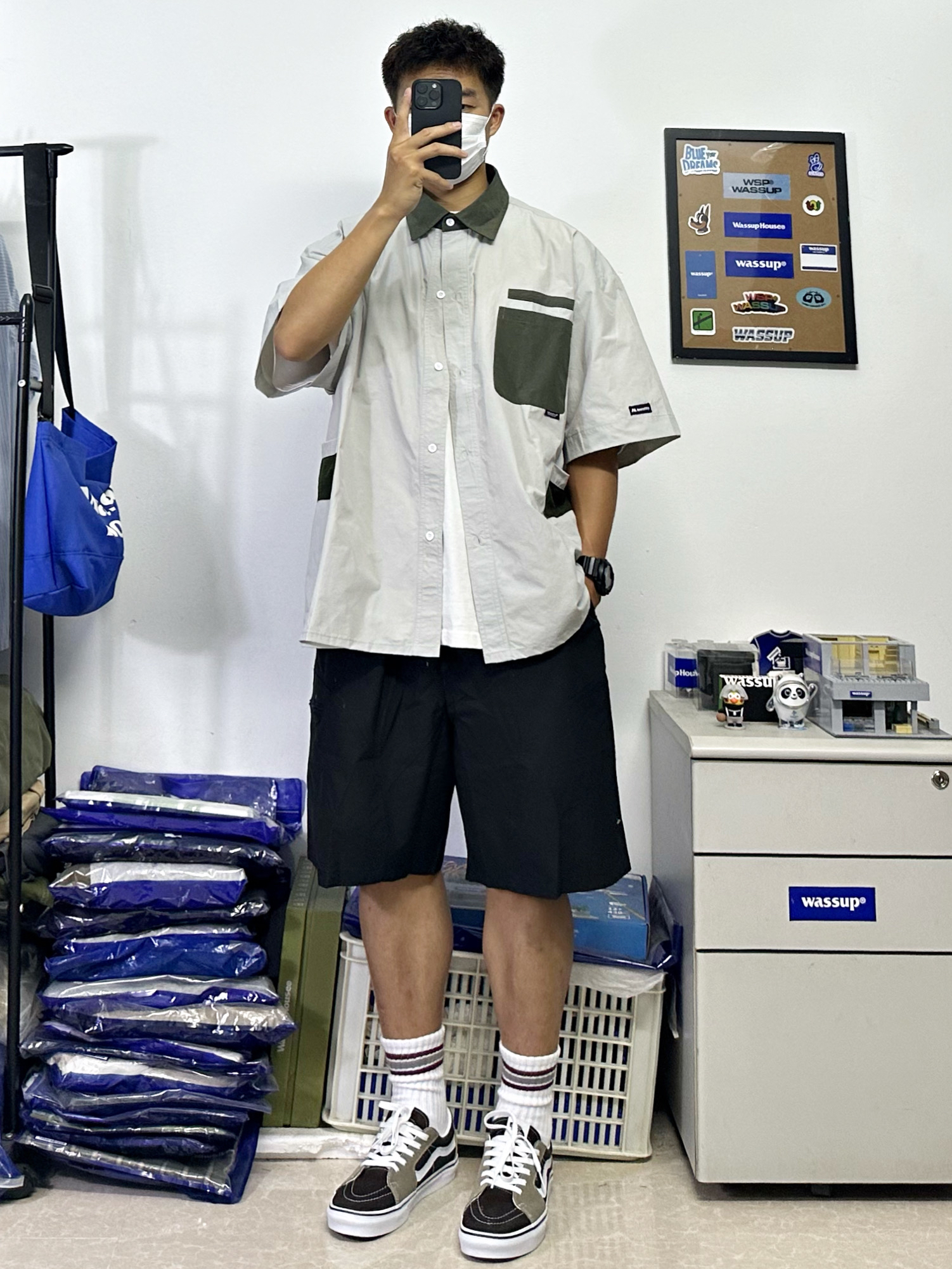 -72kg 尺码上下XL -衬衫胸前小口袋两侧大口袋,面料穿起来很硬挺 -短裤两侧斜口袋,右侧有拉链口袋,面料滑滑的
