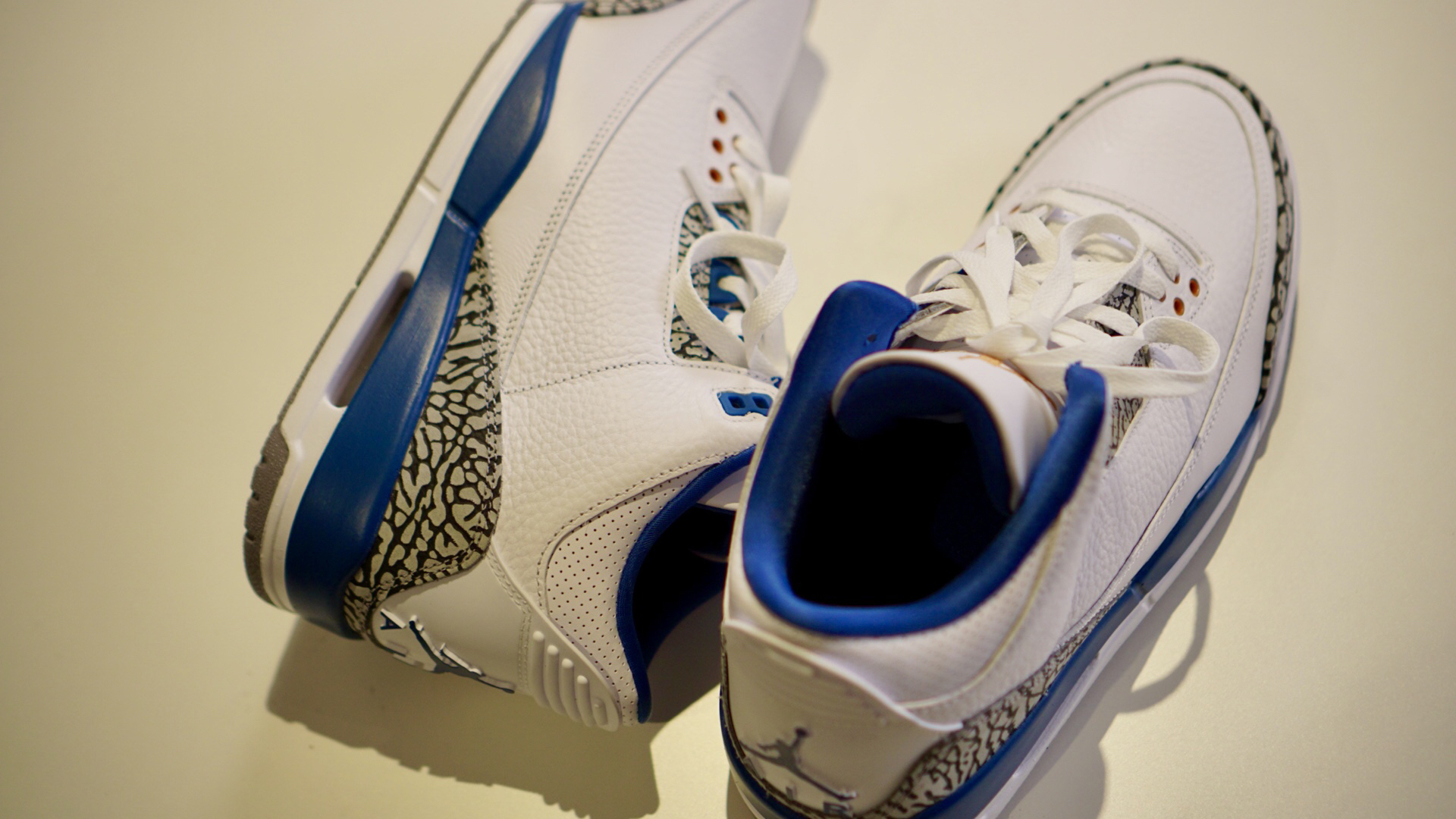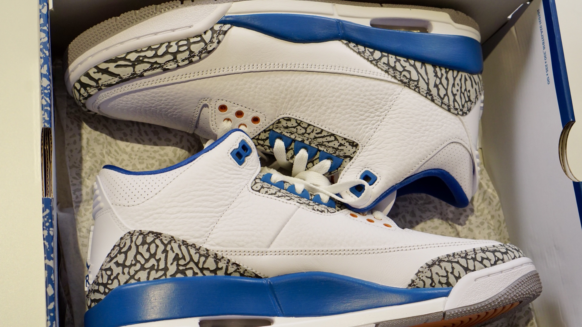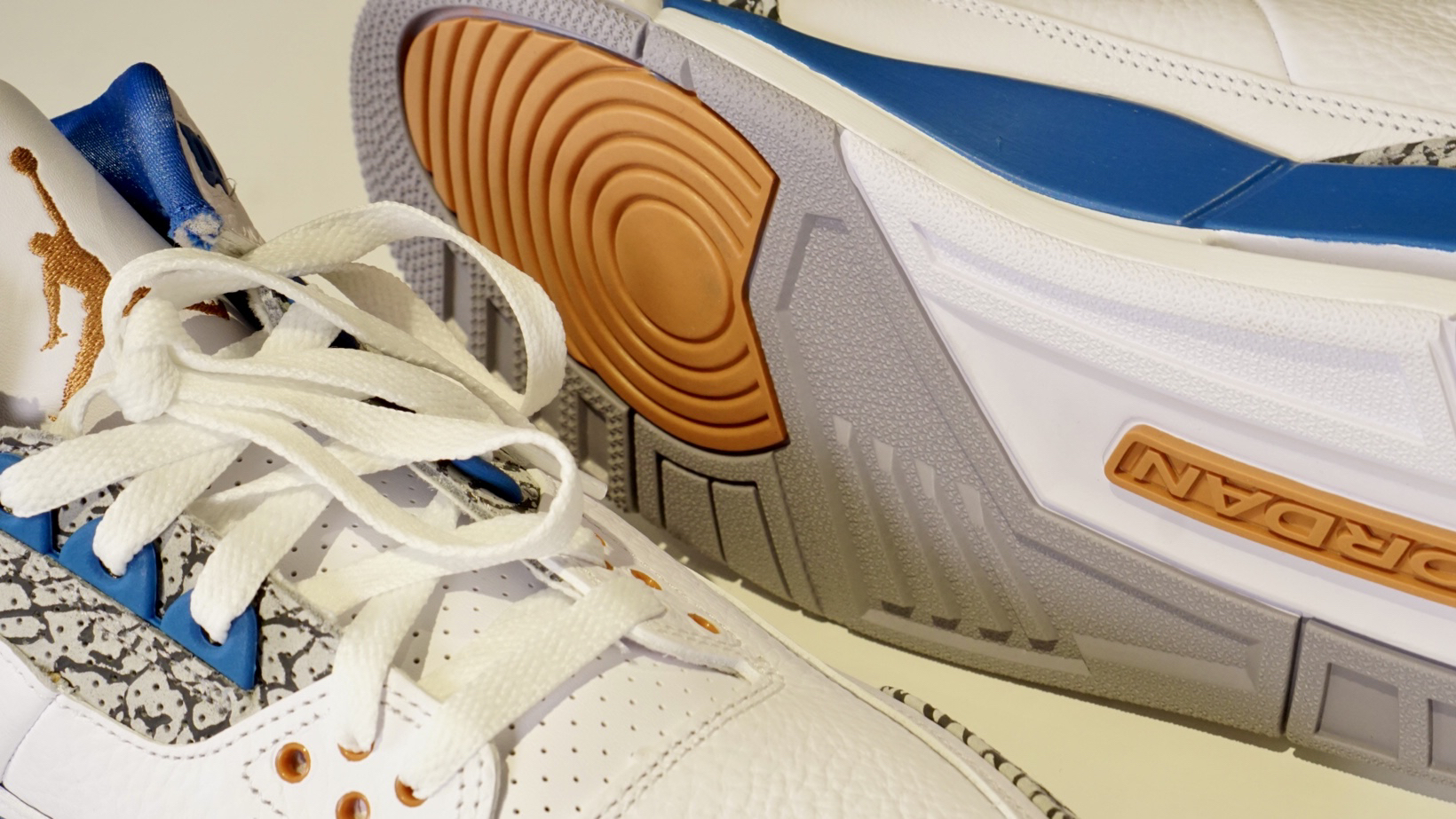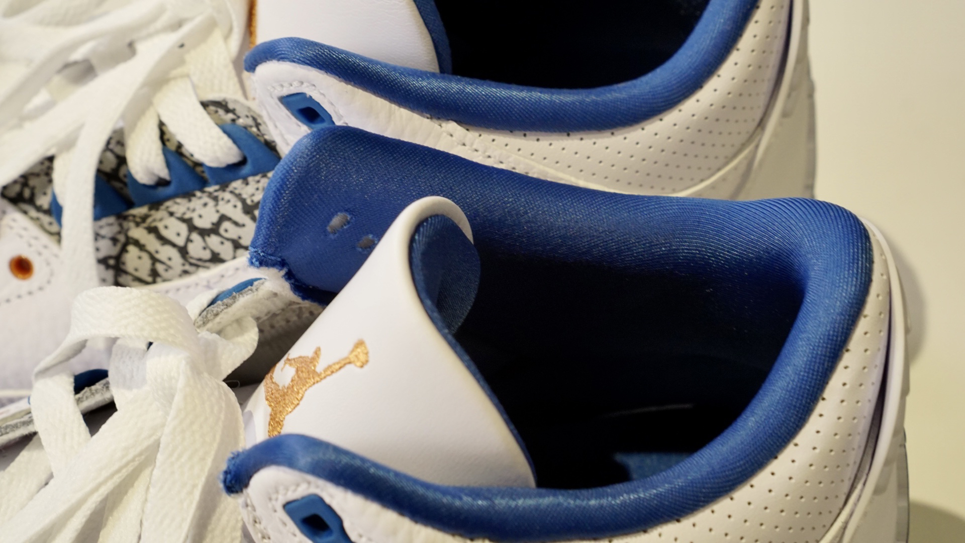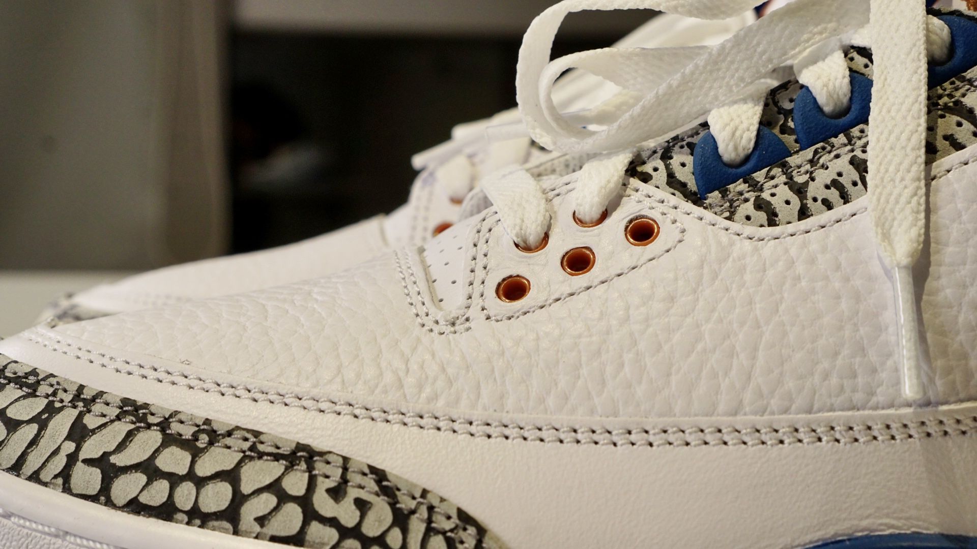 ✅基本符合预期的一双AJ3 ✍🏻先行总结了大家可能比较关心的点 1⃣️👟 皮质采用了纹理较深的荔枝皮(有点像18年的黑水泥),是那种容易起褶皱的皮质,皮质和今年白水泥有不少的差距。 2⃣️⚪️🔵 以16年的真蓝对比,区别点除了皮质更软 表面褶皱更多以外,还有以下几个 1.点缀的红 改成了铜色 2.后跟由Nike 改成了飞人 3.内衬由毛巾底材质 改成了丝面织物 4.厚鞋舌改成了薄鞋舌 5.其他一些...