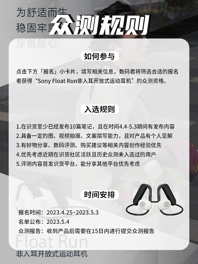 【识货众测 | 【Sony Float Run 悬浮豆 非入耳开放式运动耳机】体验官招募!】,由用户 识货数码君 分享,来自上海。这是一篇来自识货社区的真实用户分享笔记。