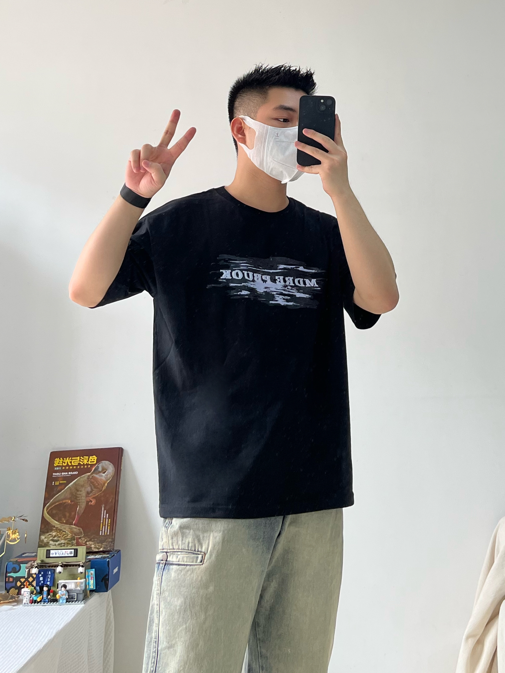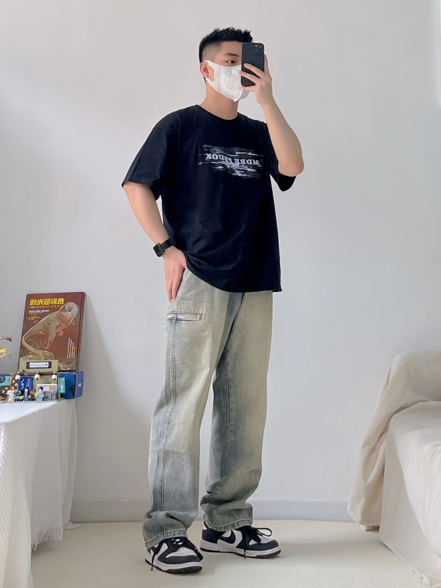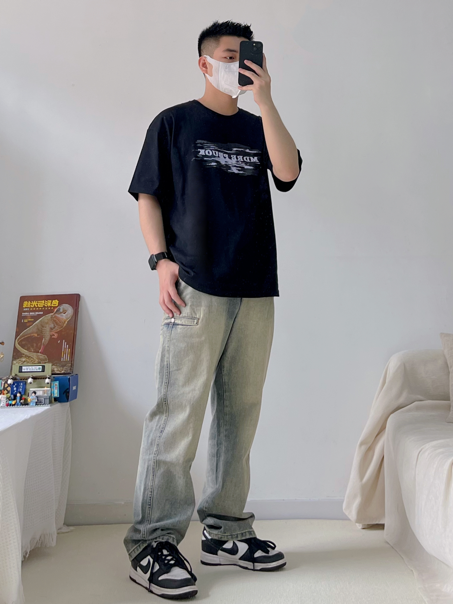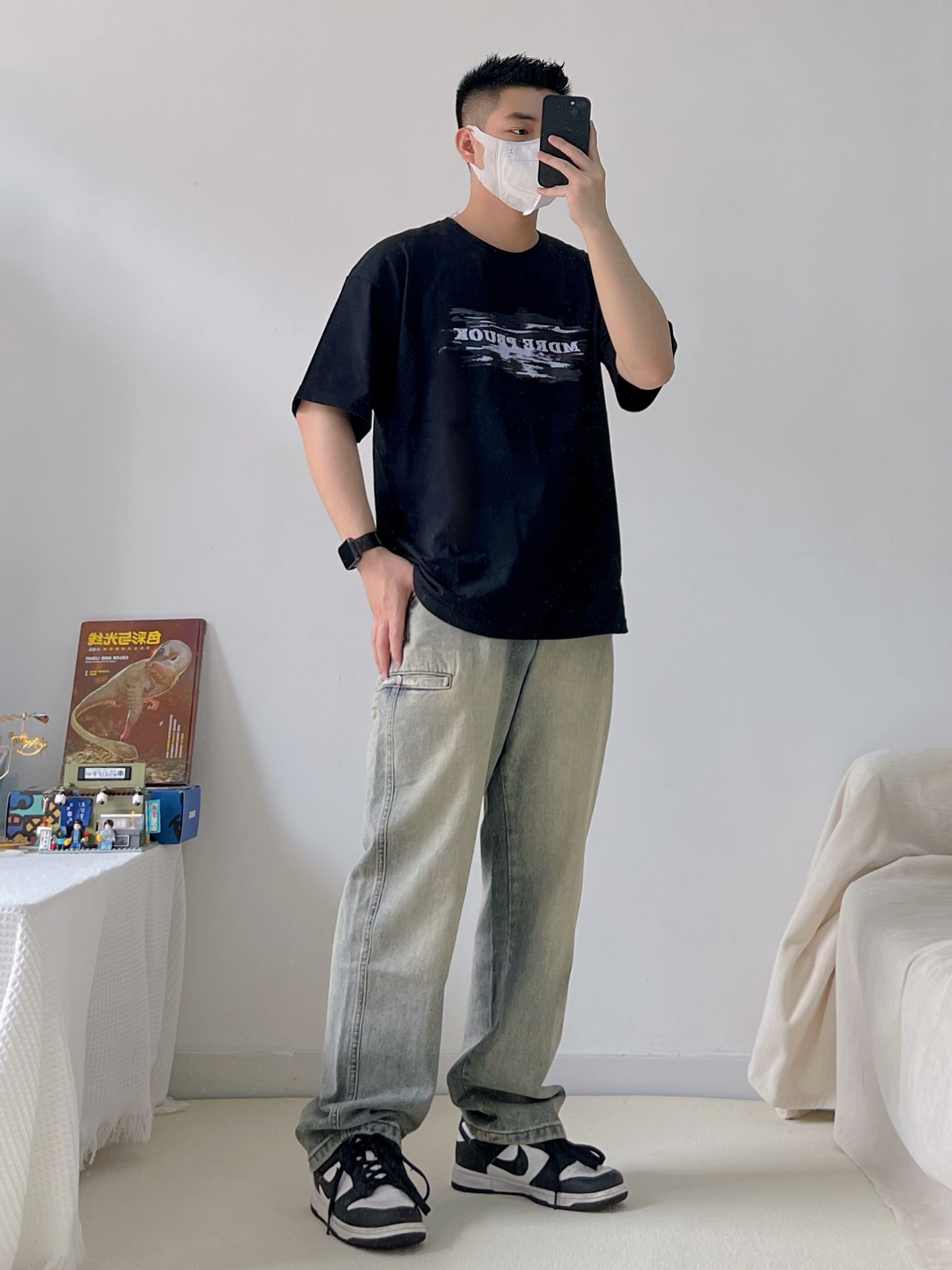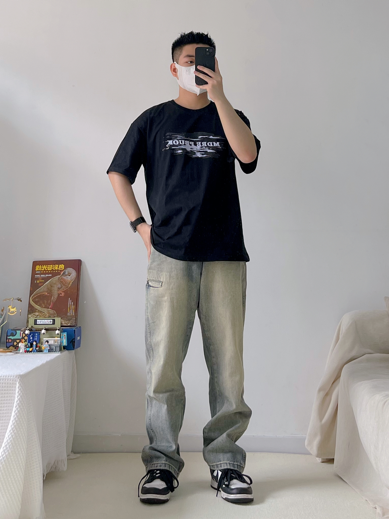 身高165cm,体重127斤,微胖小个子男生😭 黑色的短袖上身就显瘦呀,前面的印花酷酷的~ 搭配一条黄泥色牛仔裤,宽松直筒版型,显高显瘦,不挑腿型✅