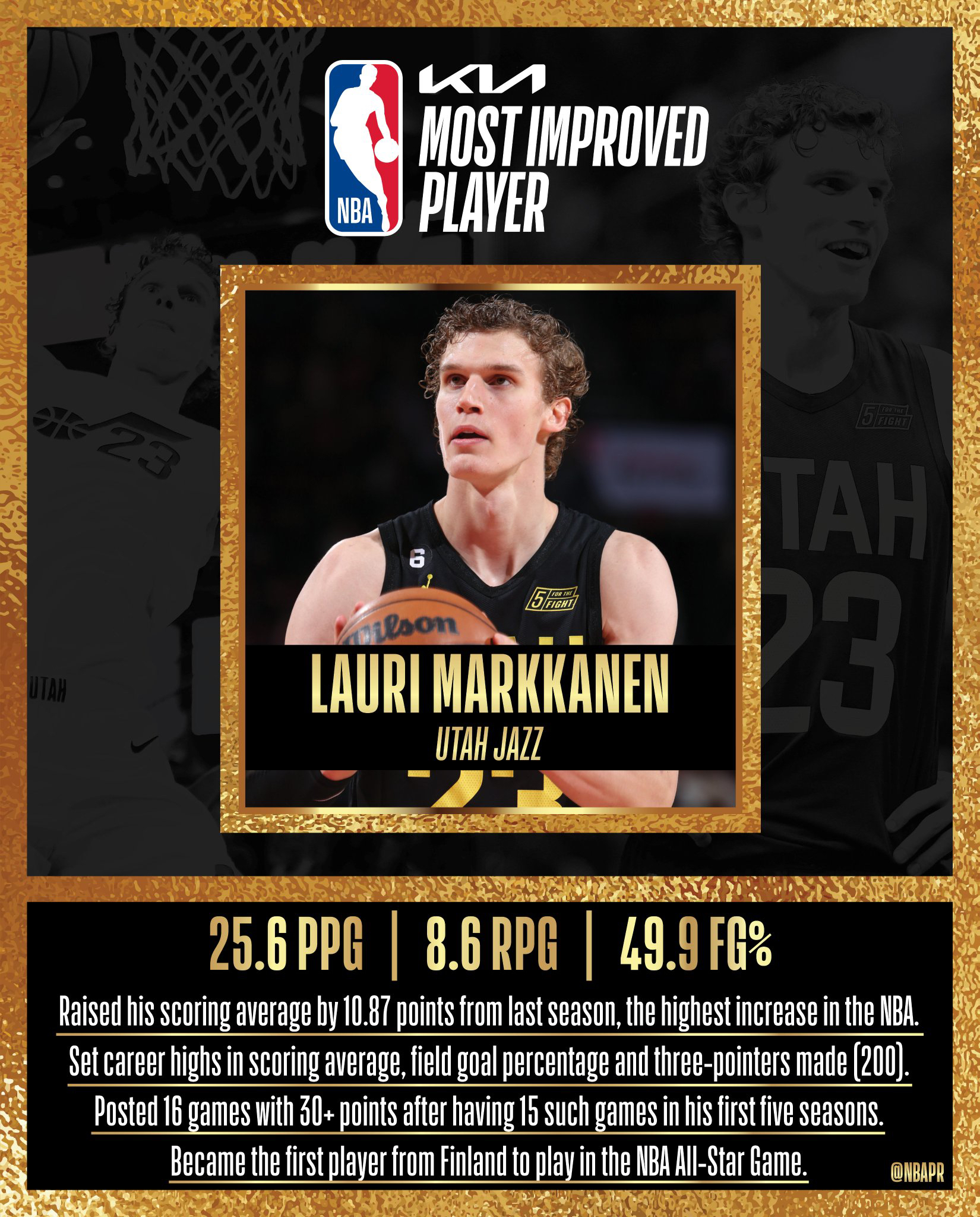 Lauri Markkanen当选本赛季最快进步球员! 14.8 PPG | 5.7 RPG ➡️ 25.6 PPG | 8.6 RPG 首次入选全明星