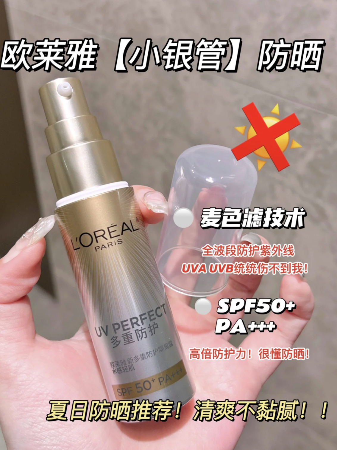 本篇笔记关联了【李沛恩同款】L'OREAL/欧莱雅 小银管隔离防晒霜 清爽水感多重防护不粘腻 旧版30ml SPF50+/PA+++、【小样】L'OREAL/欧莱雅 小银管防晒霜 SPF50+/PA+++ 多重防紫外线清爽护理 清爽防汗等商品,为用户提供真实的使用体验和购买参考。