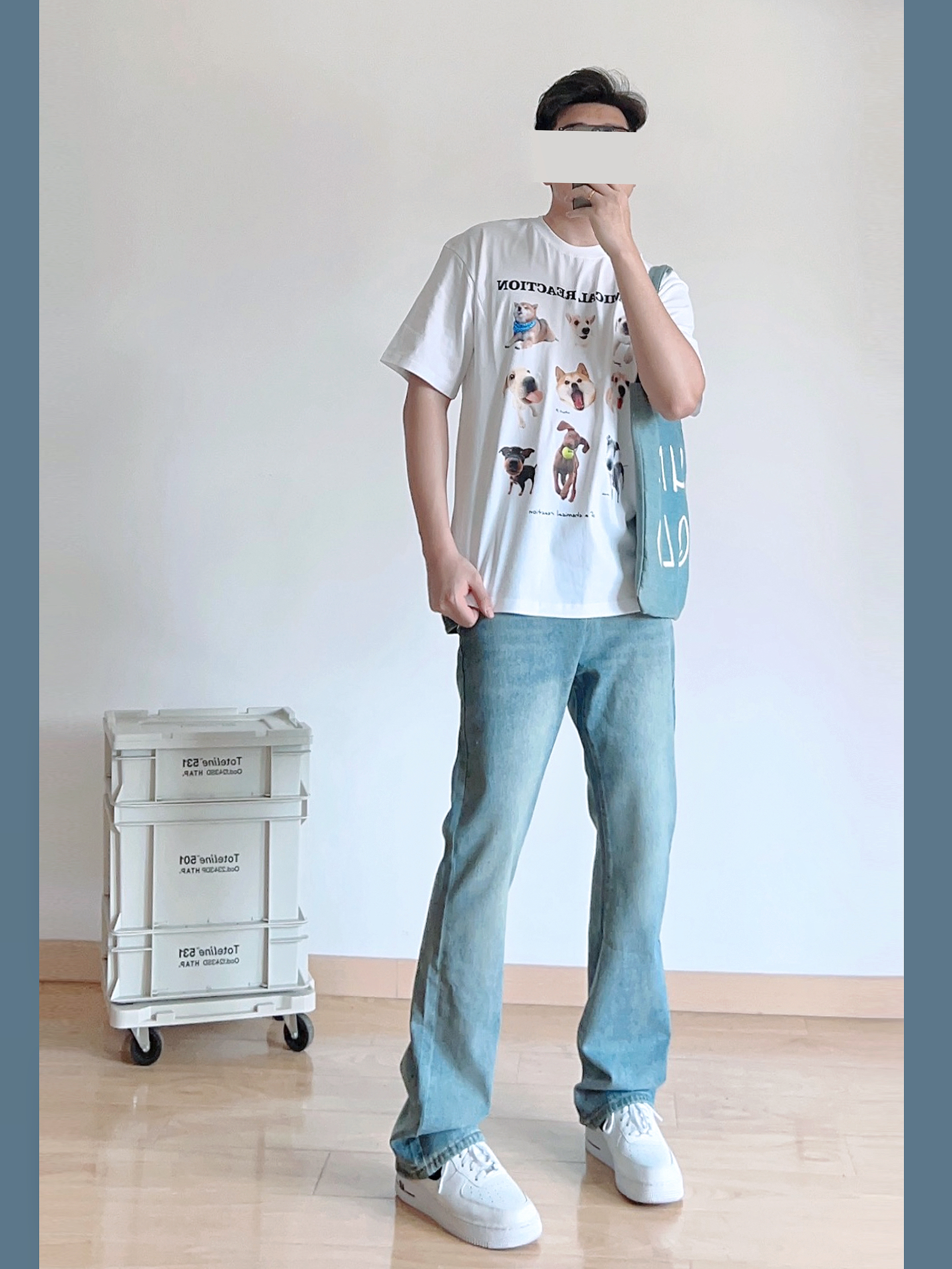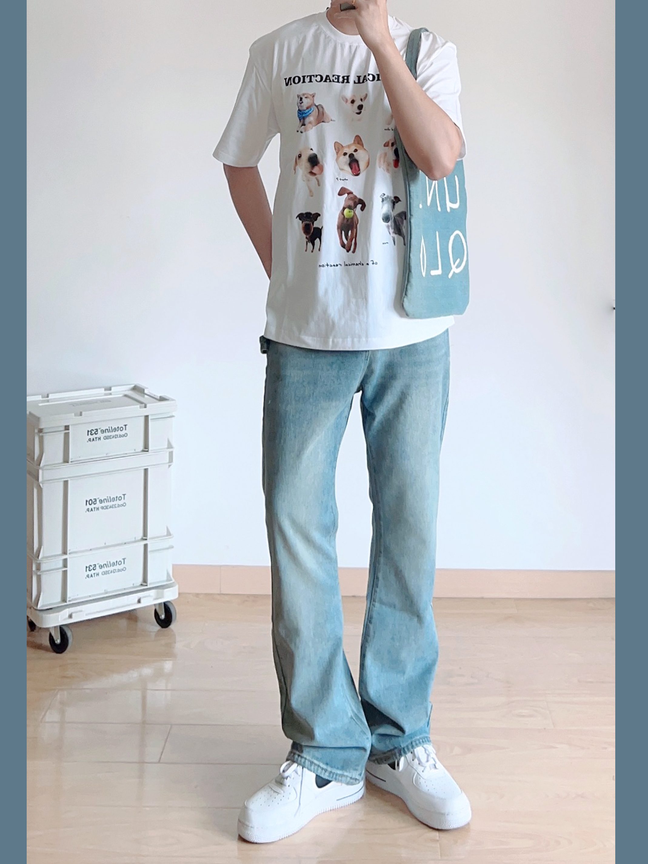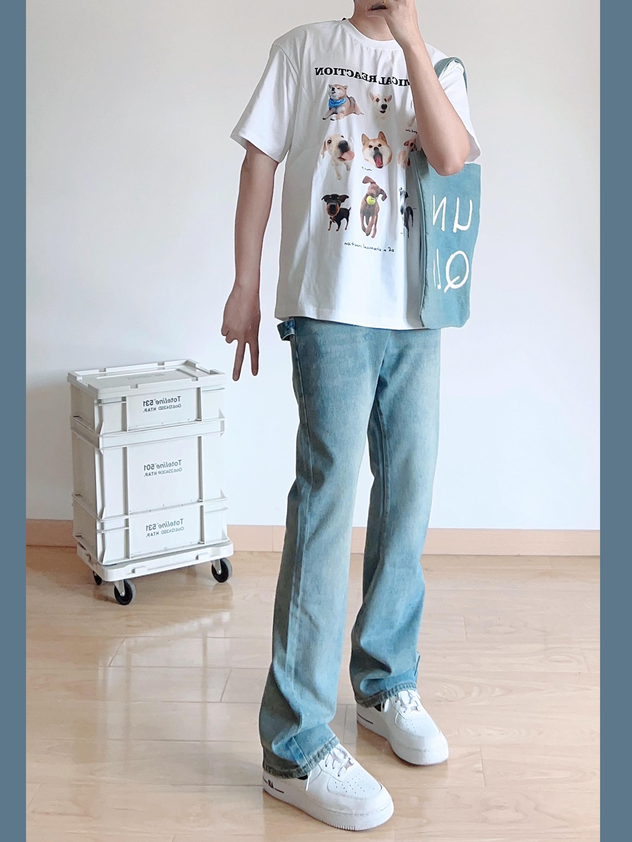 这套真的爱住了! 白色趣味小狗T恤 搭配冰蓝色水洗做旧牛仔裤 好看的白蓝撞色~ 夏季主打的就是清爽!