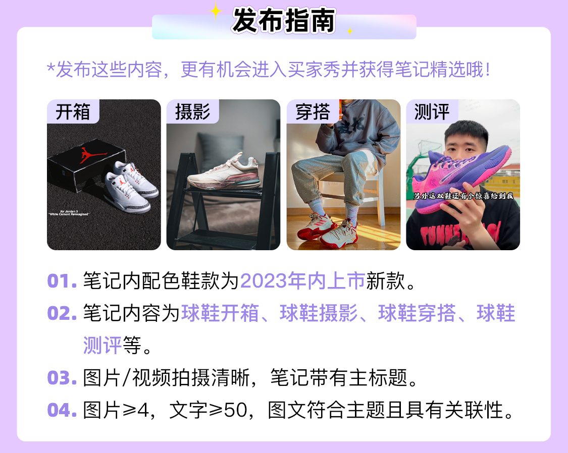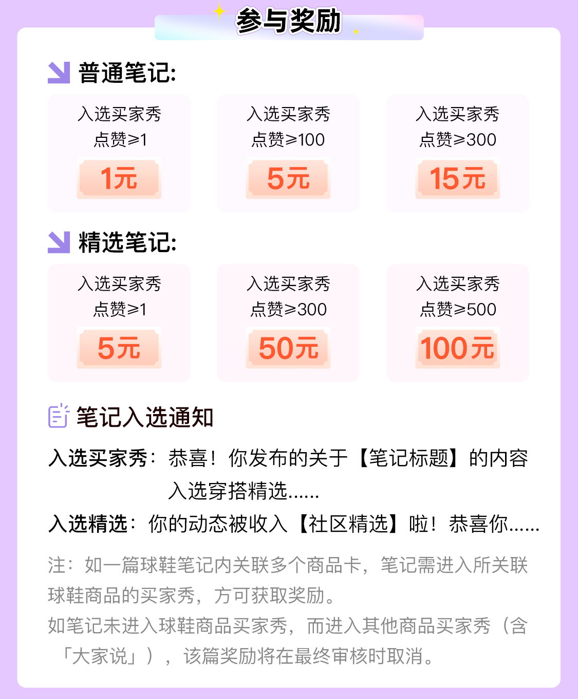 球鞋买家秀返现限时开启,笔记入选买家秀必得现金,一篇最高100元。 ☀【参与方式】 2024.4.19-5.13,打开识货APP-社区,发布原创球鞋内容笔记,关联话题#球鞋买家秀返现 并正确添加商品卡,即可成功参与活动。 ☀【参予奖励】 普通笔记(需为球鞋笔记): 入选买家秀且点赞≥1 返现1元 入选买家秀且点赞≥100 返现5元 入选买家秀且点赞≥300 返现15元 精选笔记(...
