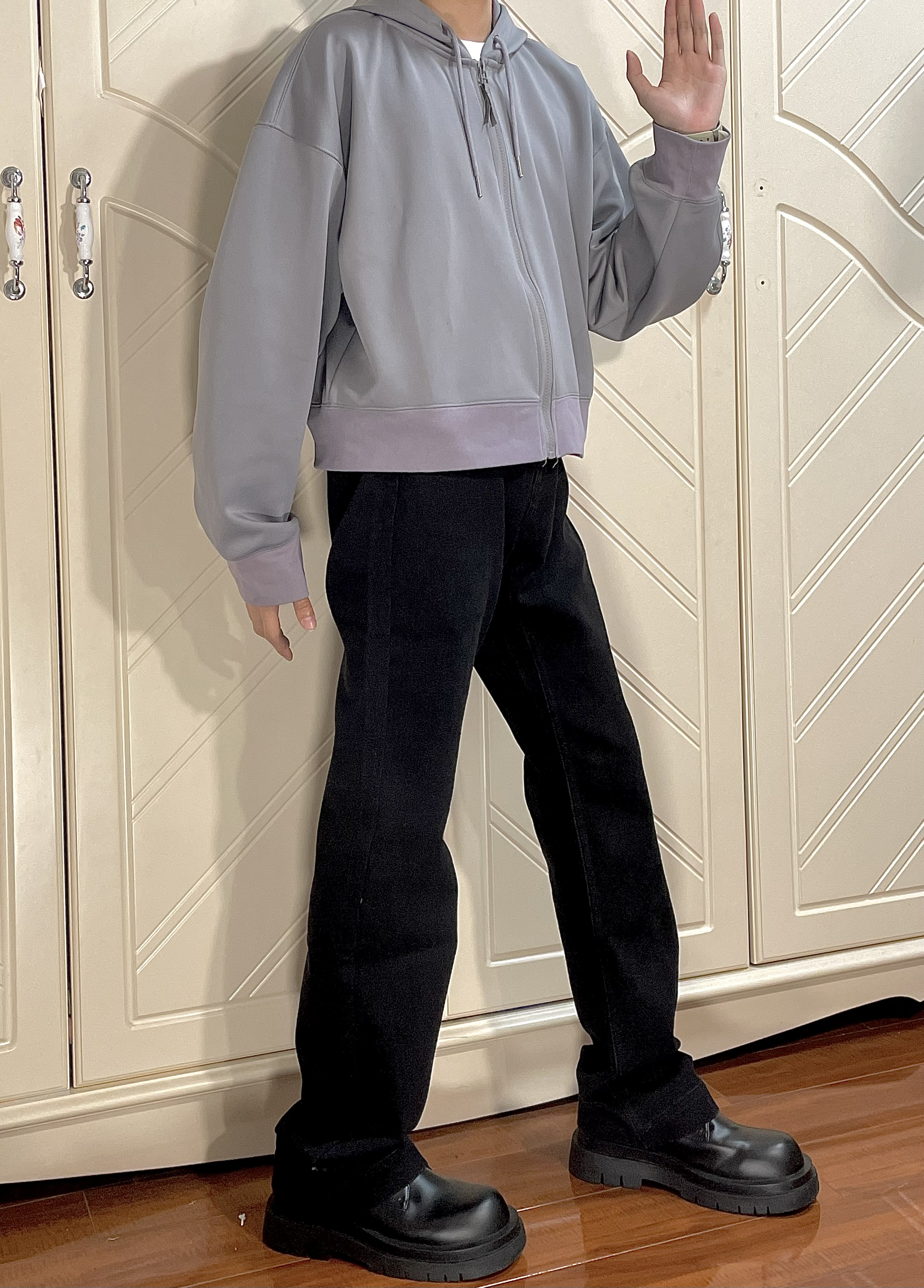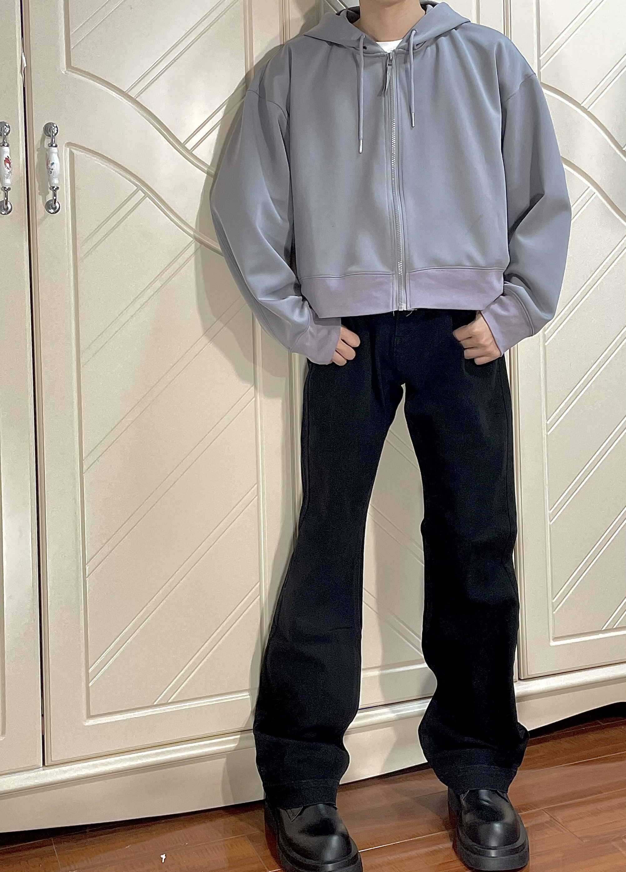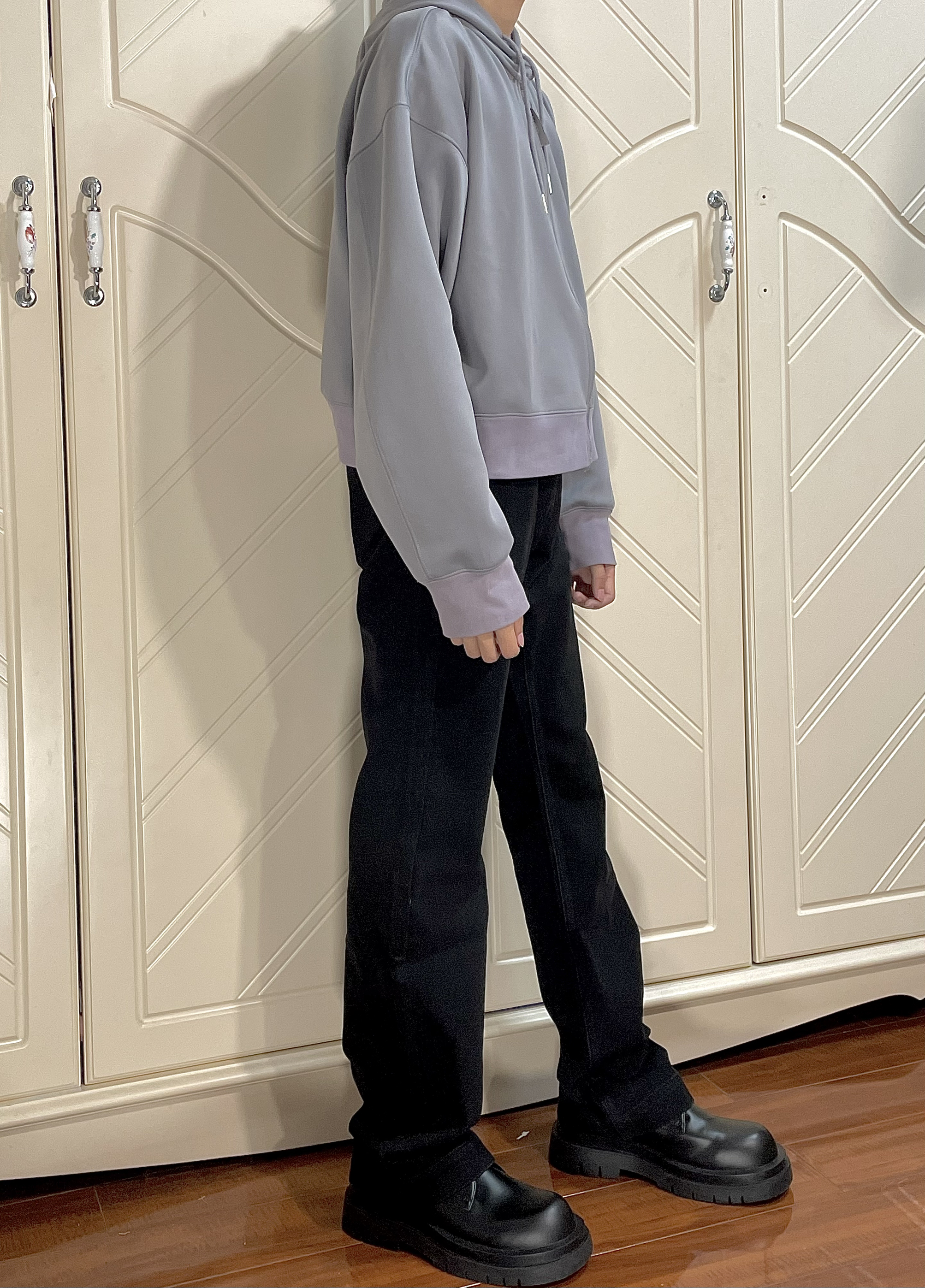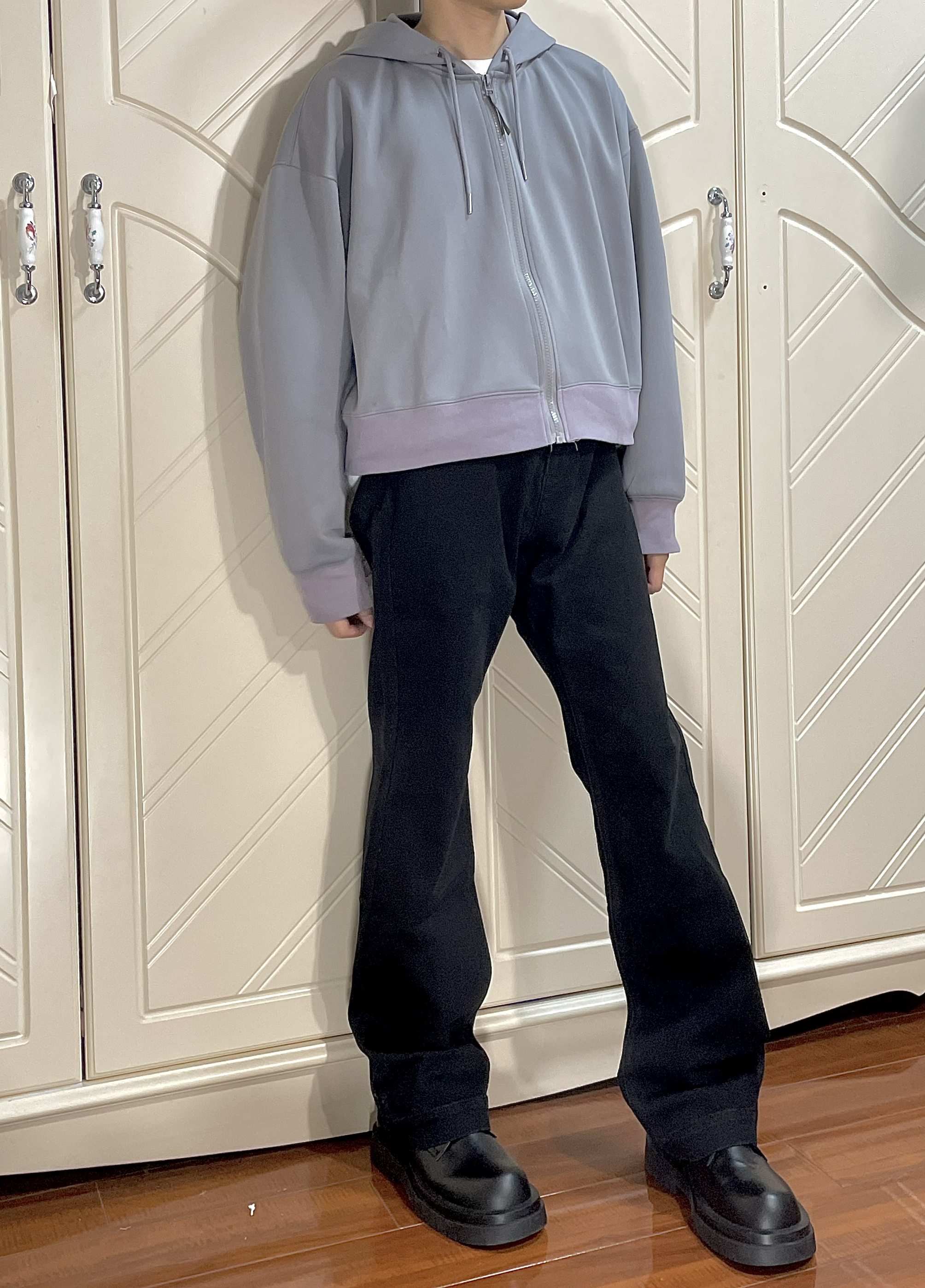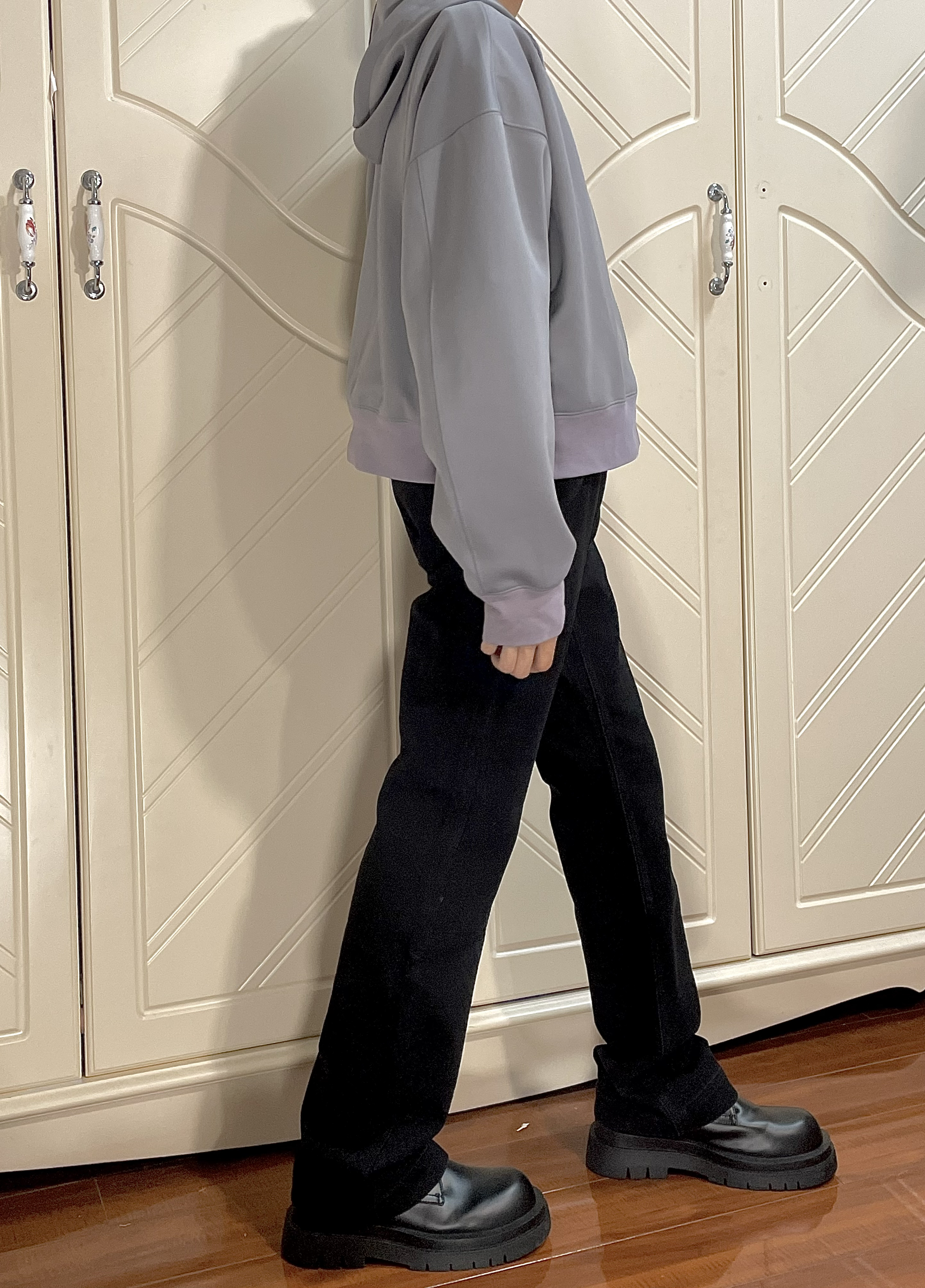 这条牛仔裤很厚实,而且版型也很微喇设计,很修饰腿型,很显高!165/45穿M嘛
