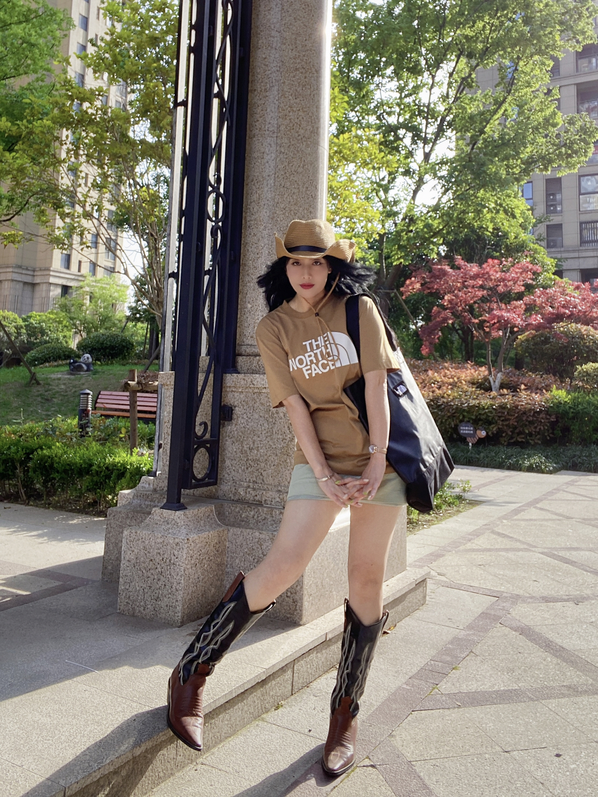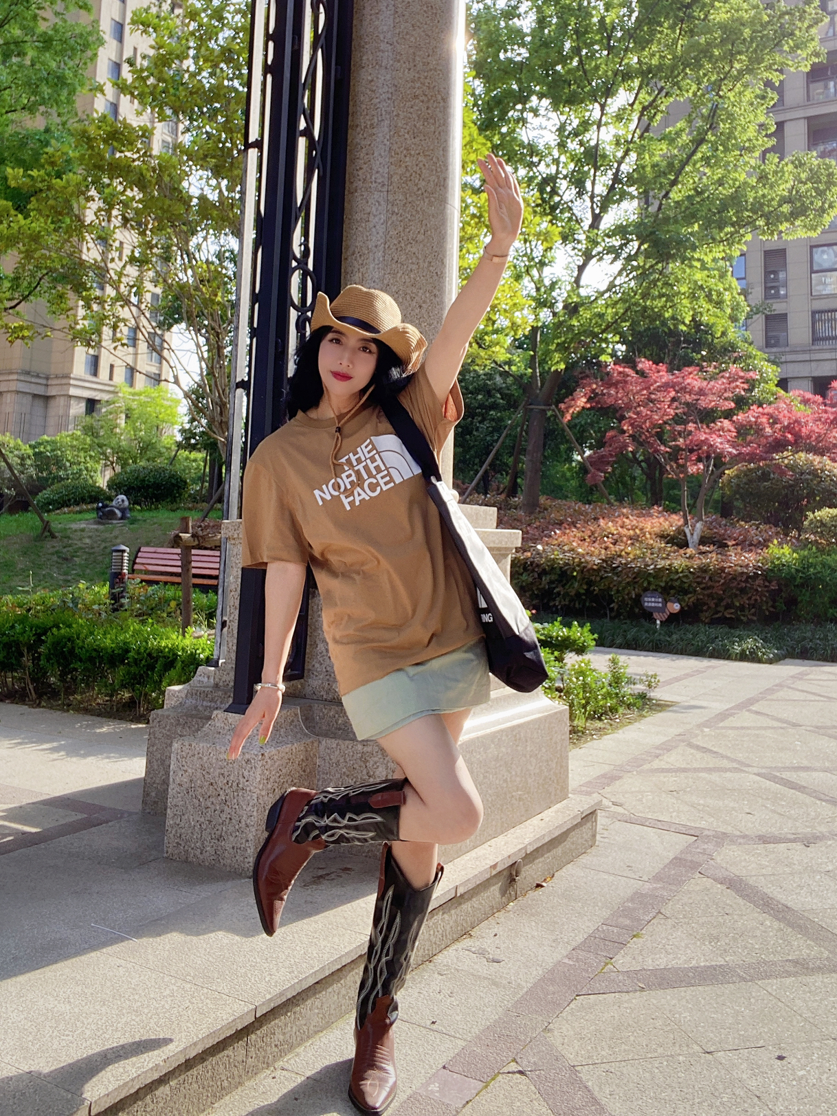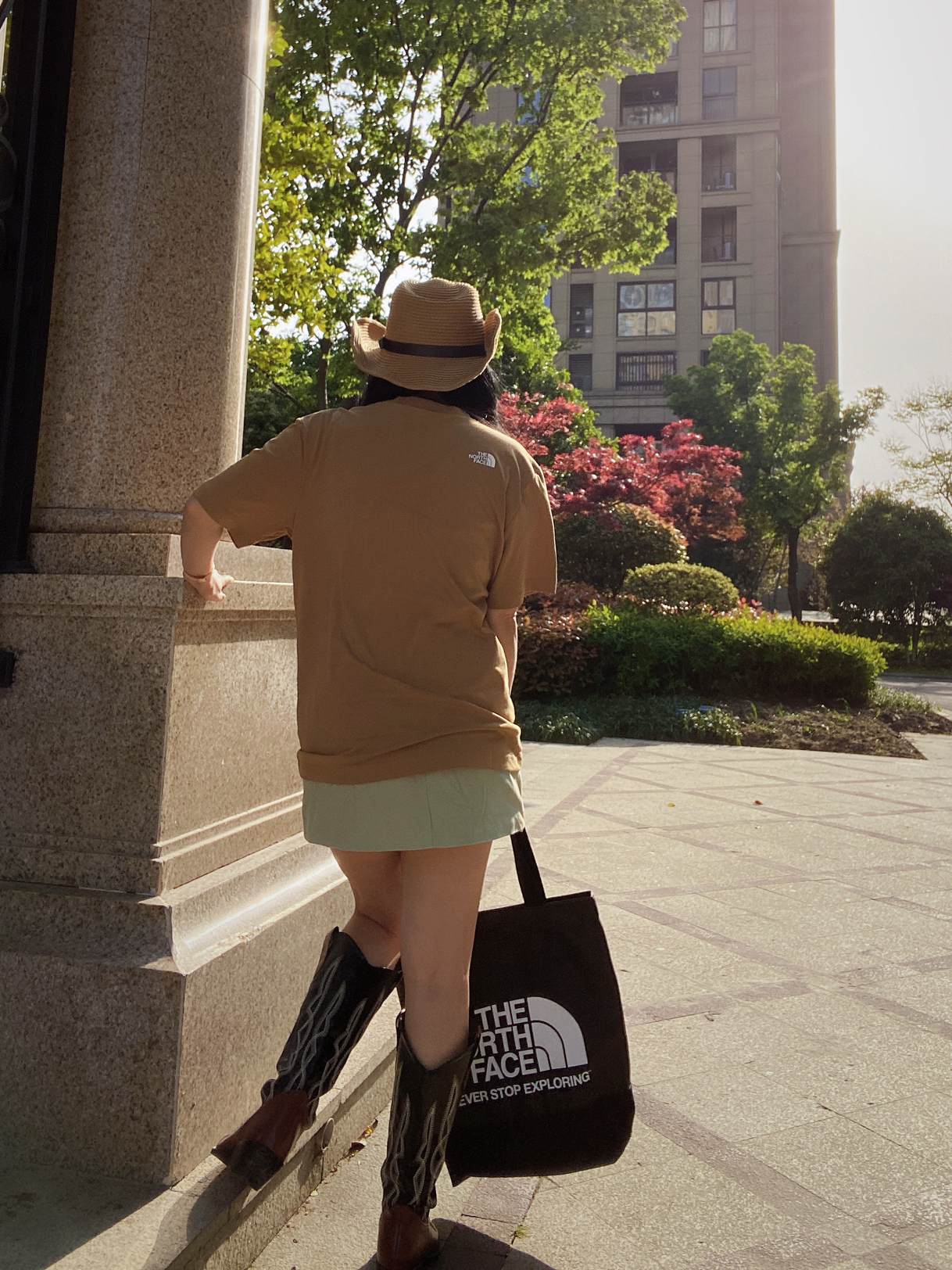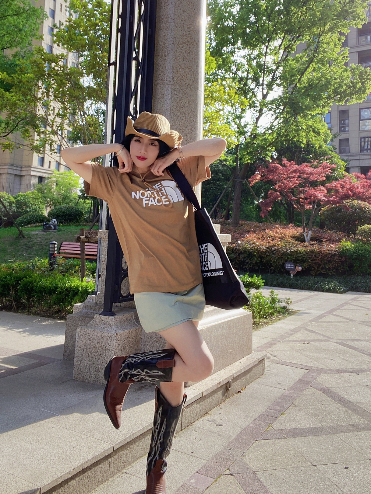 💕身高162.体重98.尺码M ✨✨✨✨✨✨✨✨ 今天是美式复古风的校园穿搭 👕/北面棕色短袖T恤 棕色就是美式风的代表色, THE NORTH FACE 的棕色T恤,棉感面料,柔软透气,大大的logo,很有代表性!宽松版型,特别能藏肉 👗/浅绿色小半裙 浅绿色小半裙,很清凉的颜色,特别适合夏天 短短裙长,teb格式小个子女生 棕色西部牛仔帽子🧢,搭配西部风格棕色🏾长靴👢,整套特别浓郁的美式复古...