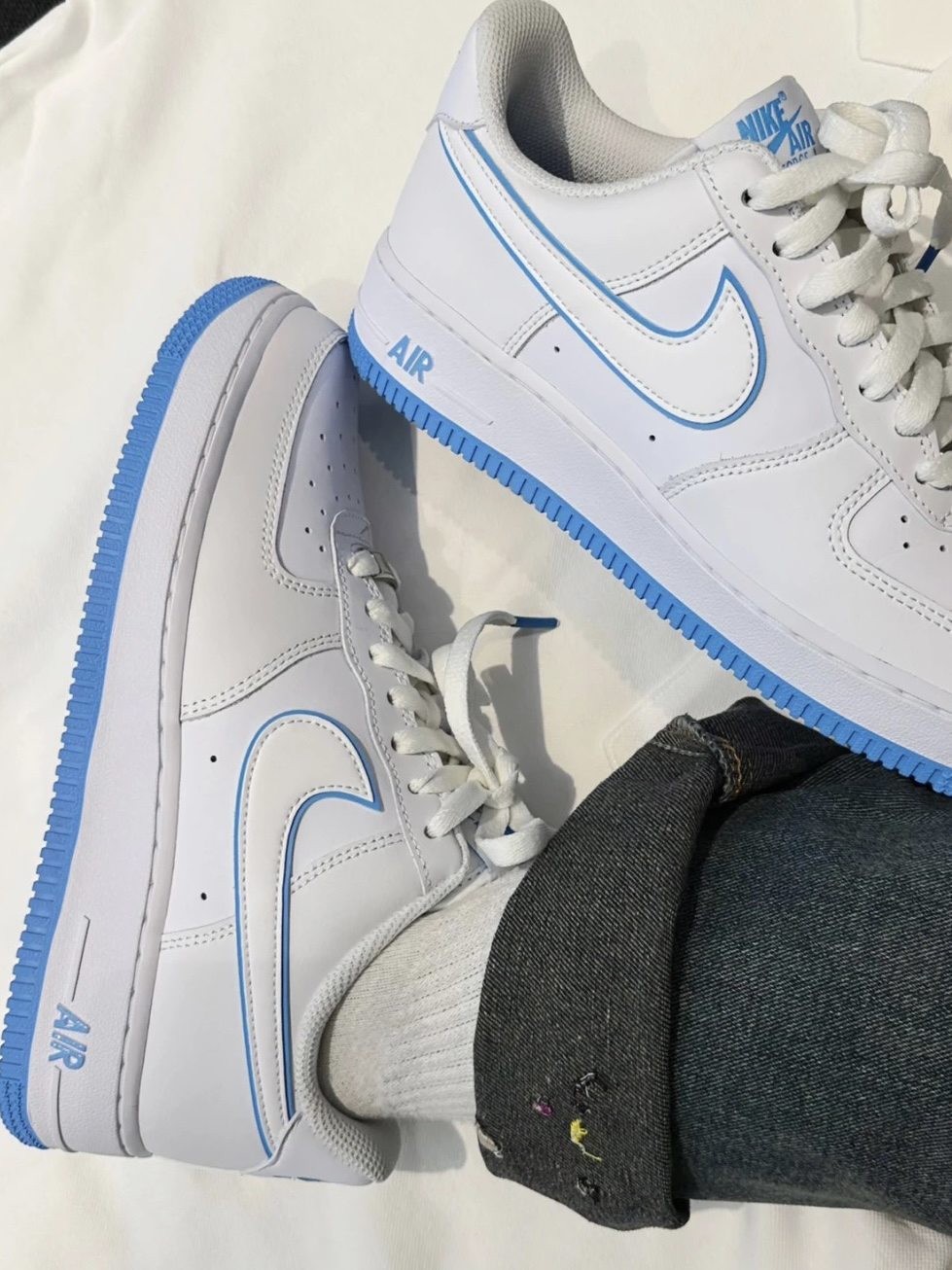 又发现一双大学蓝空军一号 天空蓝真的猴猴看太适合夏天了吧 后跟蓝色刺绣logo 小细节更抓我 颜值好高 鞋面也是很好打理 简约白又百搭 码数个人觉得空军版型正常码 不偏小🦶 不说了 我要穿出街了 兄弟们 你觉得如何?