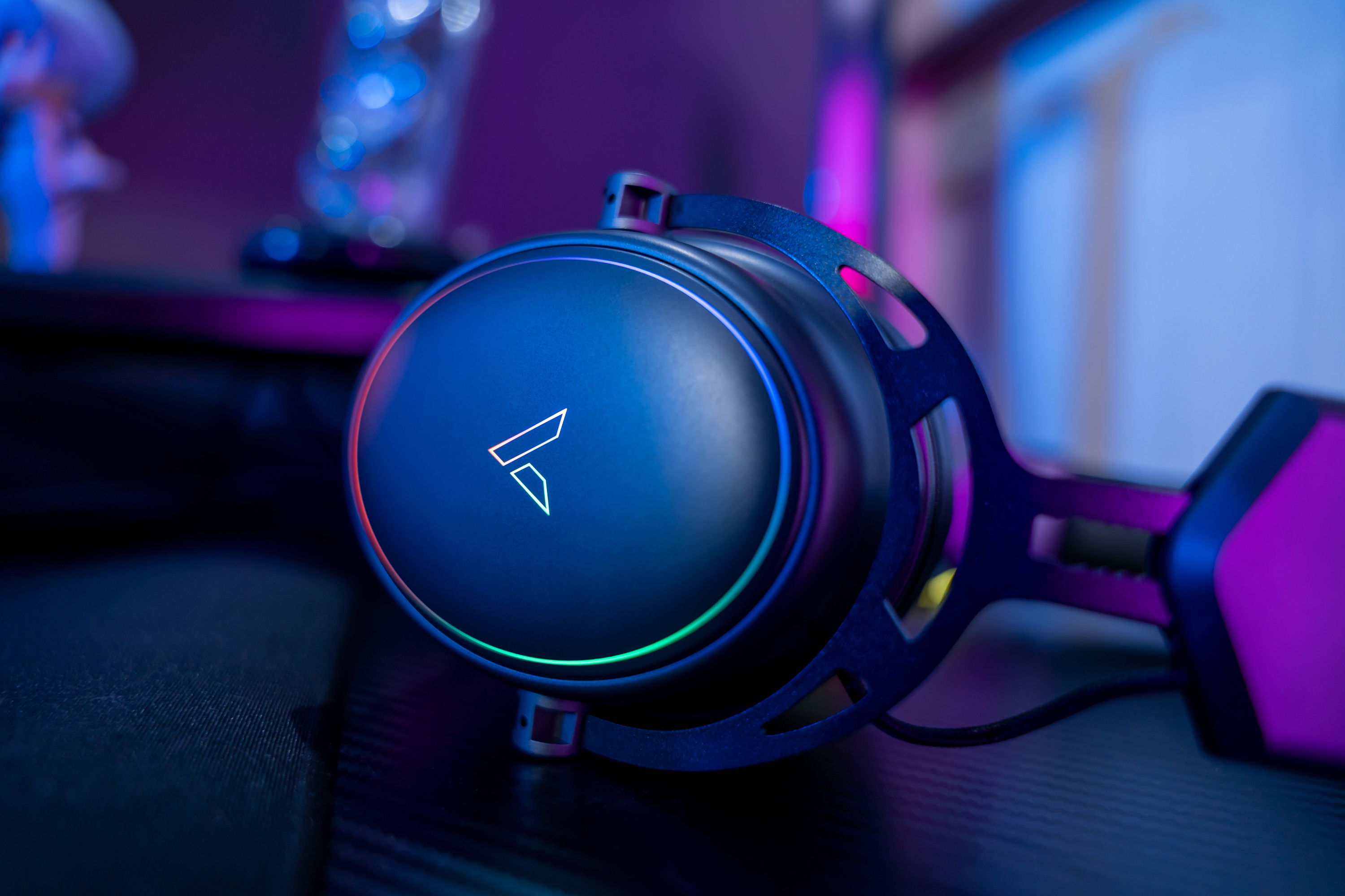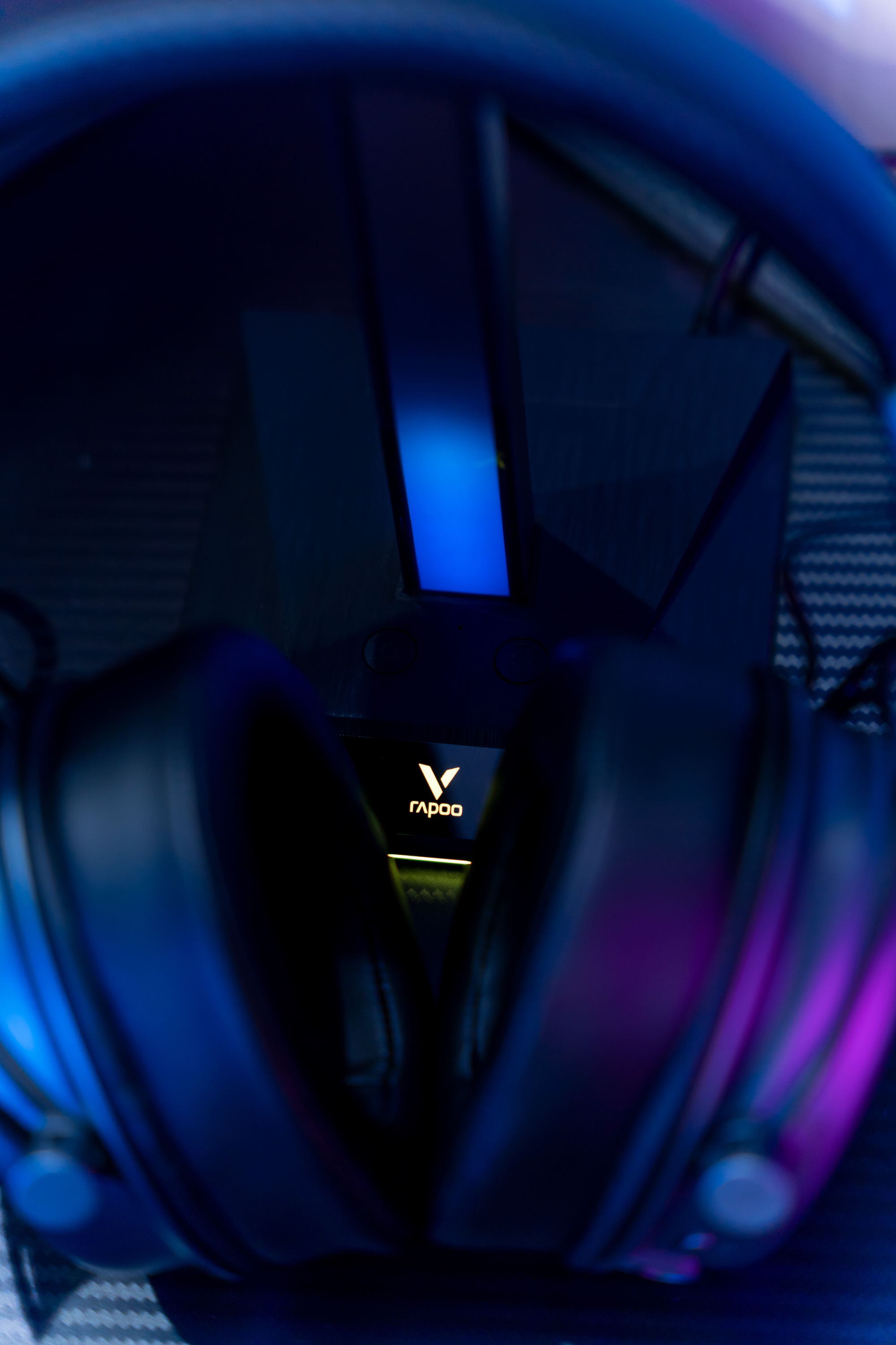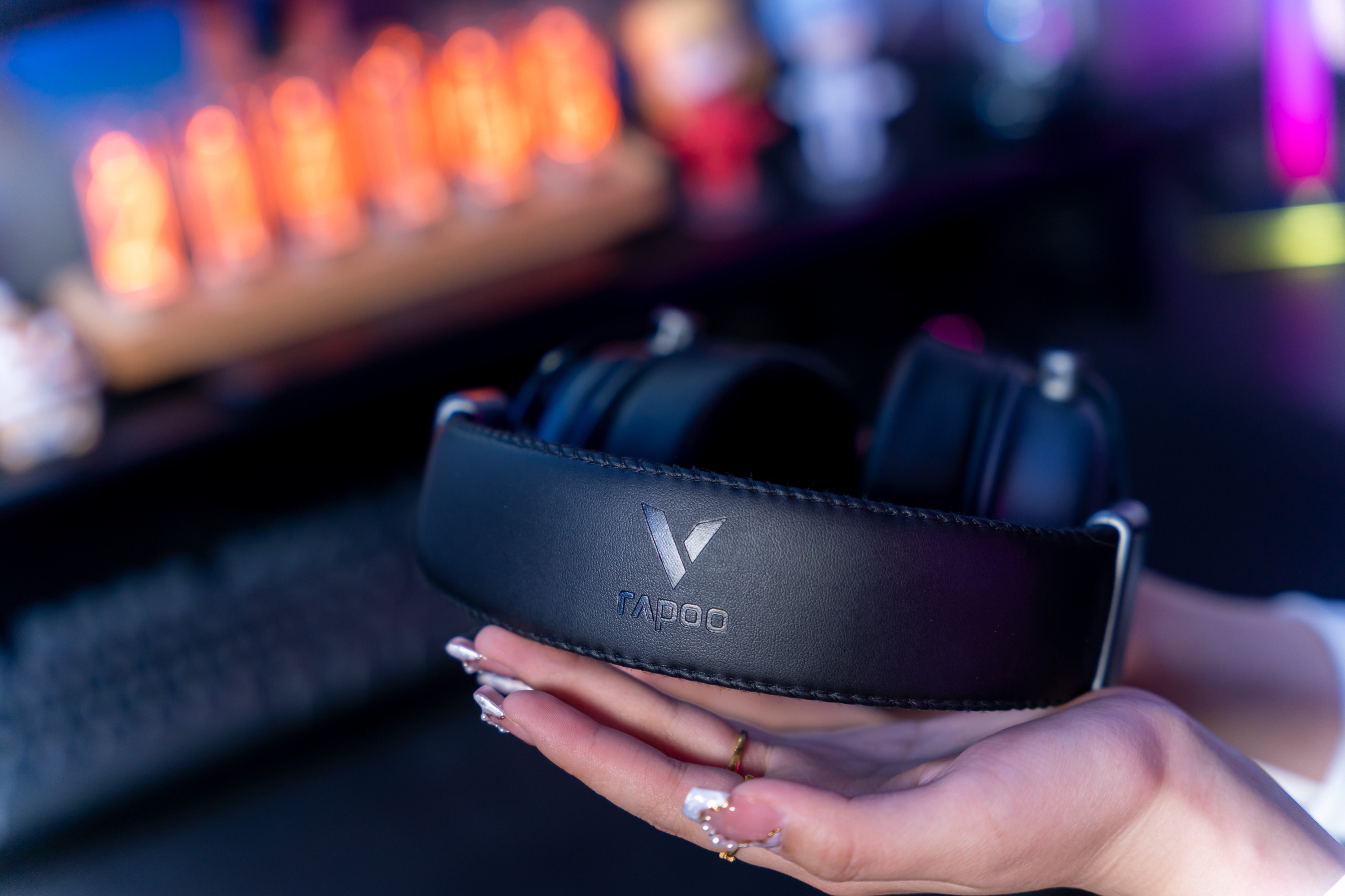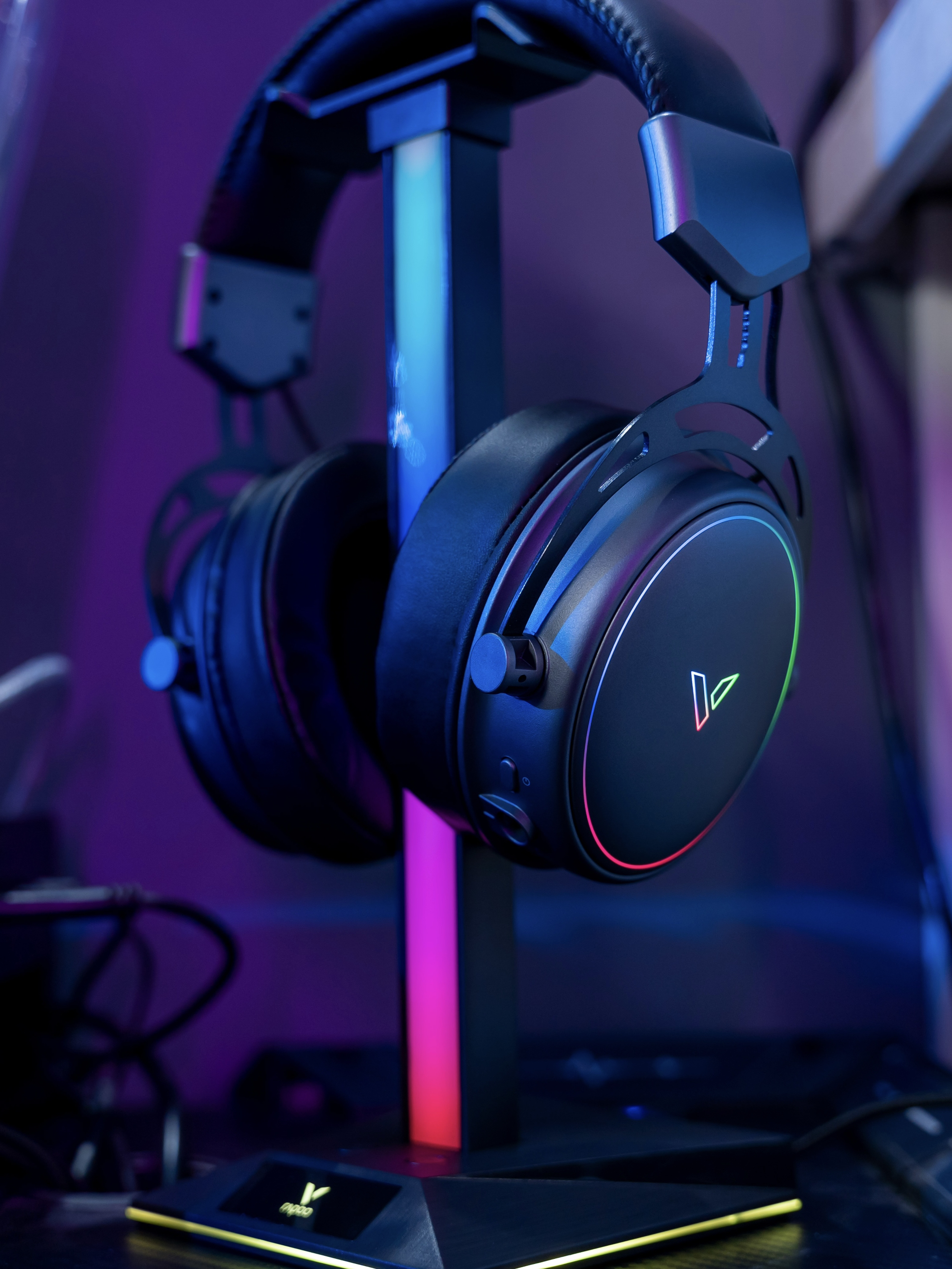 包耳式的蛋白皮耳罩特别柔软,将压力均匀分散,就算长时间佩戴的舒适度也非常不错。结合伸缩可调的金属头梁,可以适合不同头围玩家佩戴。耳机外壳上还加入了电竞风满满的RGB光环,搭配雷柏自家VH10RGB耳机支架的拾音光柱,10种拾音光效与17种LOGO氛围灯光,即便不使用时放在桌面都是超高颜值的桌搭装饰。