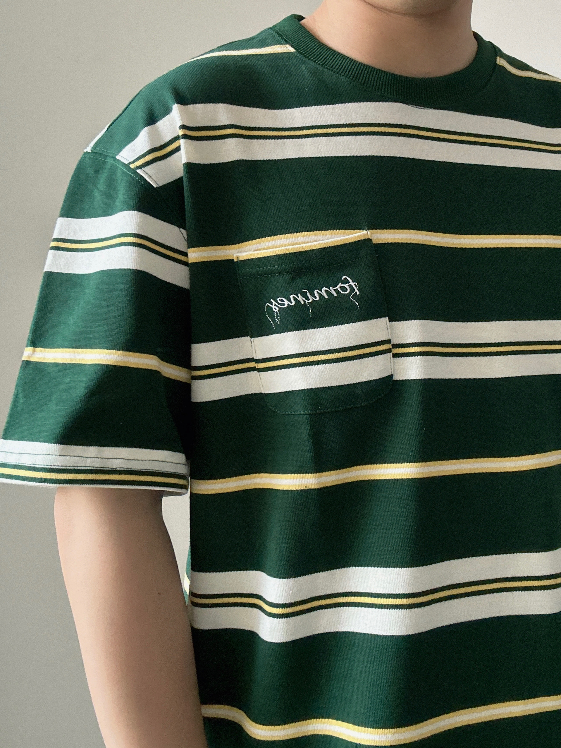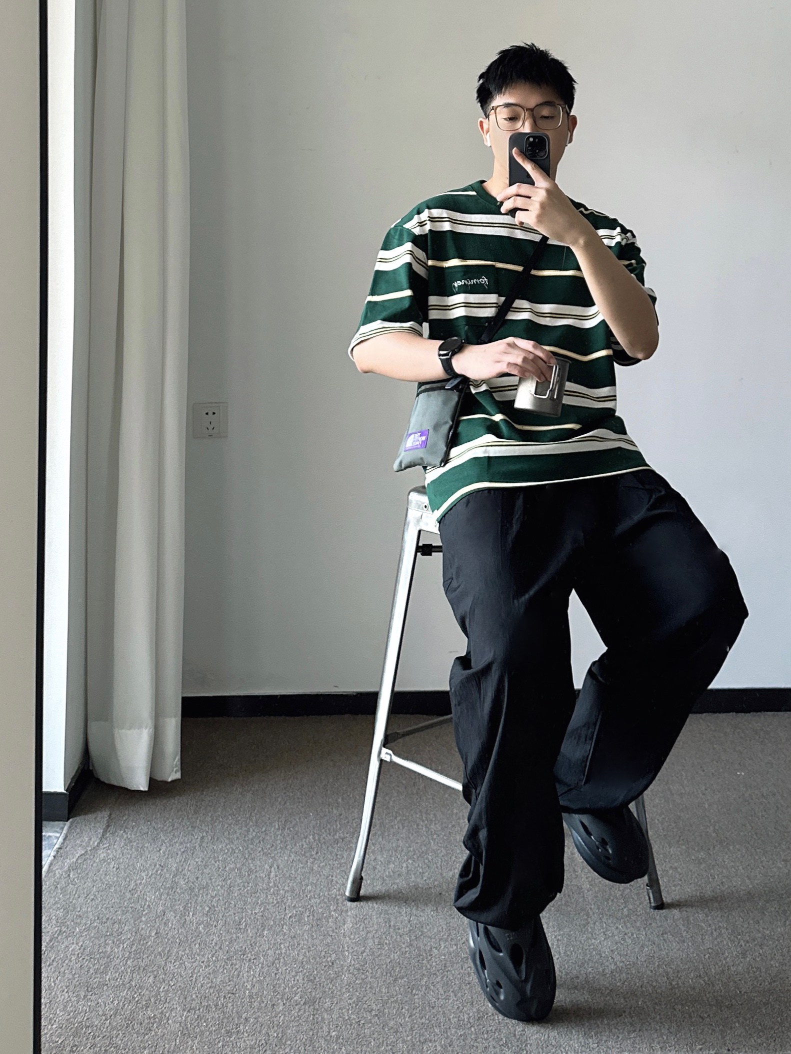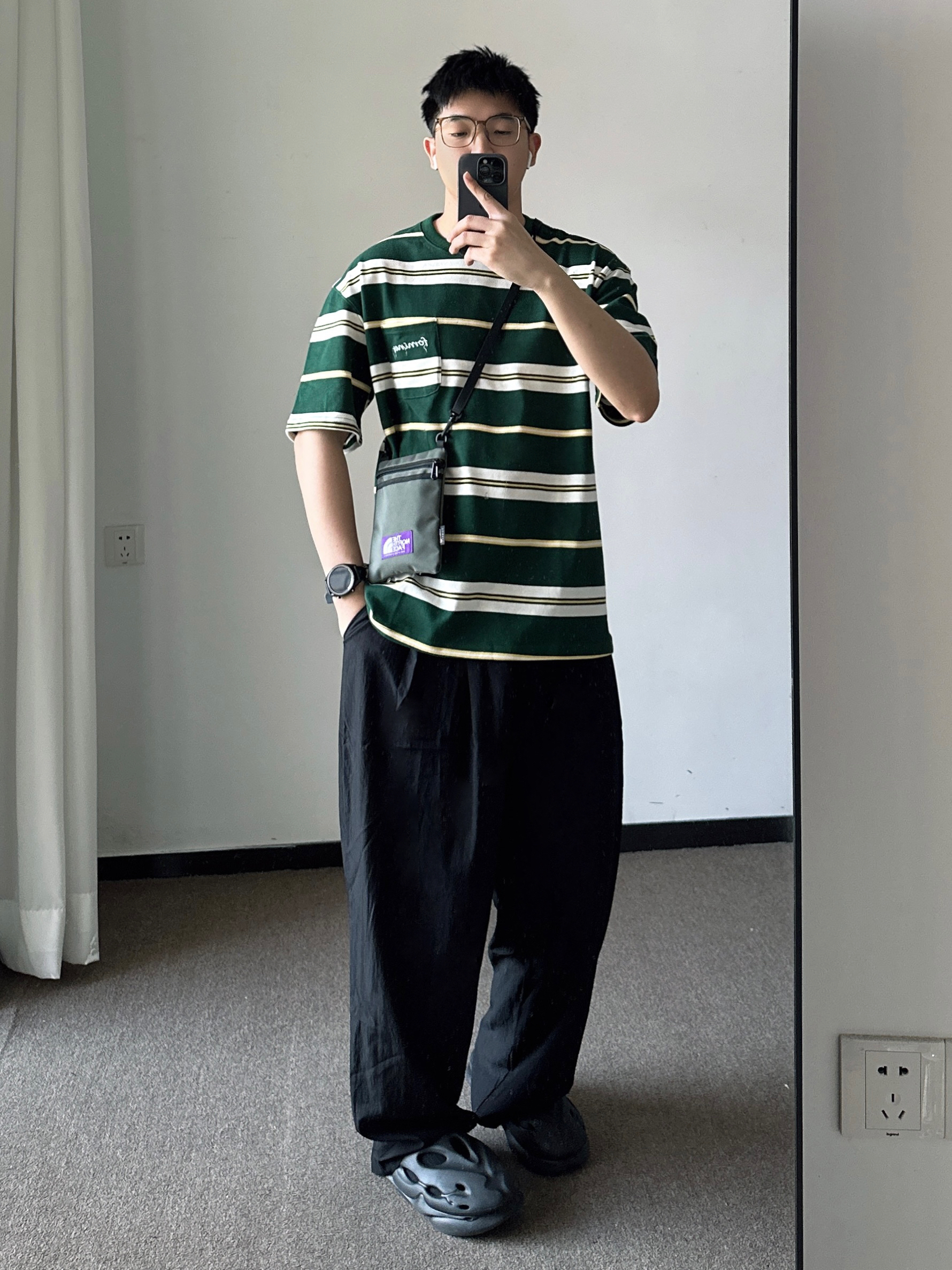 素人也能好看系列~ 174cm/65kg 🧥- 复古绿条纹,搭配乳白和亮黄,条纹经典易搭,少年感max! 👖- 夏日清凉绿,宽松、轻薄、廓形。注意裤口比较宽大的。 👟- 必须黑武士洞洞鞋,穿上就出门!
