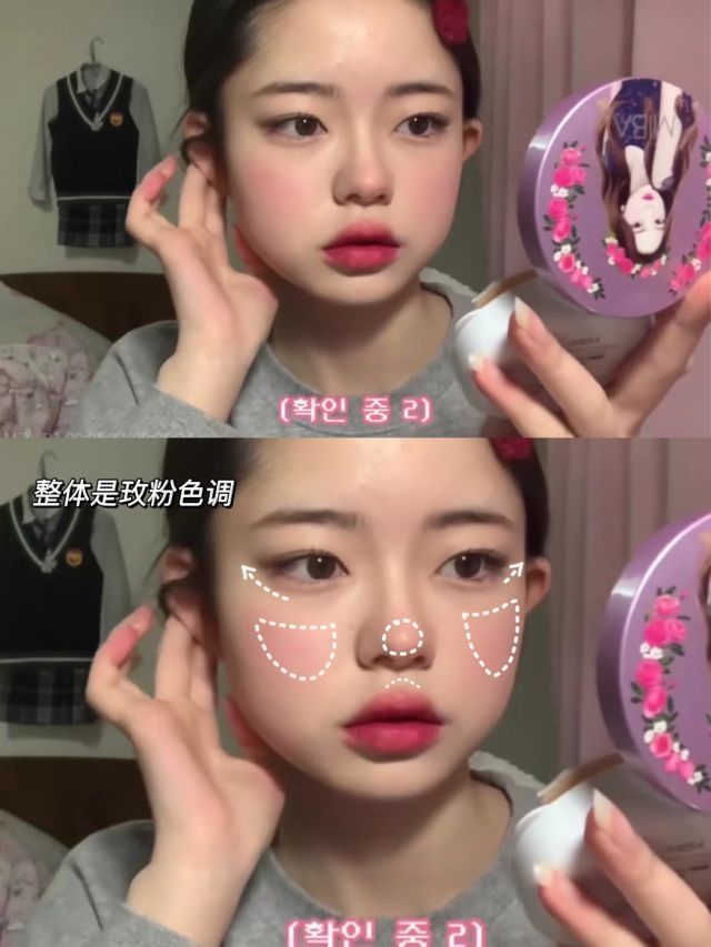 前几天看到图4这个mm的妆容好心动!赶紧学习了一下get了几个小技巧!轻松变韩妹! ·底妆白皙服帖,没有瑕疵 ·眉毛棕色,眼妆注重眼尾部分,眼影涂在双眼皮褶皱内眼尾上扬,眼线短粗上扬,卧蚕明显 ·玫粉色调腮红大面积涂,鼻头打⭕ ·口红也选玫粉玫红高饱和度的颜色,上唇唇峰处晕染出去,画嘟嘟唇 ➰用到的产品 ·粉底:嘉利玛虾青素粉底液 水润服帖,遮瑕度也ok,持妆能力敲赞赞!出去玩了一整天还是白嫩的!...