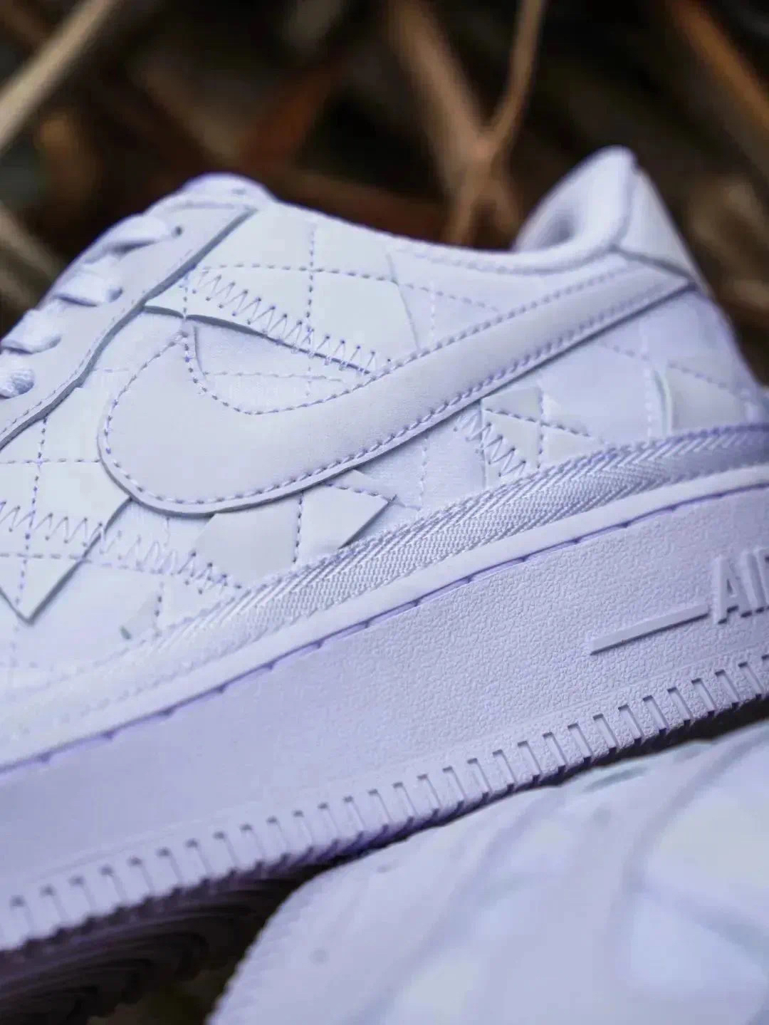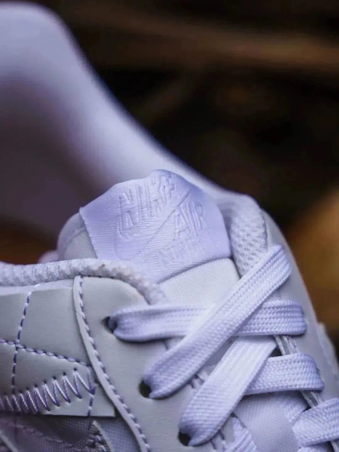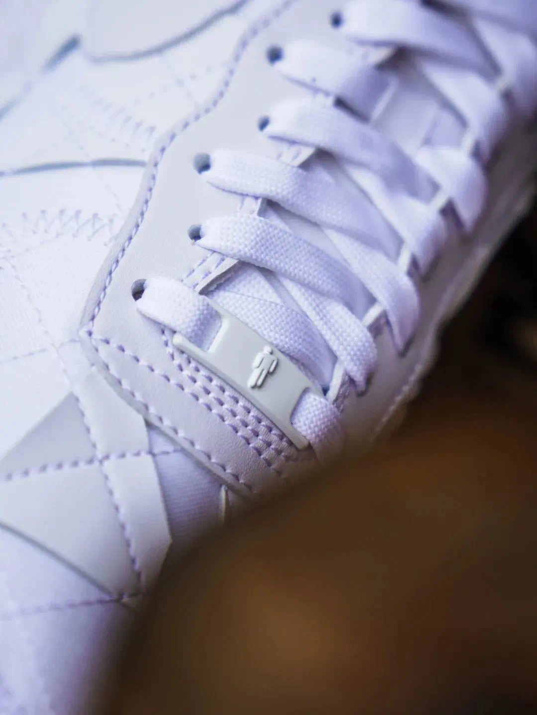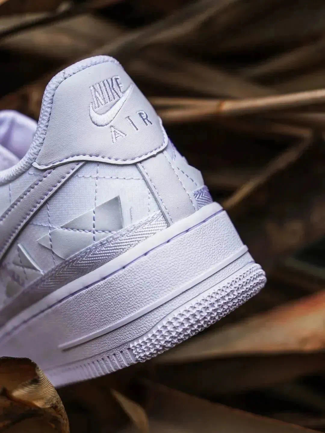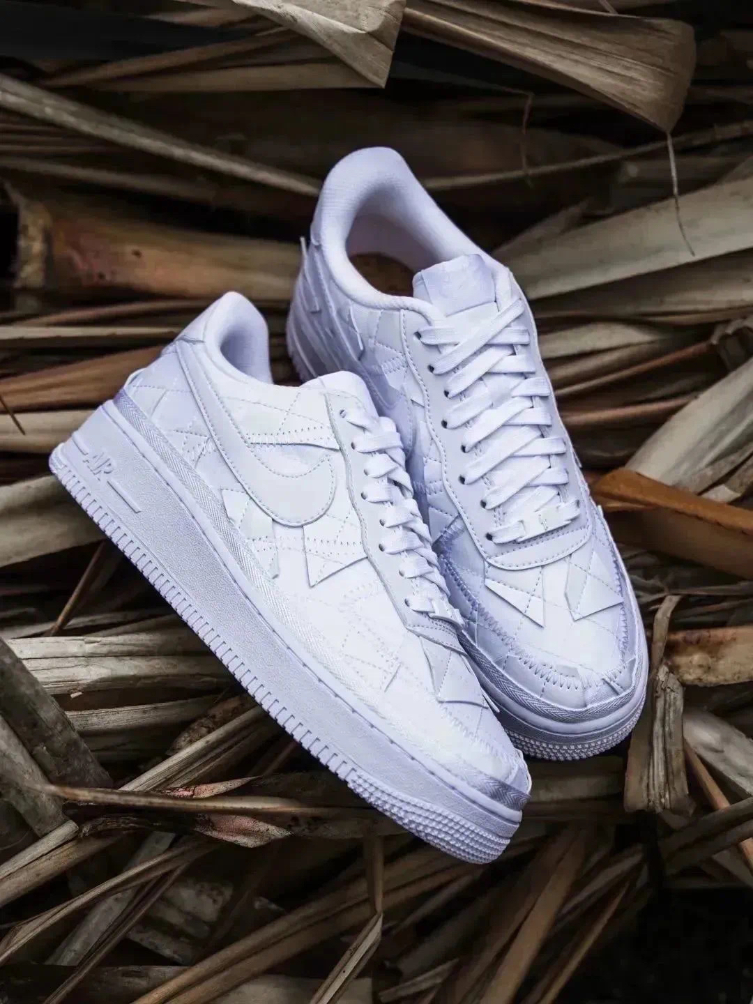 全新的Billie Eilish × Nike AF1整体以纯白色示人,鞋身以织物为底,在鞋面带有众多不规则几何贴片。营造出独特的视觉感受。 鞋面采用了独特的菱形缝线以及不规则皮革设计,为鞋款带来独特的层次感。 此外鞋带顶端的标签上也带有碧梨标志性火柴人Logo,鞋垫也采用软木塞图案设计。