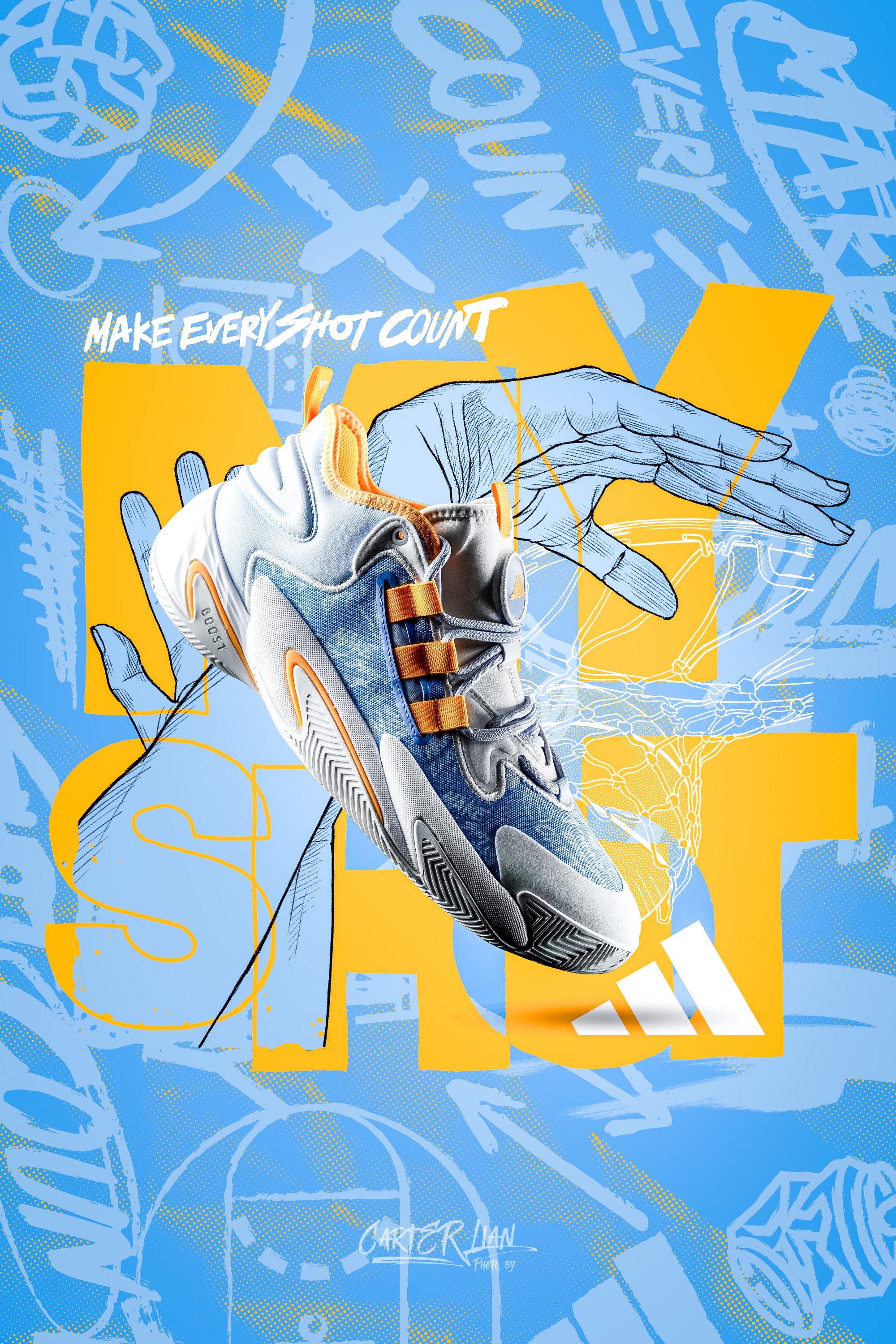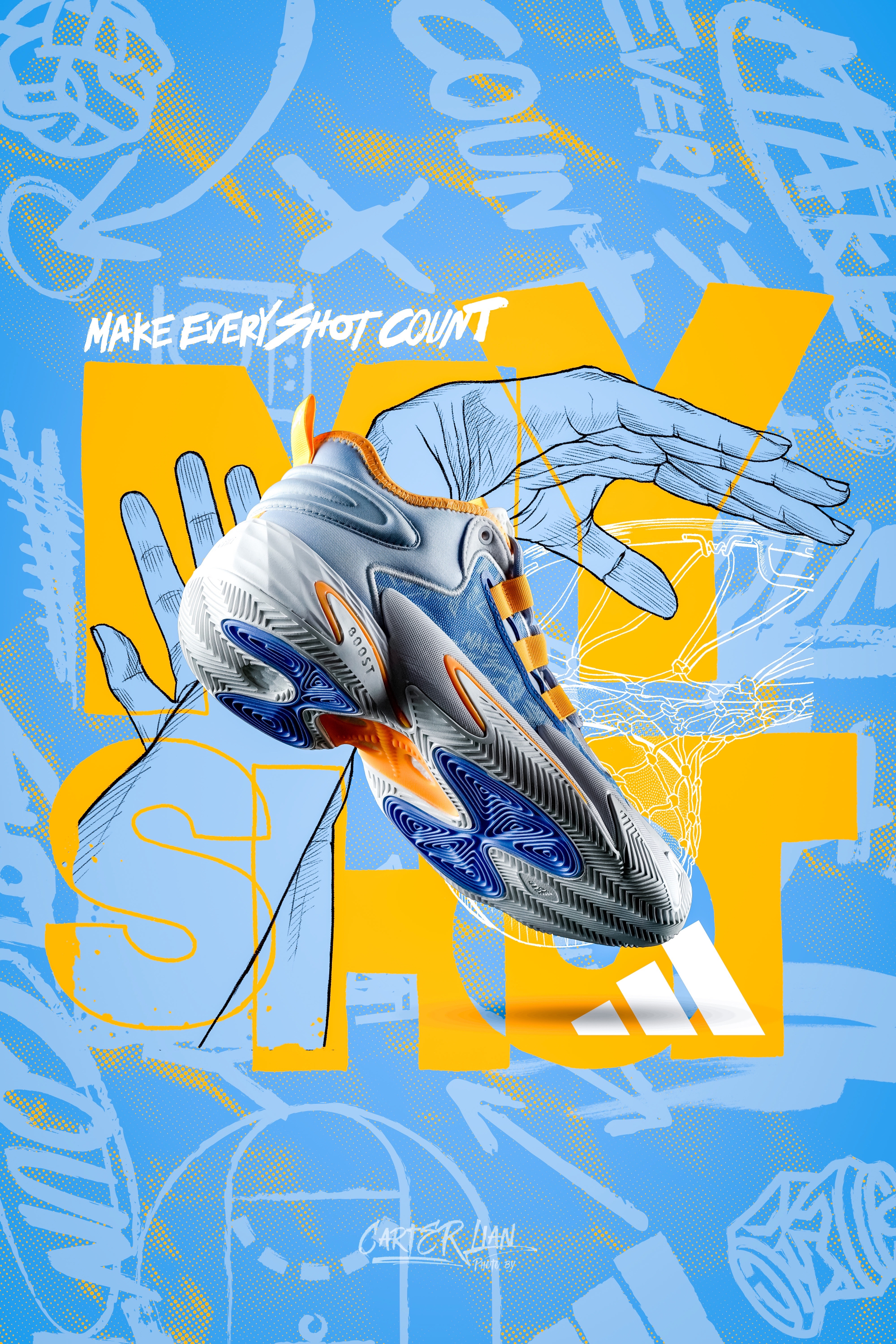 之前分享过MY SHOT系列的select 的白绿配色,这次分享这双BYW。 整体细节👀:整体可以说延续了整个MY SHOT系列的风格,鞋面涂鸦手绘的图案特别加分,蓝黄白的配色非常的夏日的感觉。 鞋面是双层织物的网面材质搭配大面积的热压去补强,鞋面强度不错,中底采用了LightStrike+Boost的缓震组合,这套缓震也不输一些签名鞋款了,外底是类似人字纹的橡胶大底,抓地稳,抗扭上是阿迪招牌...