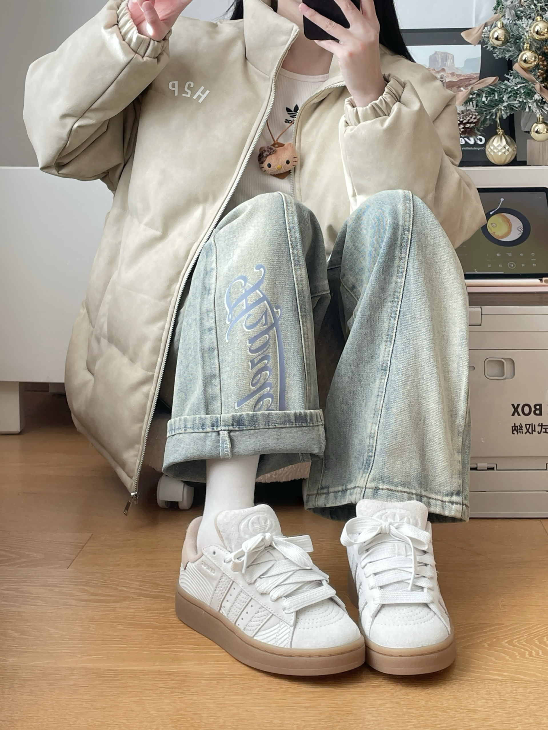 这套奶杏色牛仔裤也太🆒了吧‼️ - 搭配一件白色的美式短袖上身 裤子方面是奶杏色牛仔裤 版型宽松直筒 很显腿型 布料也很舒适 百搭款 / 一套搭配下来 很适合春夏出街穿搭