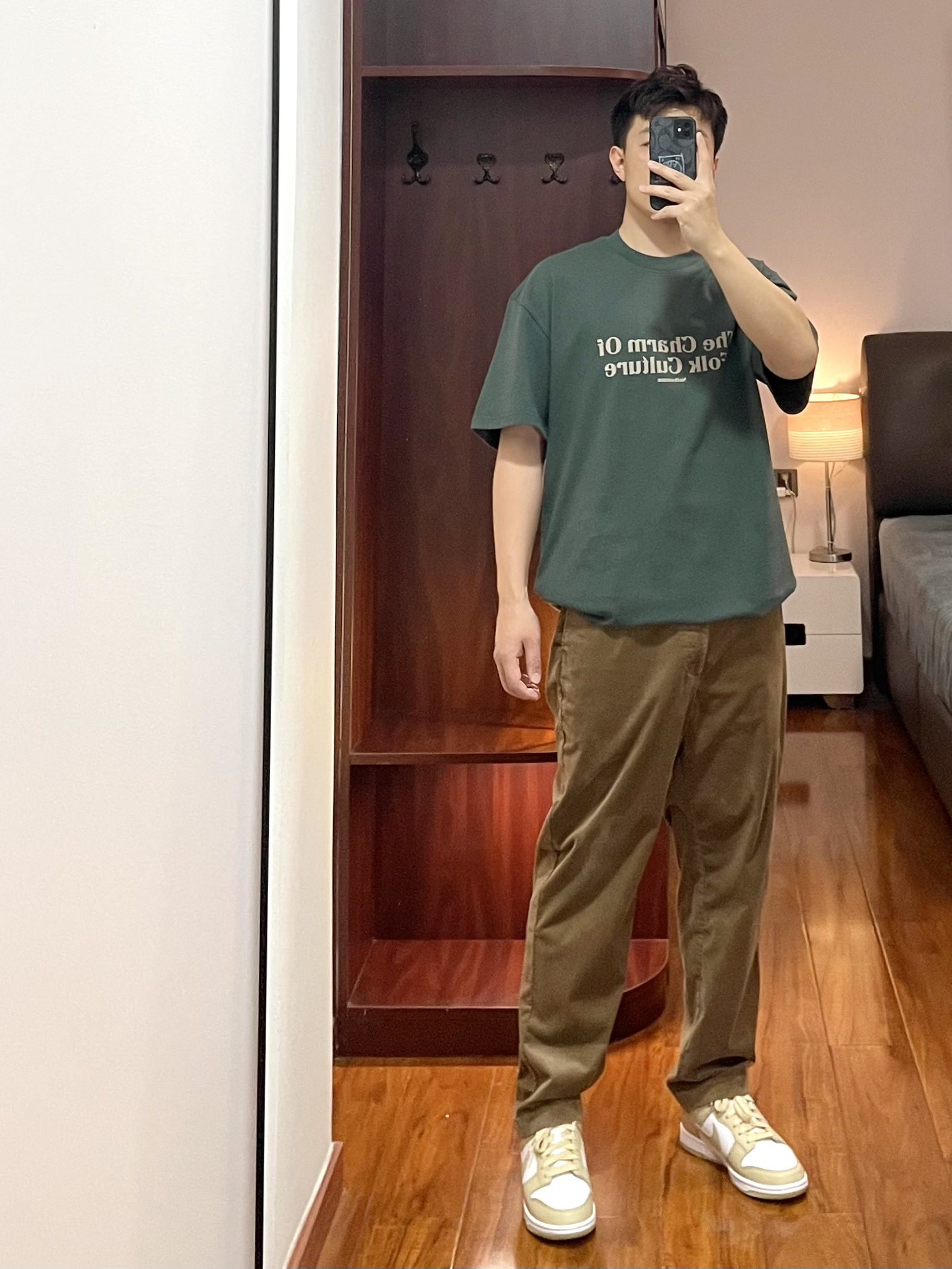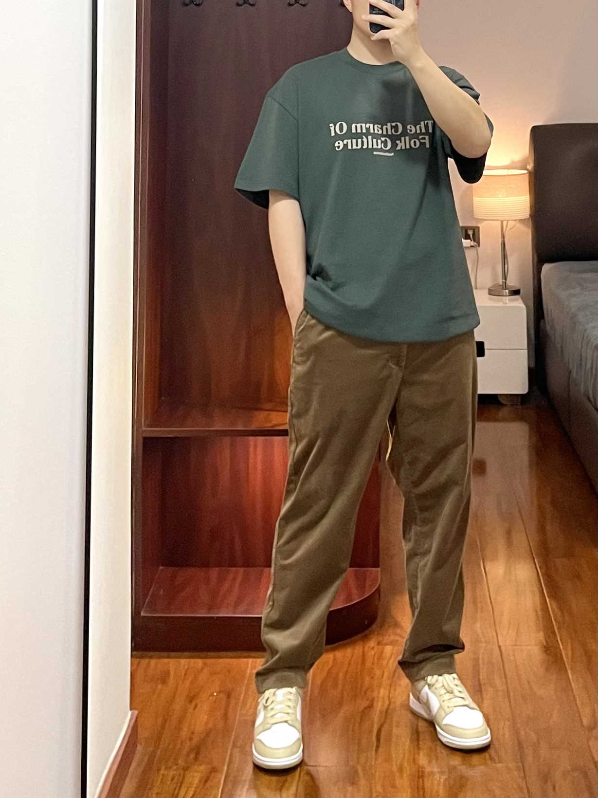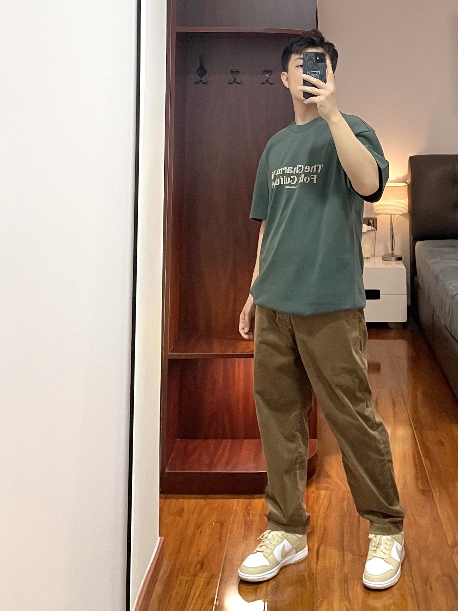 170cm/67kg 分享一个普通人的穿搭 - 👕:NOTHOMME T恤-M 美式风格的短袖T恤,字母印花好看 这个绿色上身很休闲,版型宽松舒适 👖:优衣库 休闲裤 灯芯绒休闲裤,面料适中春夏穿合适 裤型直筒宽松,穿着比较简单。 👟:Nike dunk 浅色系的dunk。