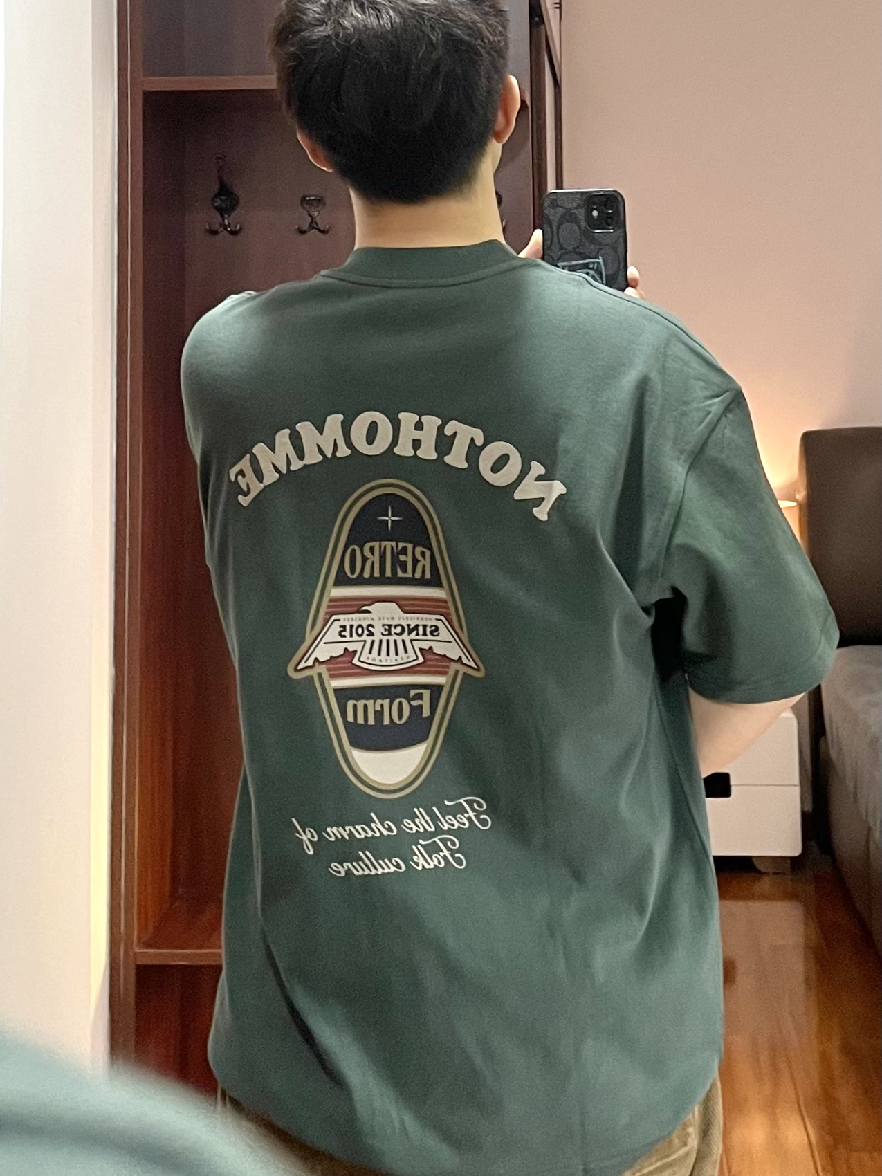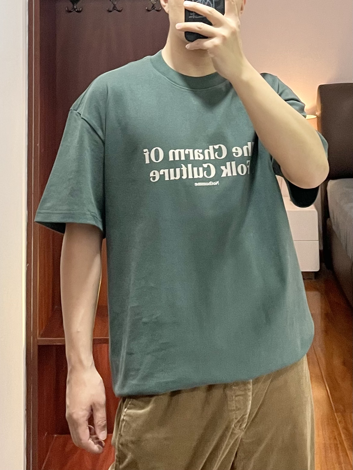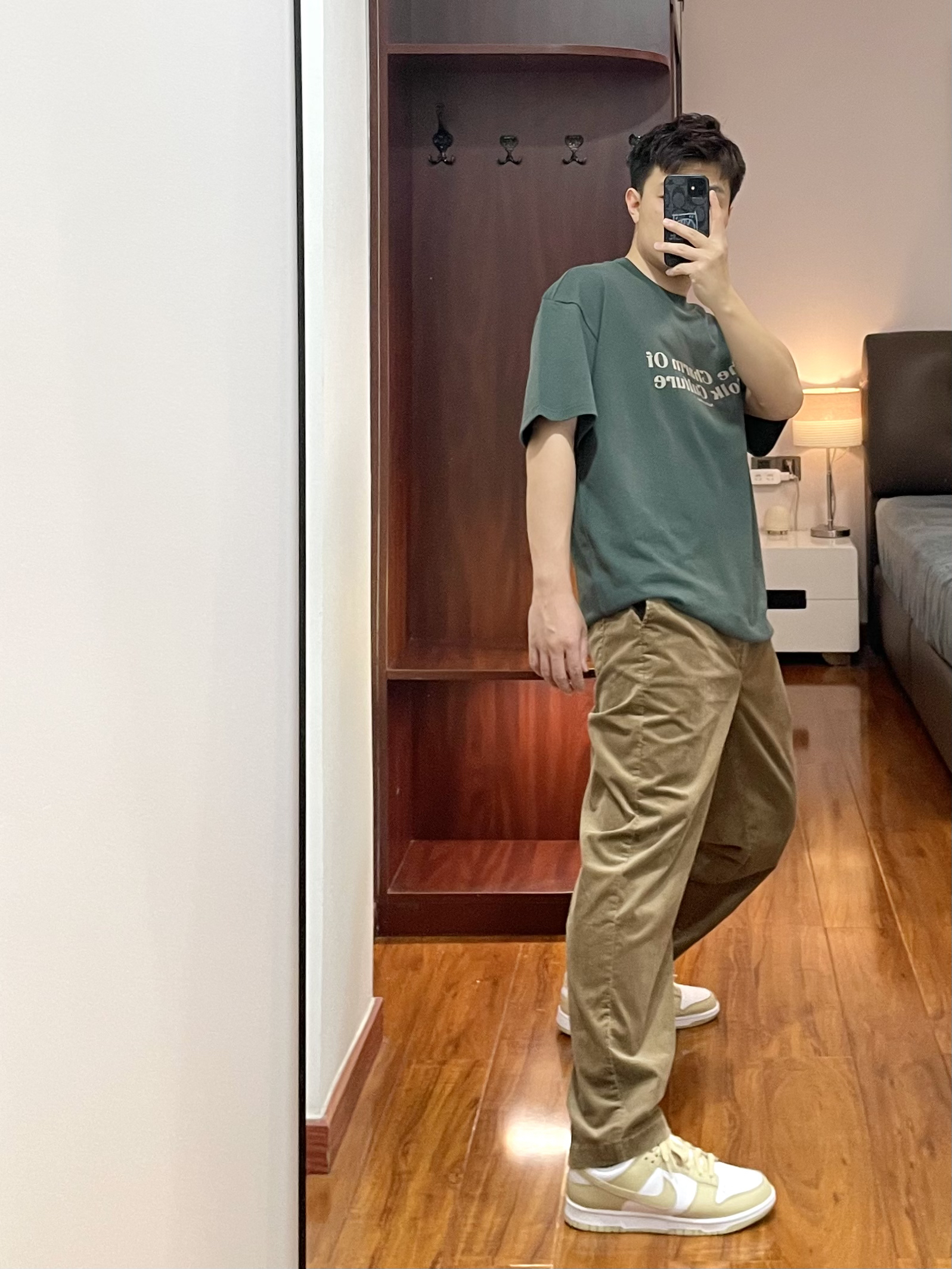 170cm/67kg 分享一个普通人的穿搭 - 👕:NOTHOMME T恤-M 美式风格的短袖T恤,字母印花好看 这个绿色上身很休闲,版型宽松舒适 👖:优衣库 休闲裤 灯芯绒休闲裤,面料适中春夏穿合适 裤型直筒宽松,穿着比较简单。 👟:Nike dunk 浅色系的dunk。