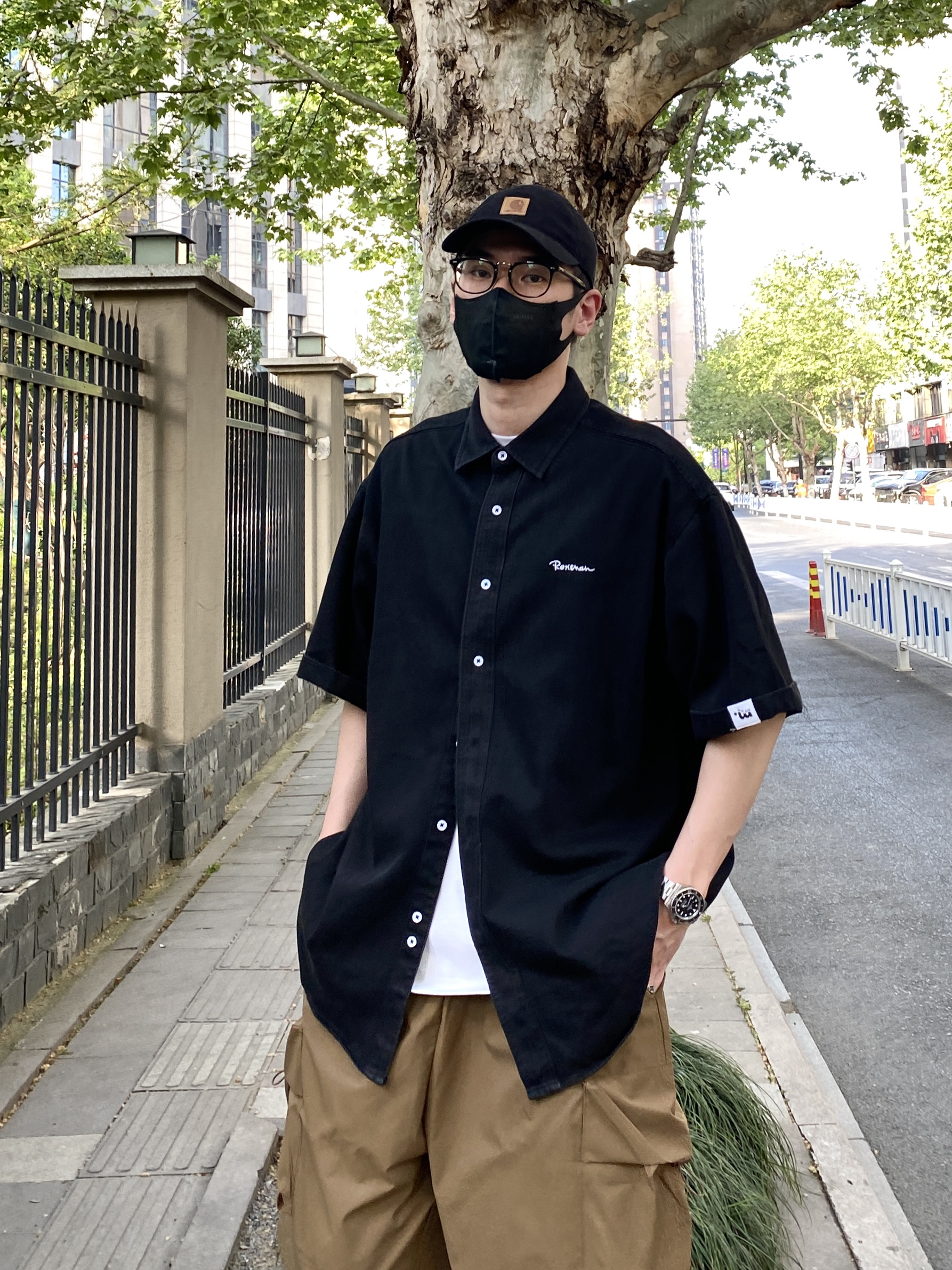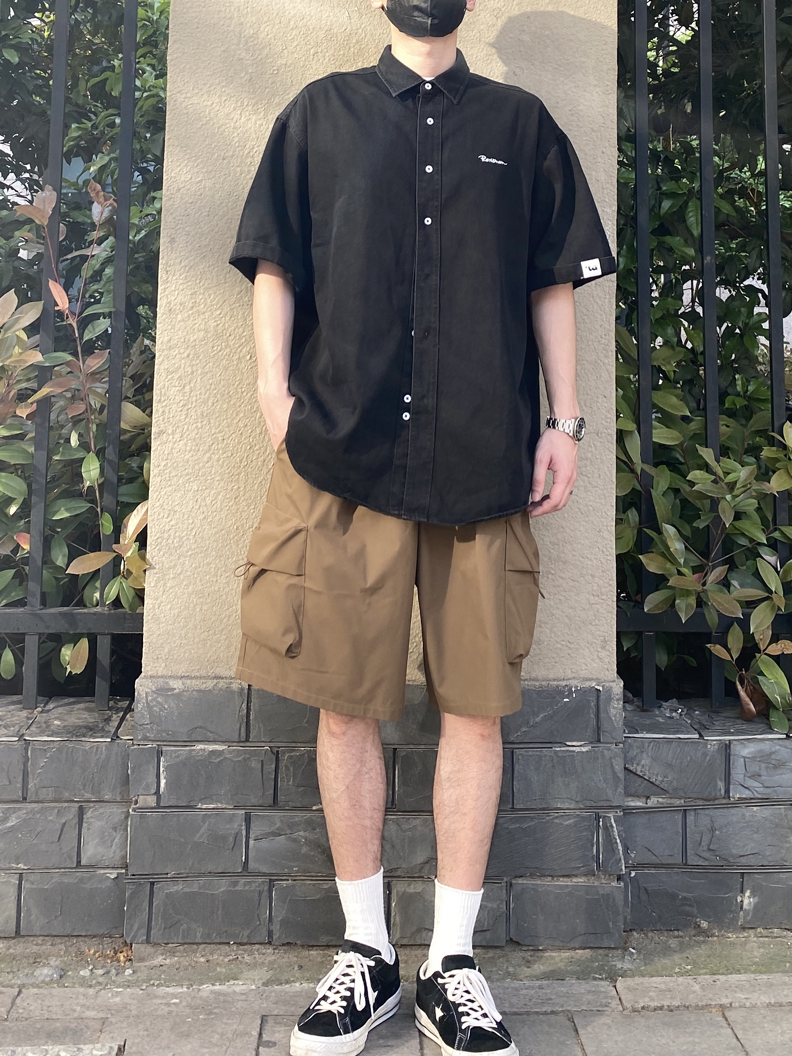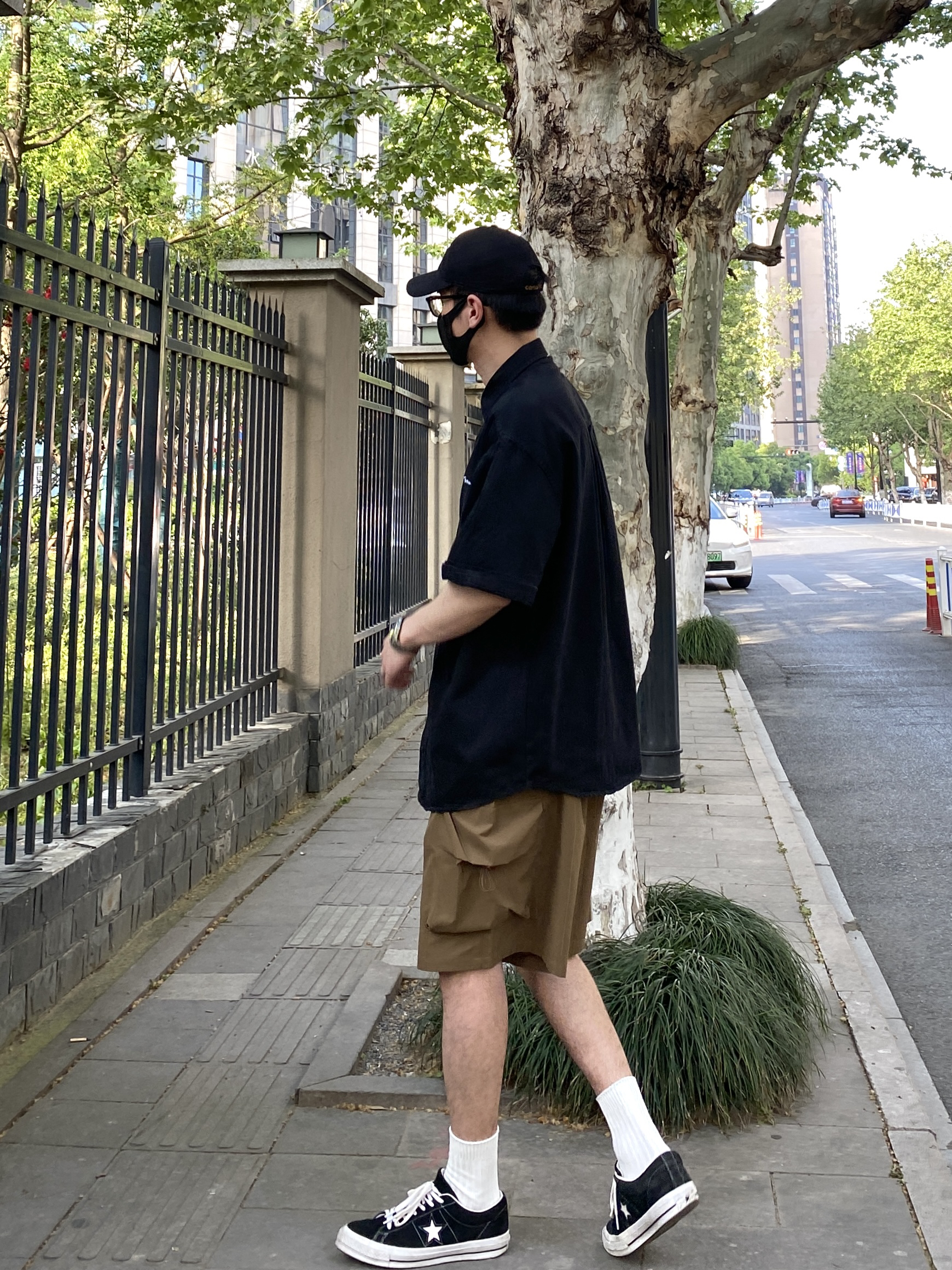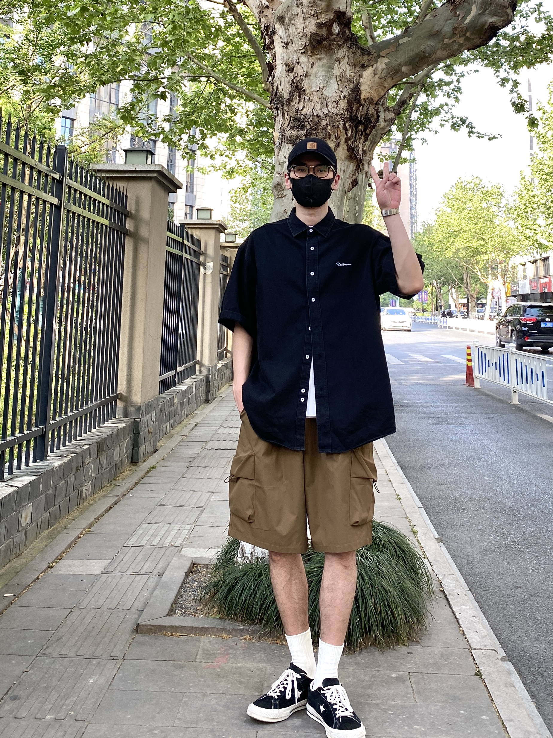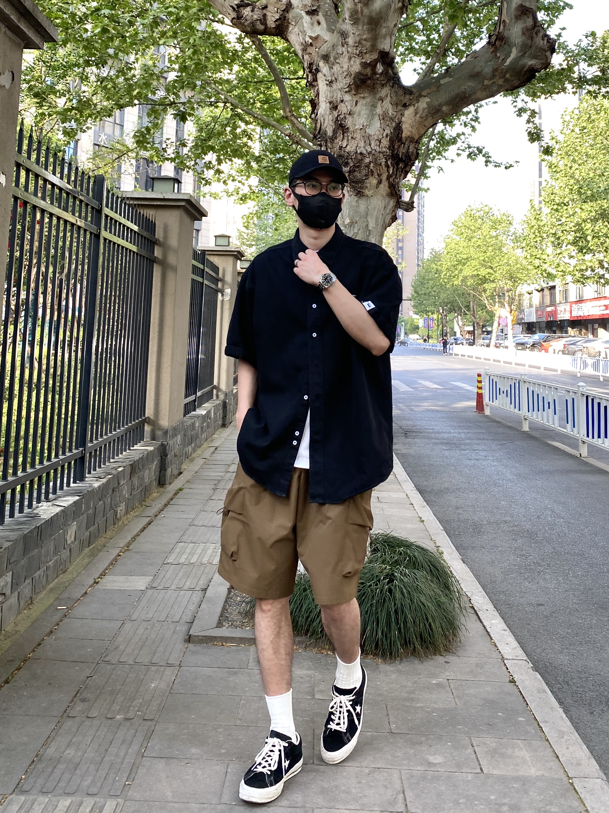 今天这套先用重磅小领口白T做打底,裤子选择咖啡色大口袋户外机能短裤,鞋子上脚经典百搭的匡威one star,接着套上黑色宽松阔版工装短袖衬衫,最后戴一顶卡哈特水洗棒球帽,OK,出门看看搭配效果吧! - 今日穿搭 衣服裤子:NICE LILI 鞋子:匡威one star