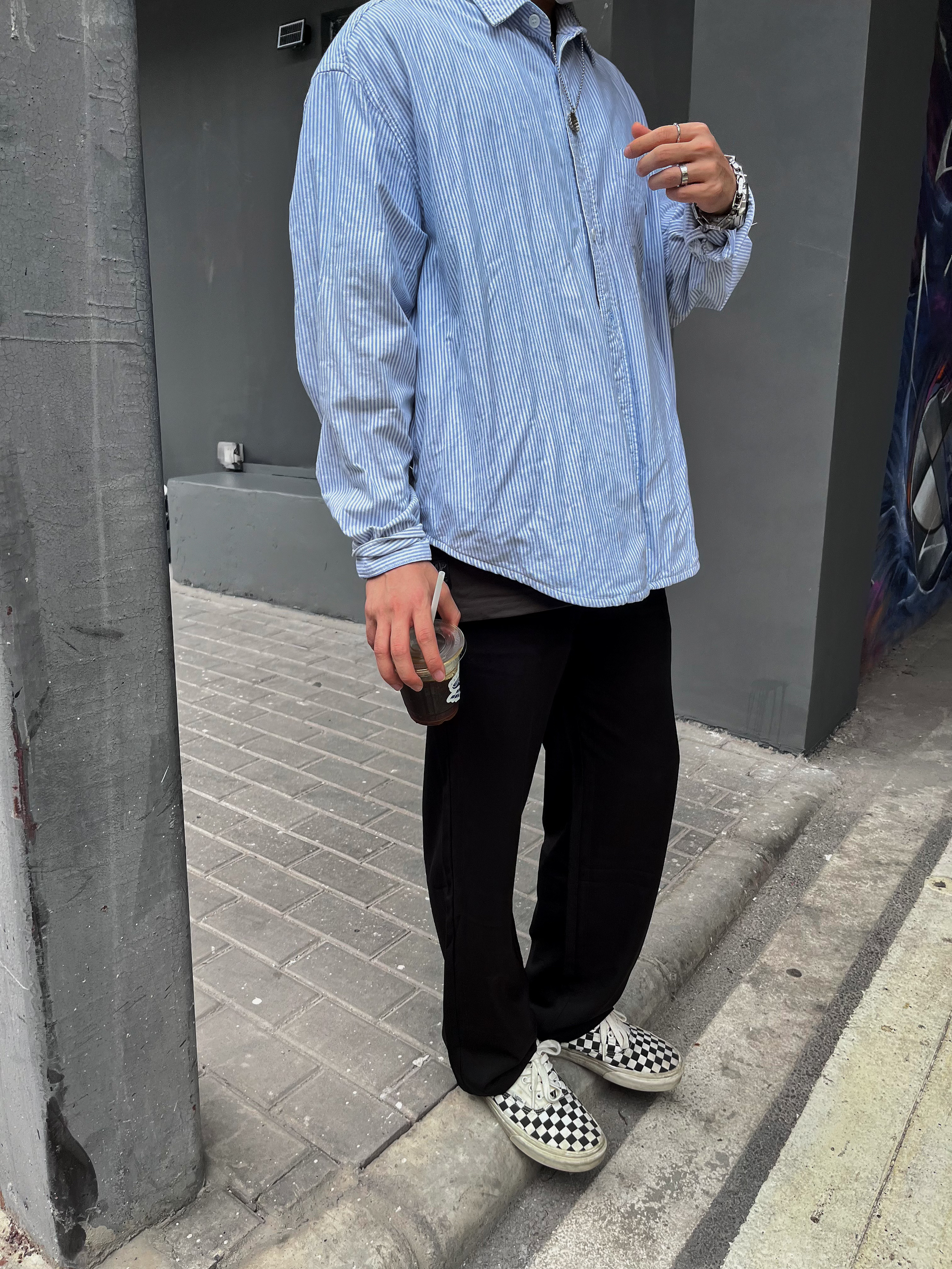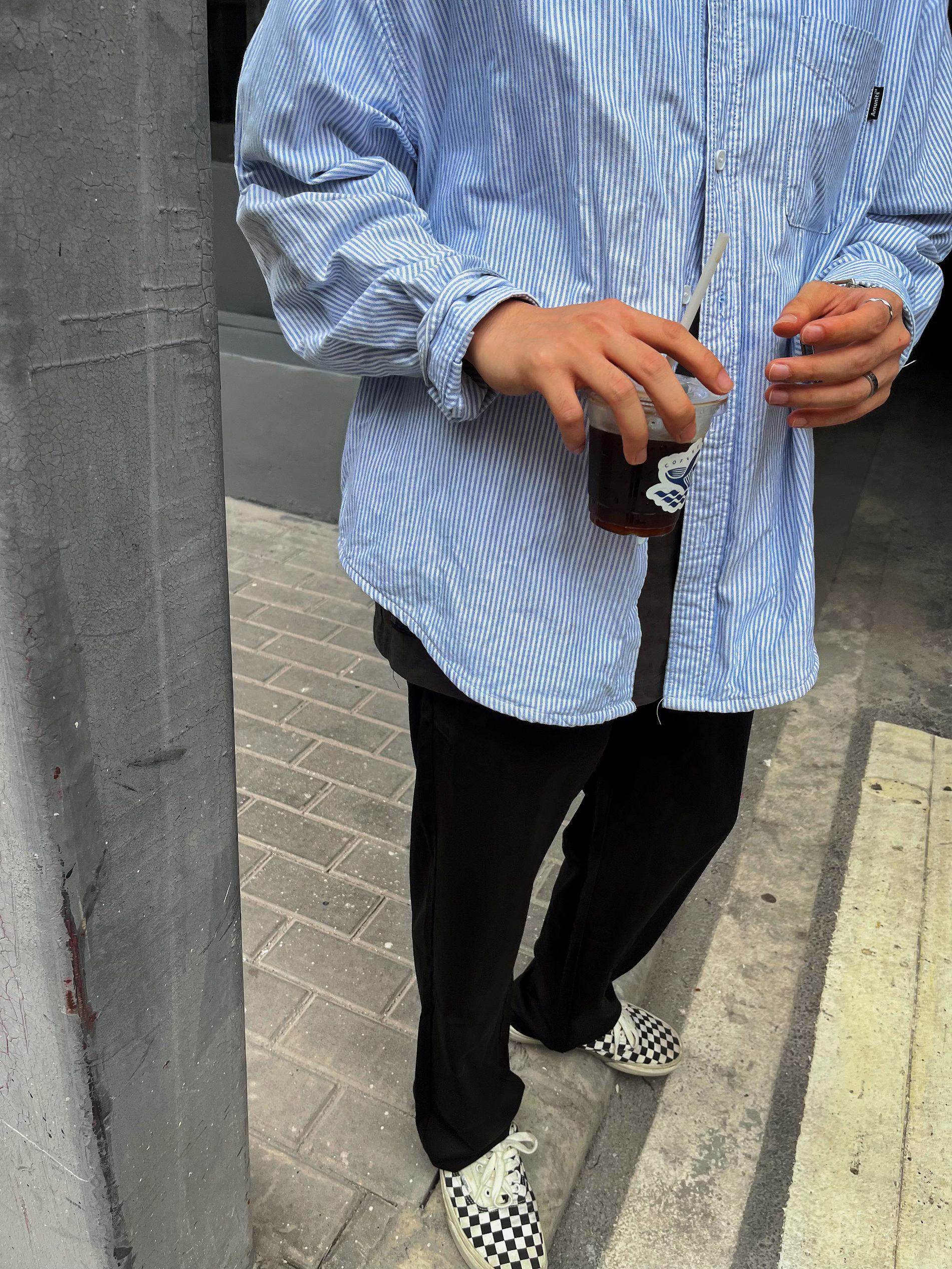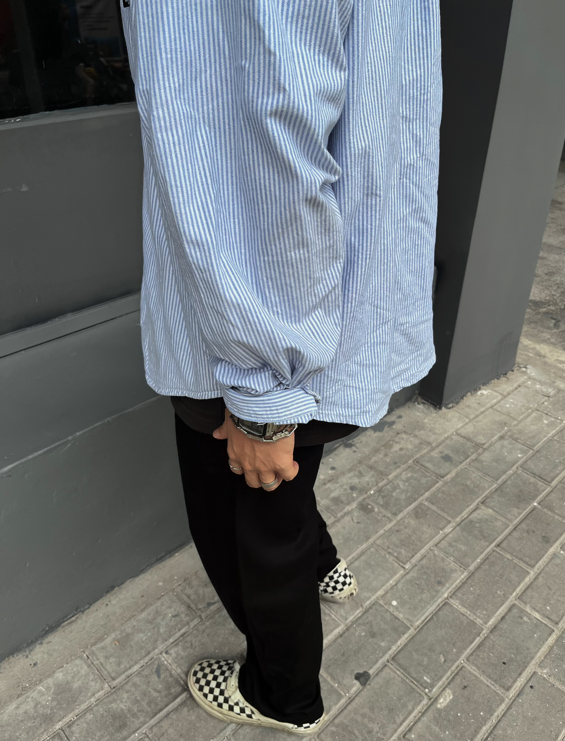 身高|体重:174 73 🧍♂️ 穿搭风格:cityboy 👔 上衣:BDLS无界条纹衬衫 👖 下装:KGK 👟 鞋子:VANS 🎒配饰:卡西欧小方块