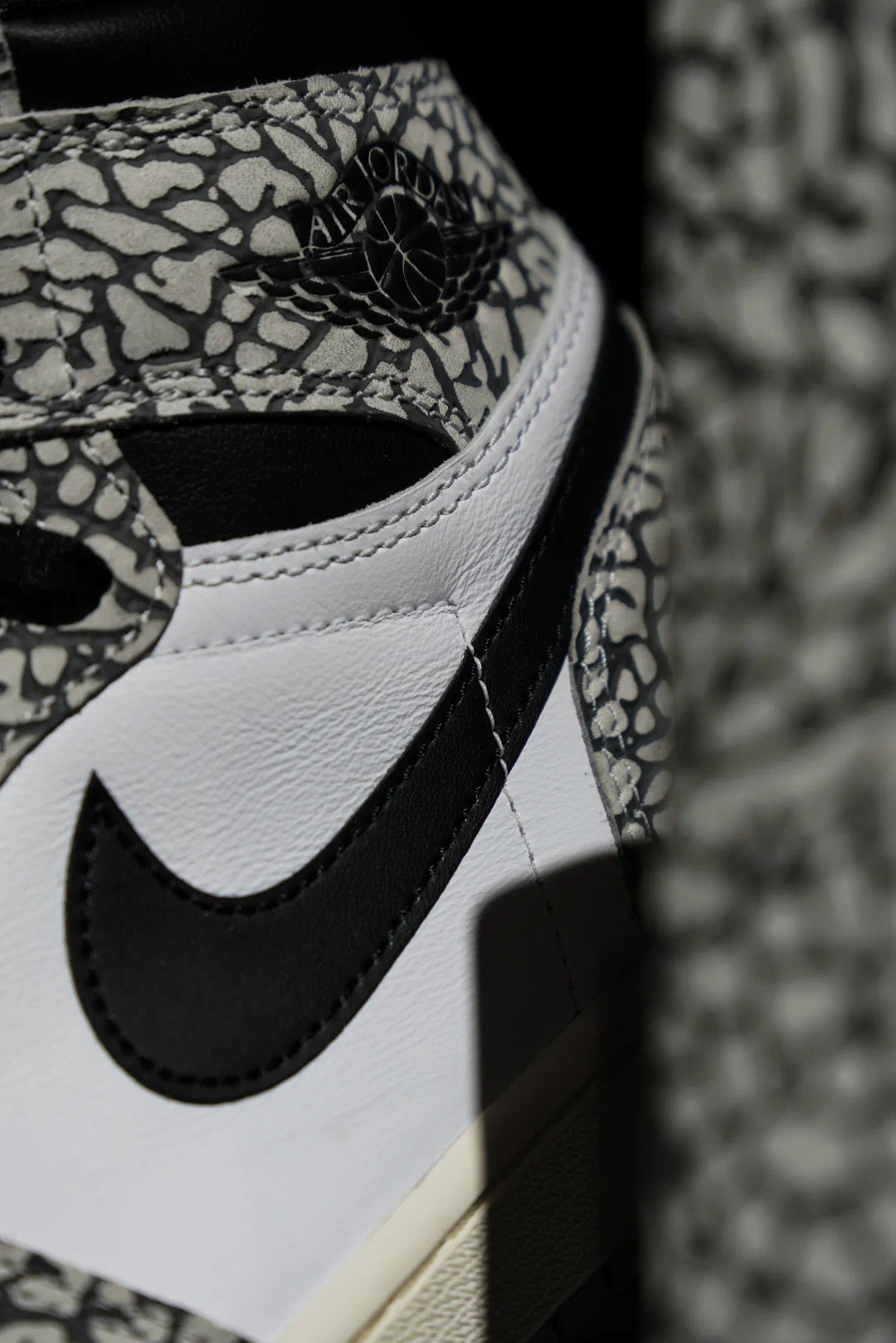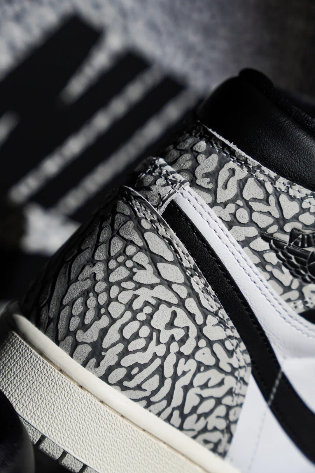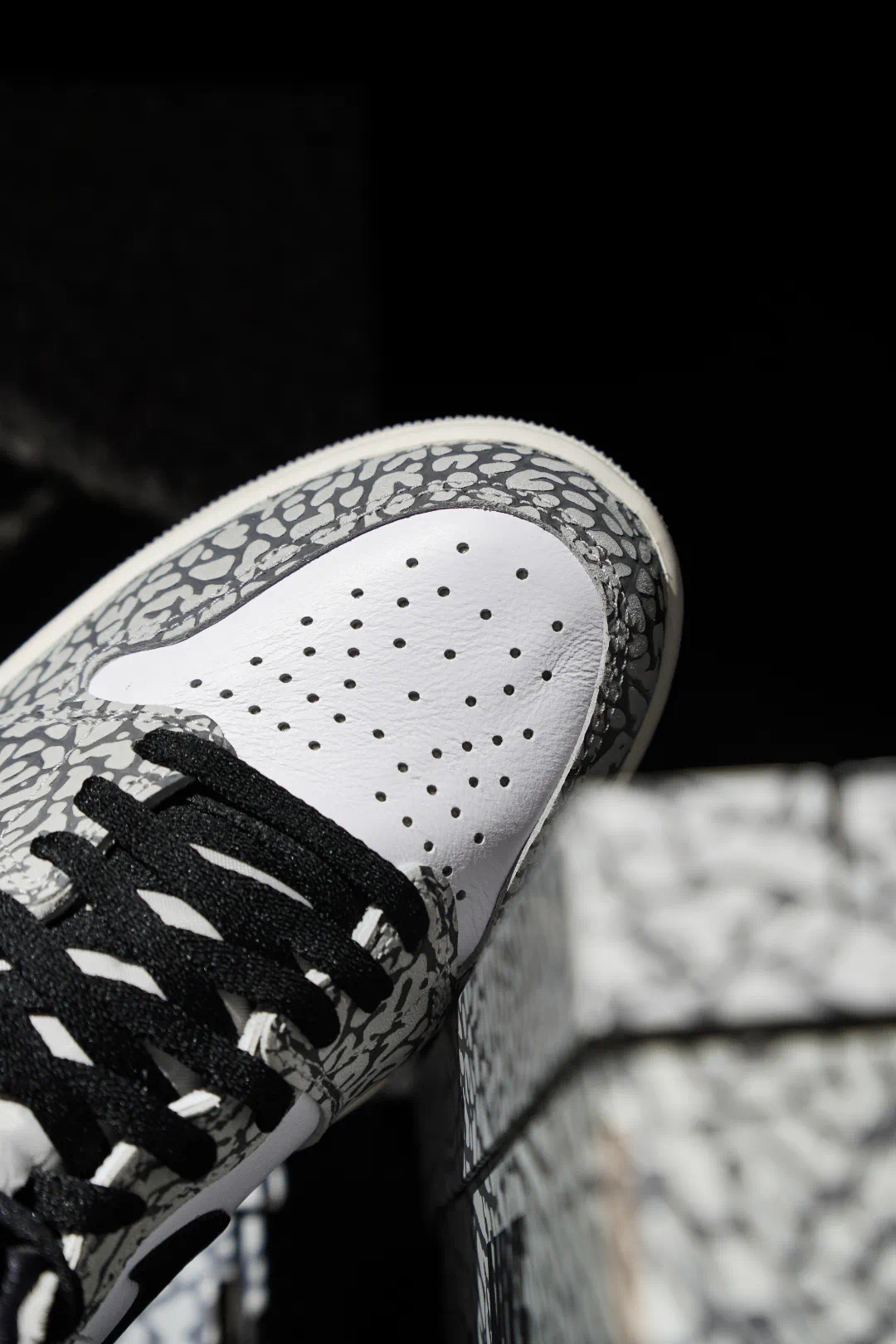 这款 Air Jordan 1 Retro High OG White Cement 使用了白色、灰色以及黑色进行呈现,带来十足经典感受。同时,这款鞋的鞋面上还加入了大面积爆裂纹元素,Air Jordan 系列对于爆裂纹如此大面积使用,还要追溯到 Air Jordan 3Lab5,而这双鞋在当时也受到了球鞋爱好者强烈的追捧。就连这款鞋的鞋盒也和最近随鞋款配色而改变的 Air Jordan 1 鞋盒...