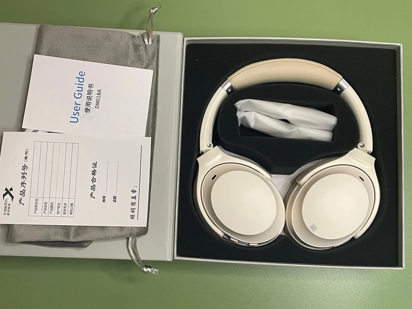 打开包装盒,可以看到耳机的本体,一根3.5音频线,充电线以及说明书,内部采用泡沫保护,在这个1比1的方正盒子里,合理的占用了每一寸空间。