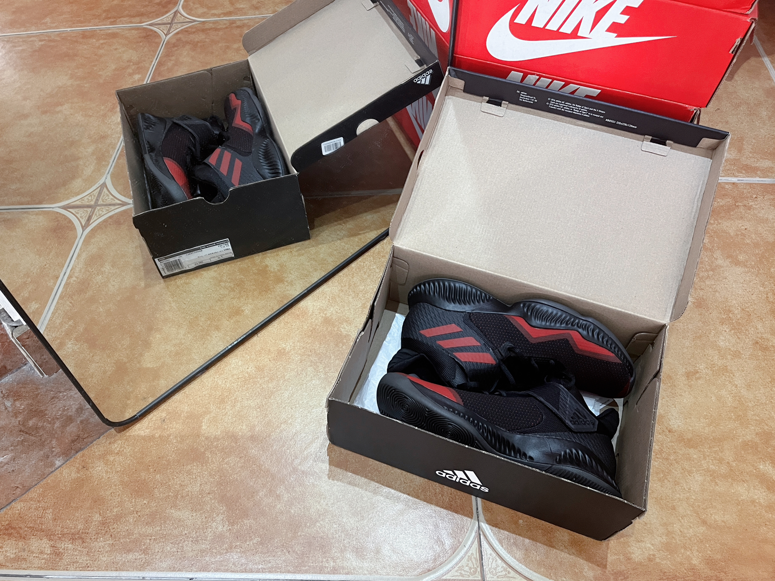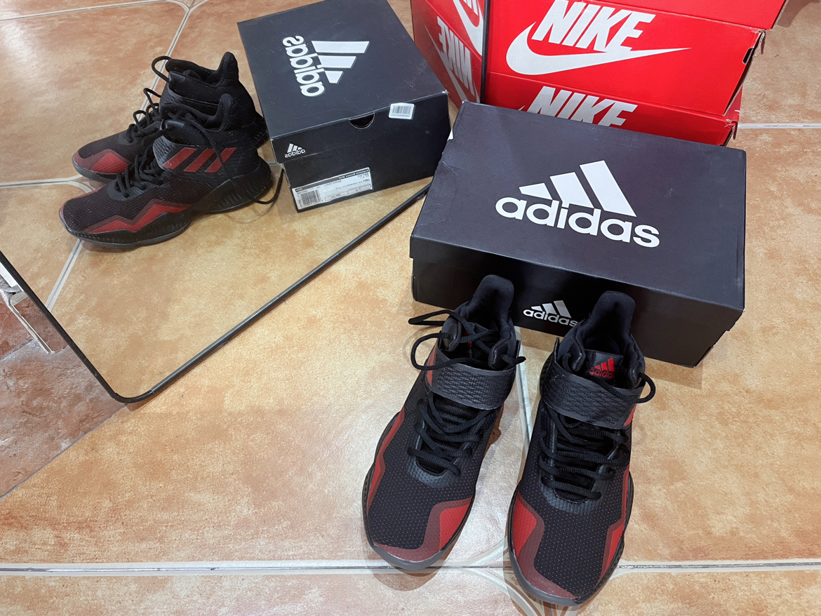 阿迪达斯 Explosive Bounce 2018黑红。讲道理的说,这个魔术贴版本,除了外观好看一点之外,都比不上普通版。魔术贴虽然有颜值,但是魔术贴长度不够,实战里容易崩开。我已经是细脚踝➕瘦脚了,如果是高脚背或者脚踝粗壮的兄弟千万别尝试。直接选普通版的低帮吧。